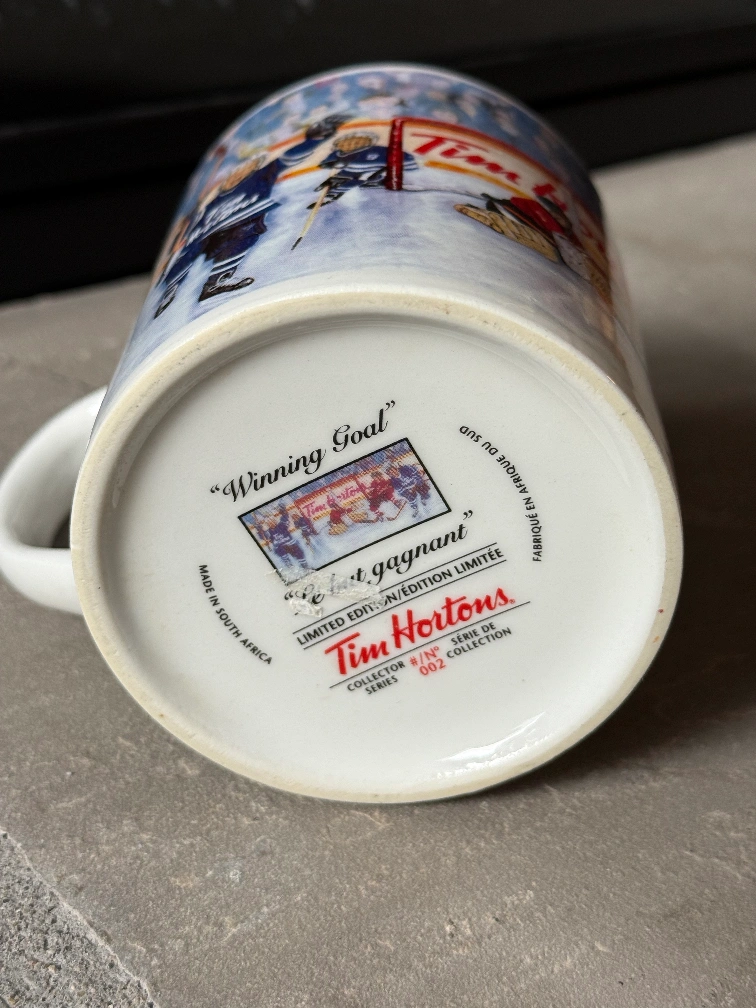 65Selling a Tim Hortons collector mug from the Winning Goal series, number 002! It's a limited edition mug featuring a hockey scene. Made in South Africa