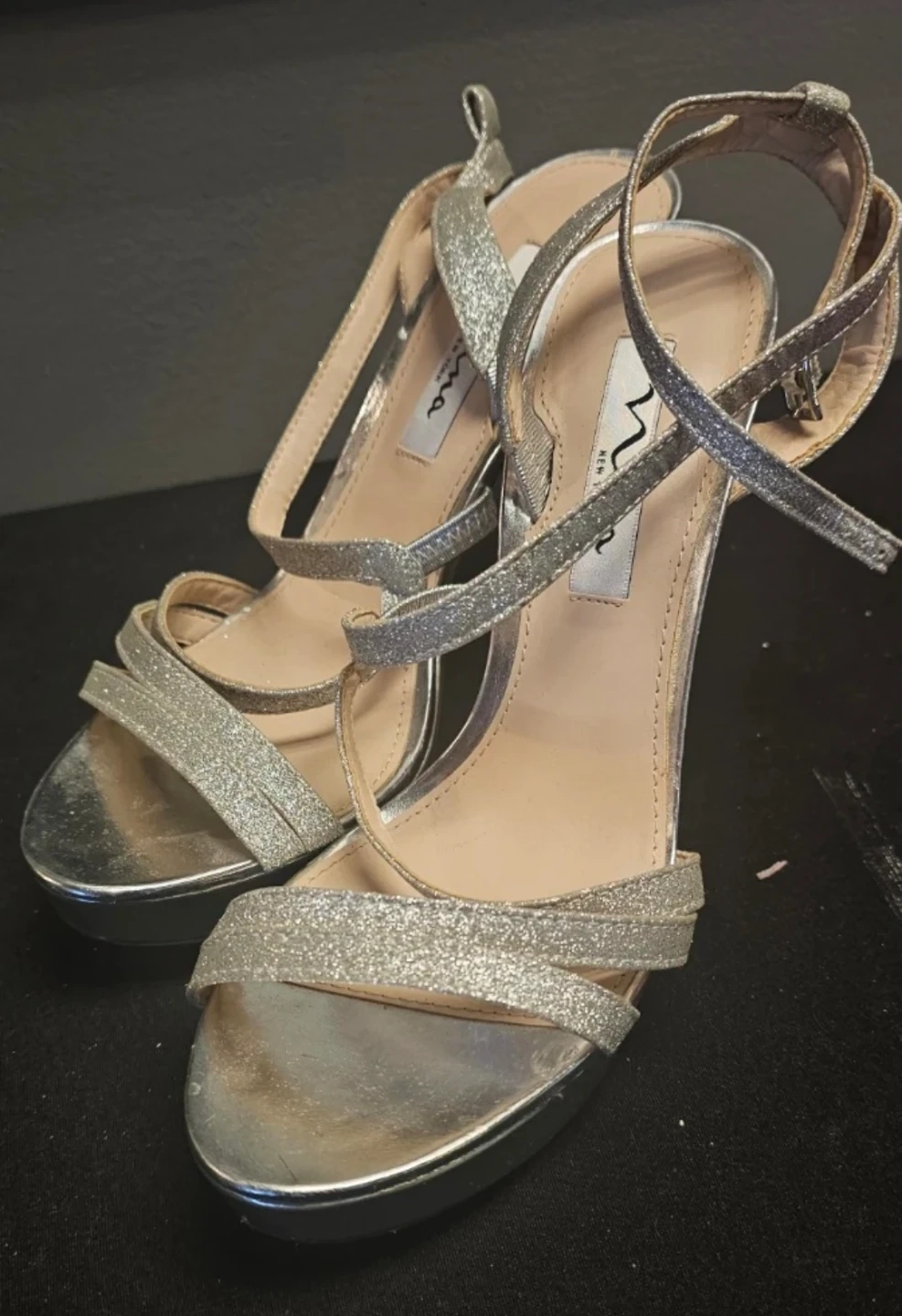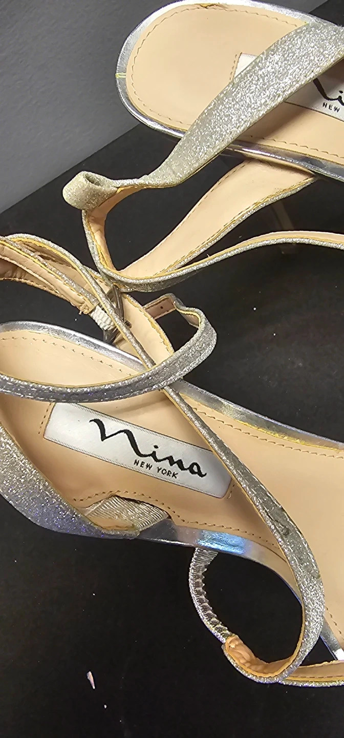 Nina New York Silver Glitter Strappy Heels - Size 8.5