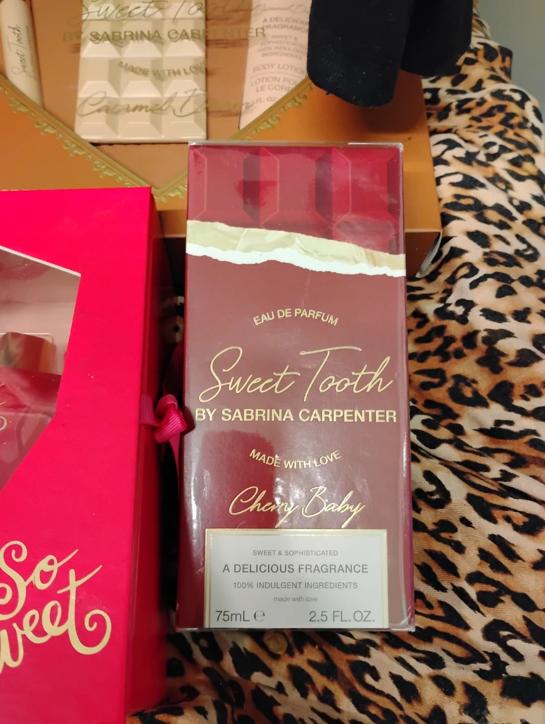 This is a Sweet Tooth gift set by Sabrina Carpenter. It includes a 0.33 oz Eau de Parfum and a 2.5 oz Body Lotion. It's a delicious fragrance set!