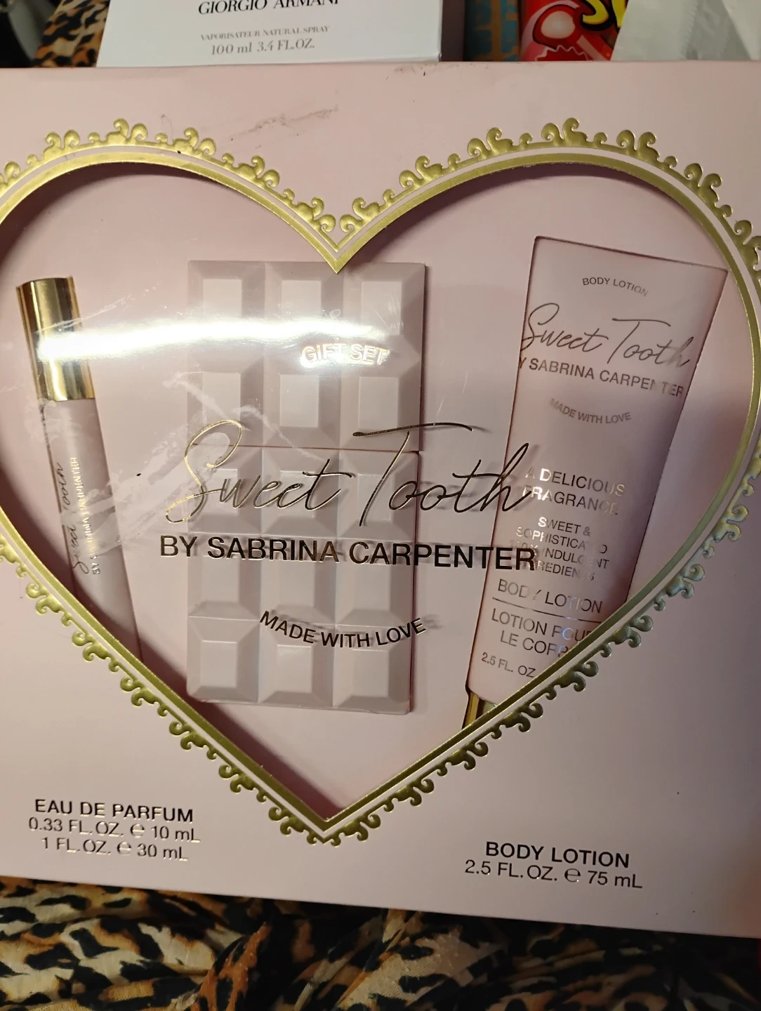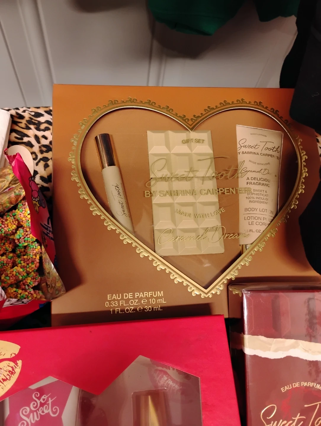 This is a Sweet Tooth gift set by Sabrina Carpenter. It includes a 0.33 oz Eau de Parfum and a 2.5 oz Body Lotion. It's a delicious fragrance set!