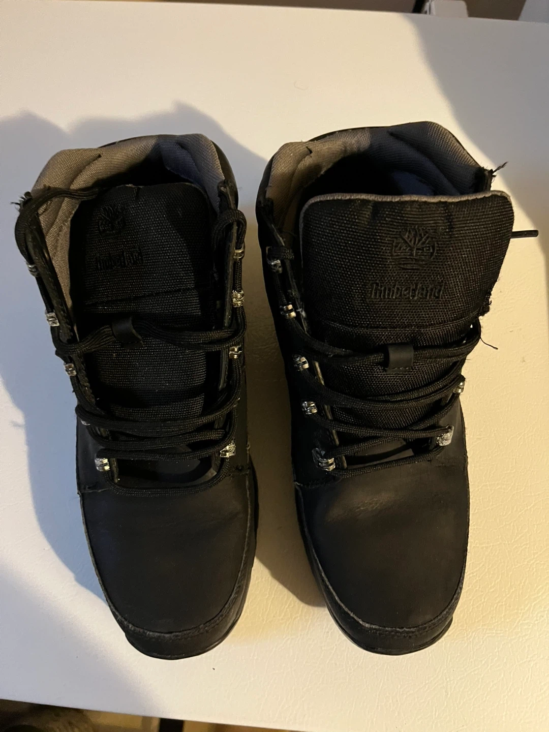 34Selling a pair of Timberland boots in black. These are great for hiking or just everyday wear. They're in good condition and ready for a new home!