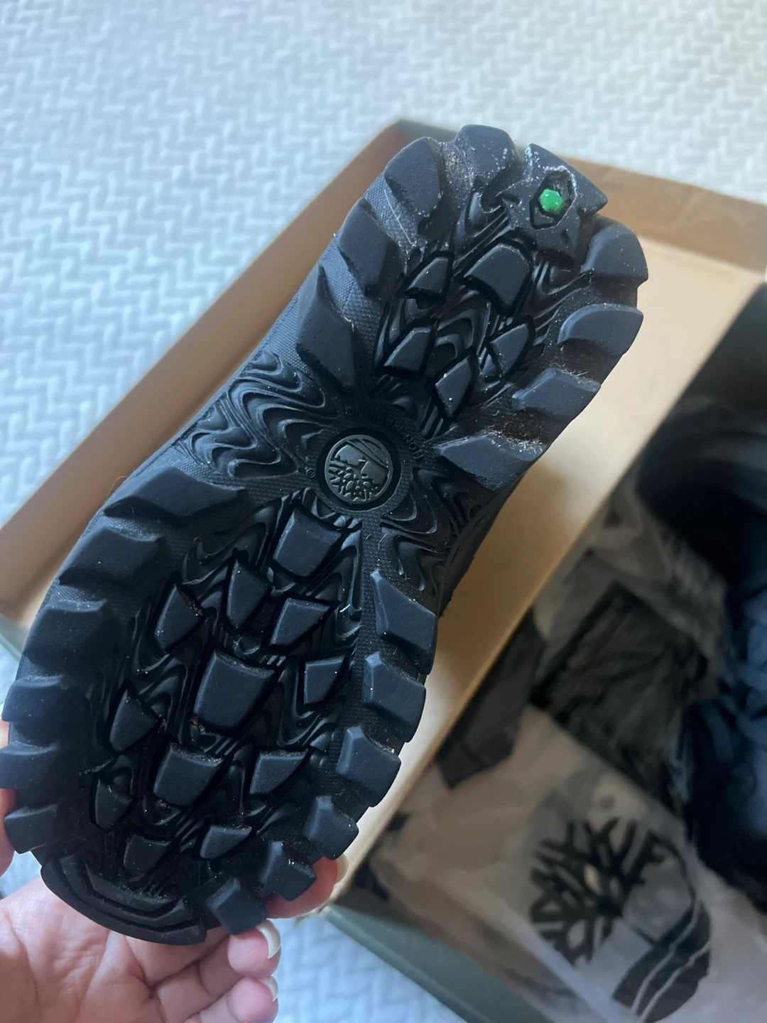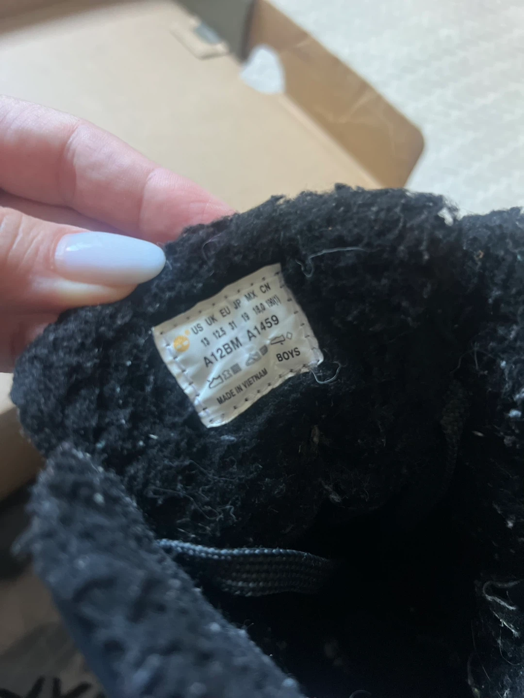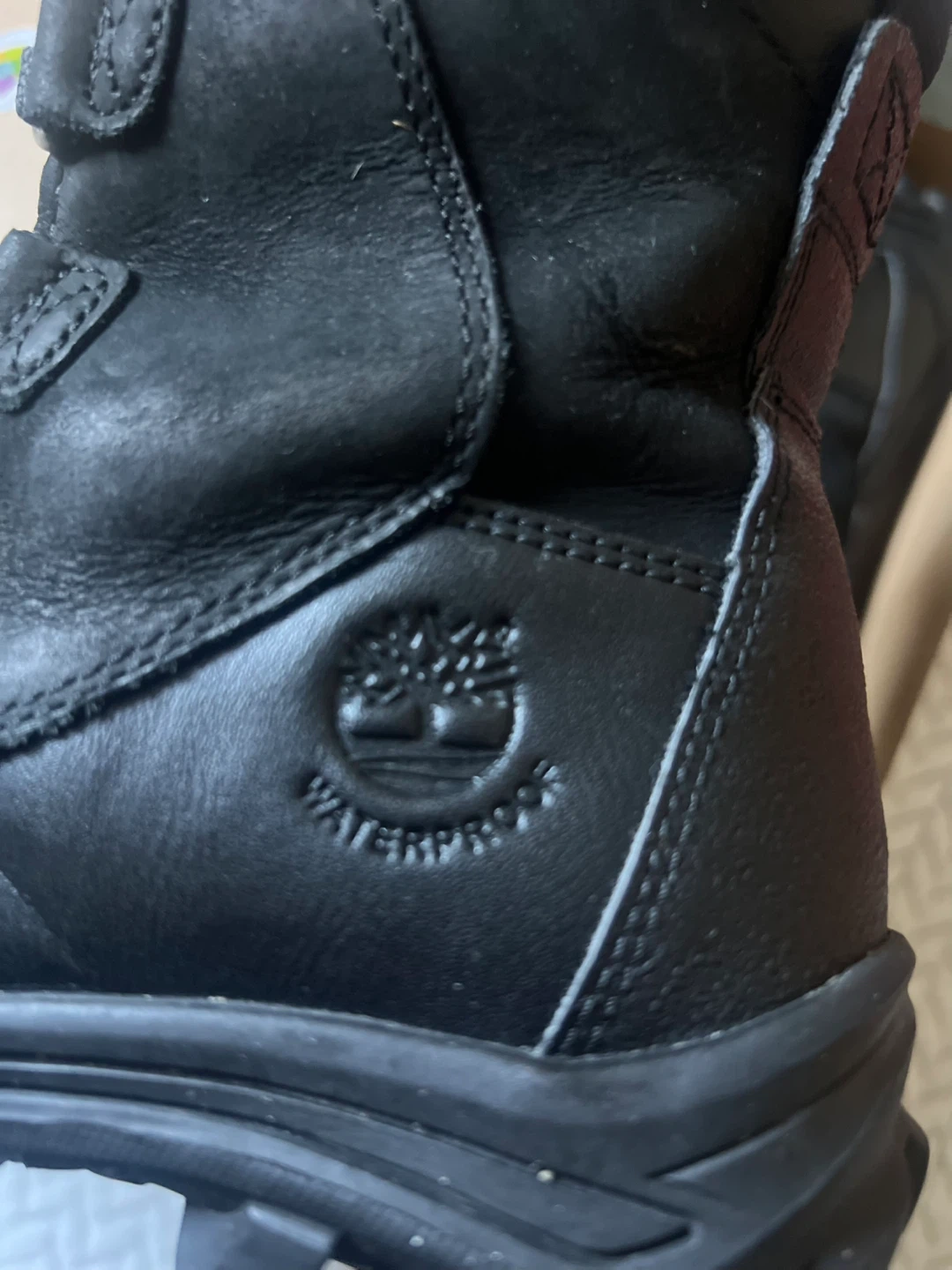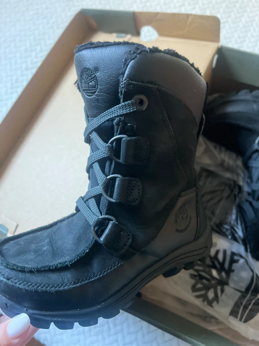 Selling a pair of Timberland boots in a kids size 13. They are black and waterproof. The boots are in good condition and come with the original box.
