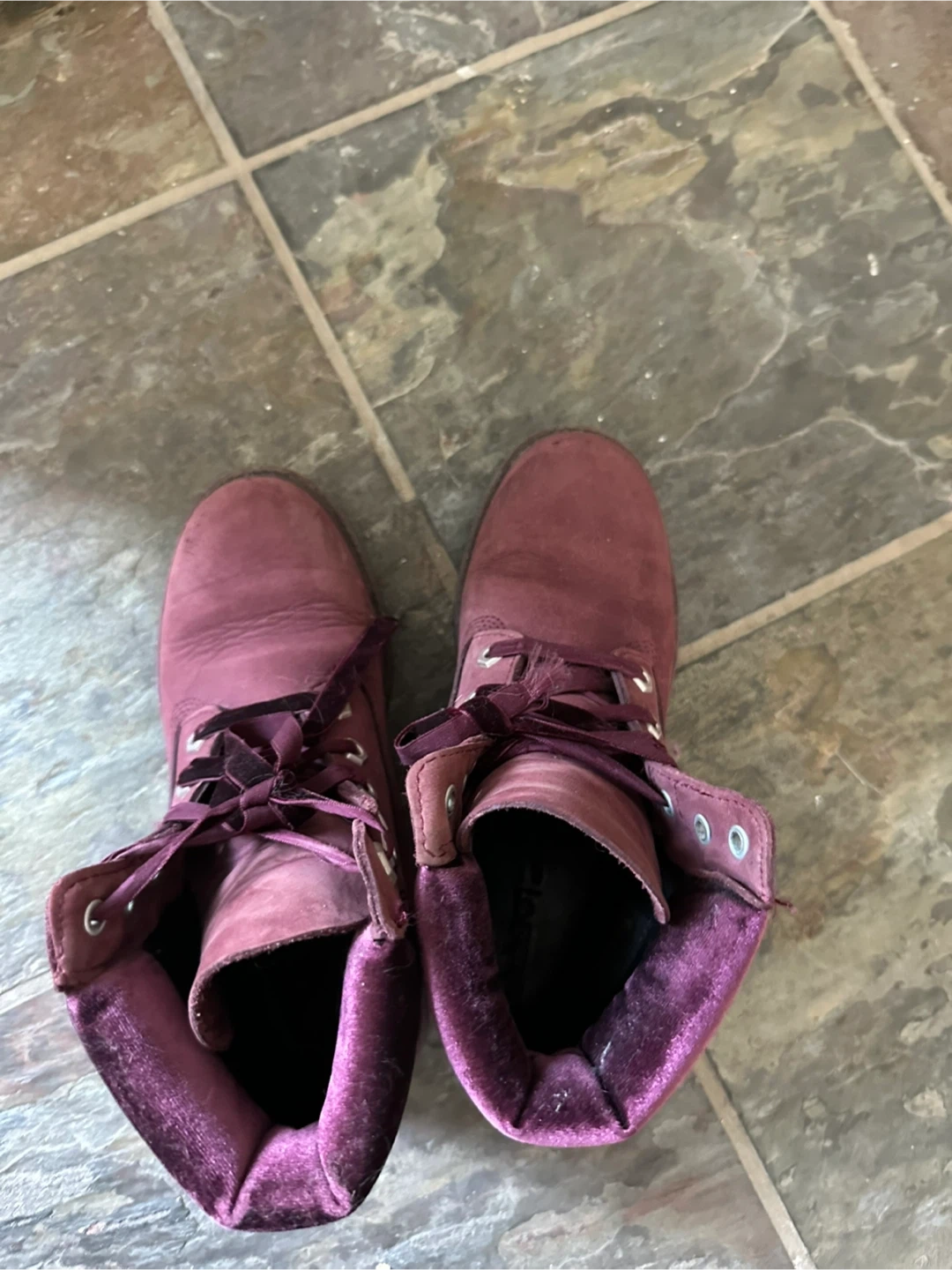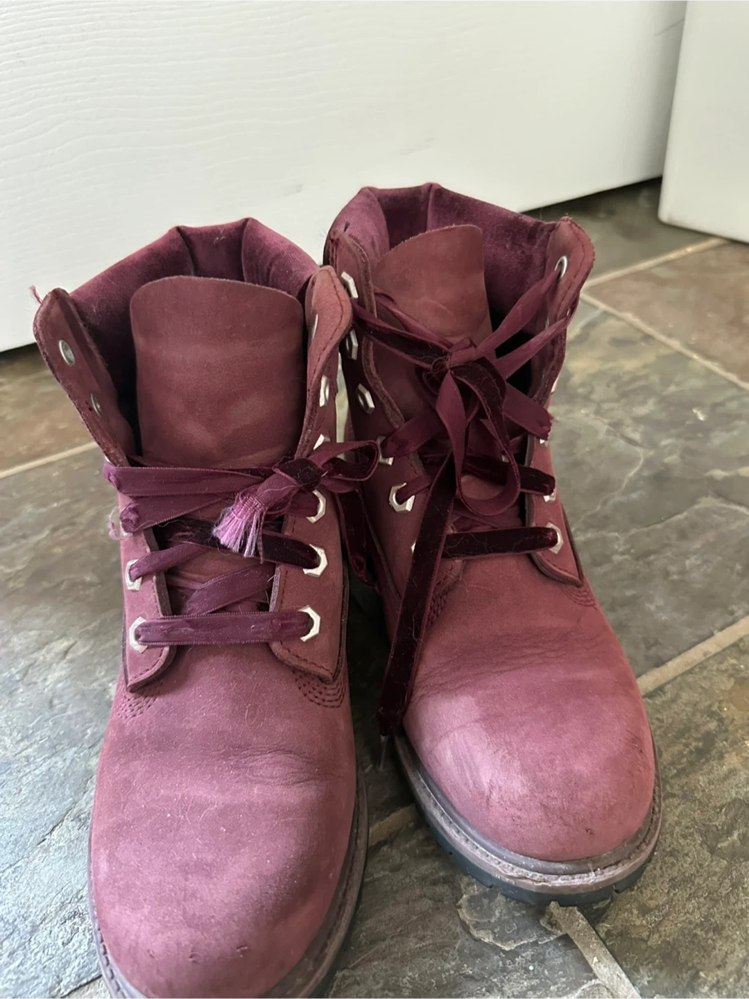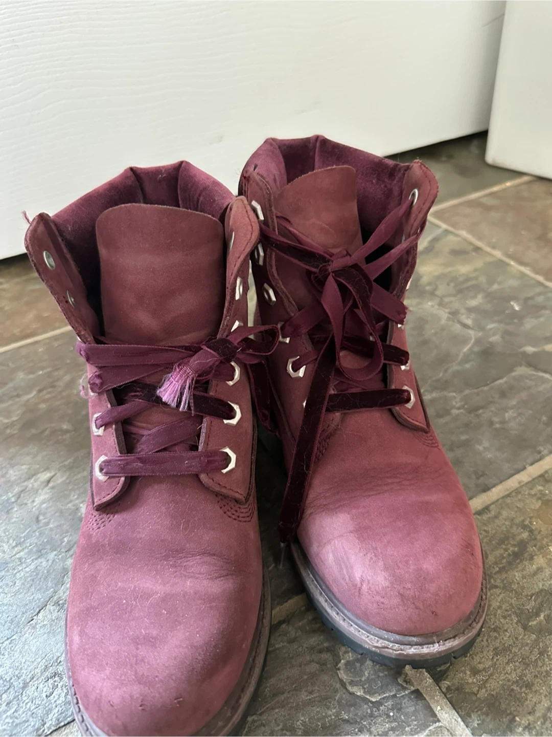 Selling a pair of Timberland boots in a lovely burgundy colour! They are a size 7 and have been gently used. Perfect for adding a touch of style to any outfit!