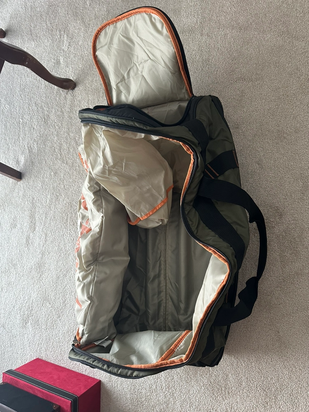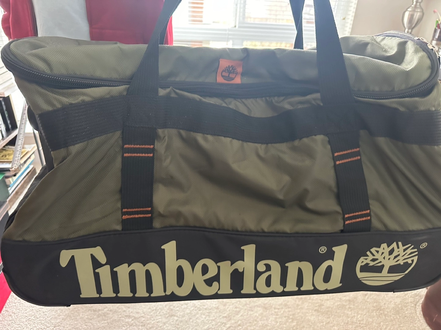 Green duffel bag with black accents. Has an inside pocket and two carrying handles. Used once from flight home to Vancouver.