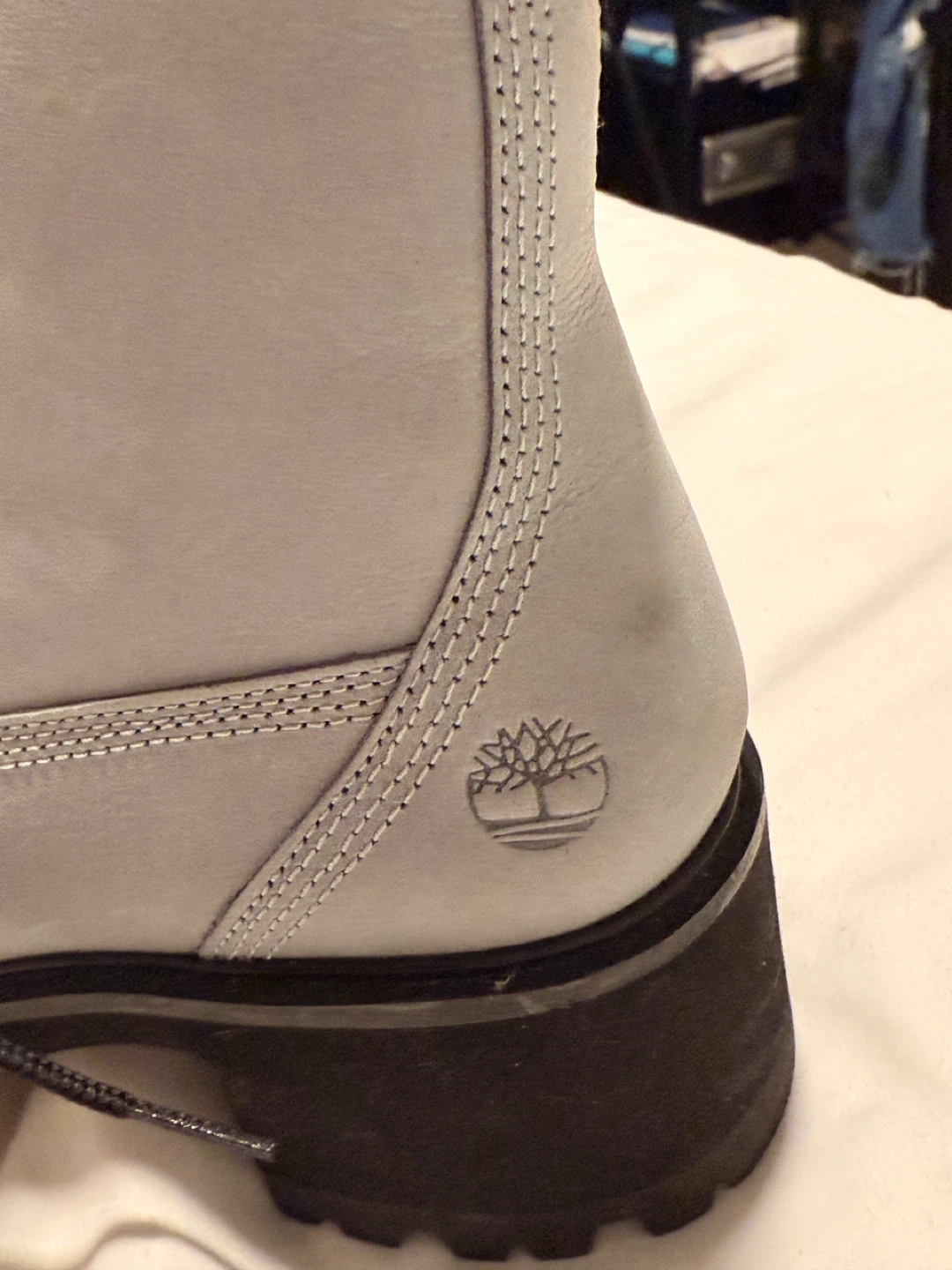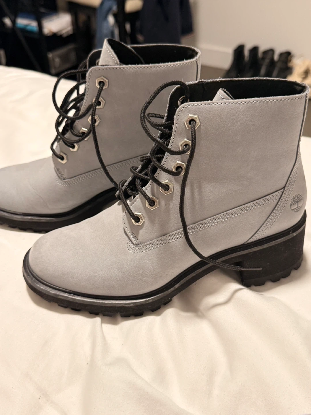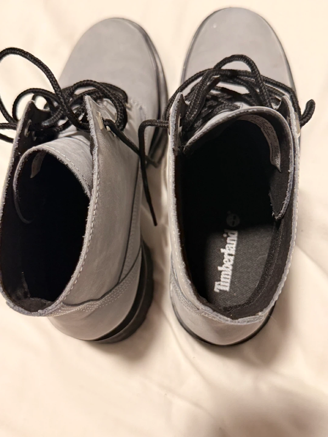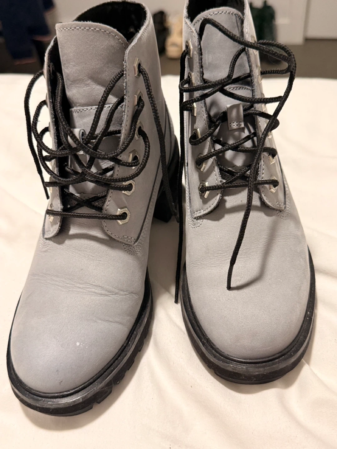 64Selling a pair of Timberland heeled boots in a lovely gray leather! They have black laces and a chunky heel. Perfect for adding a bit of edge to any outfit