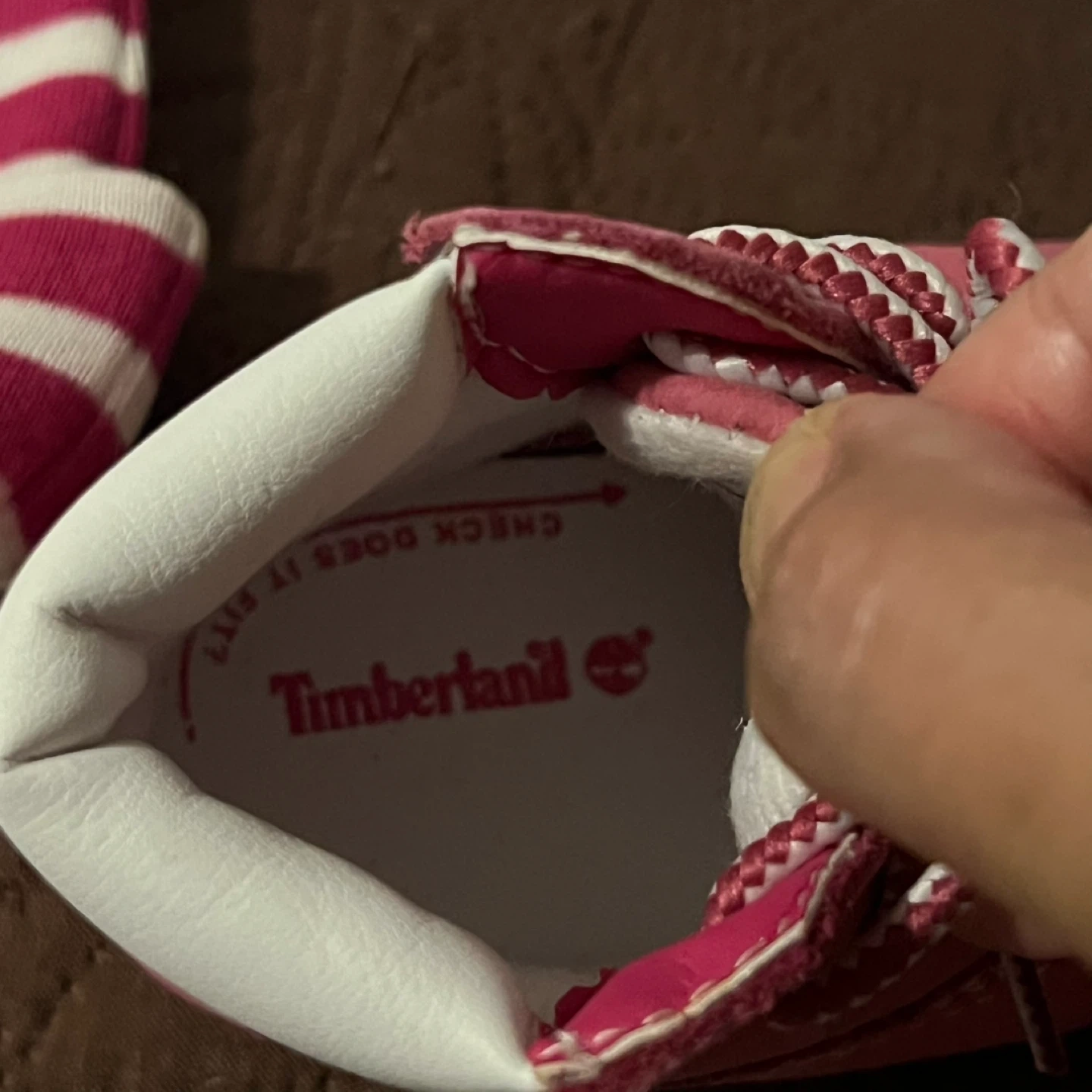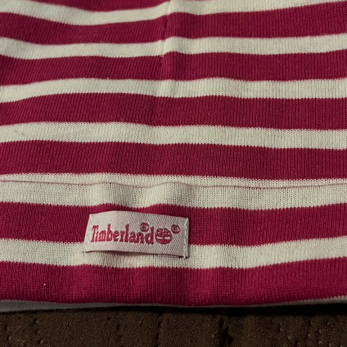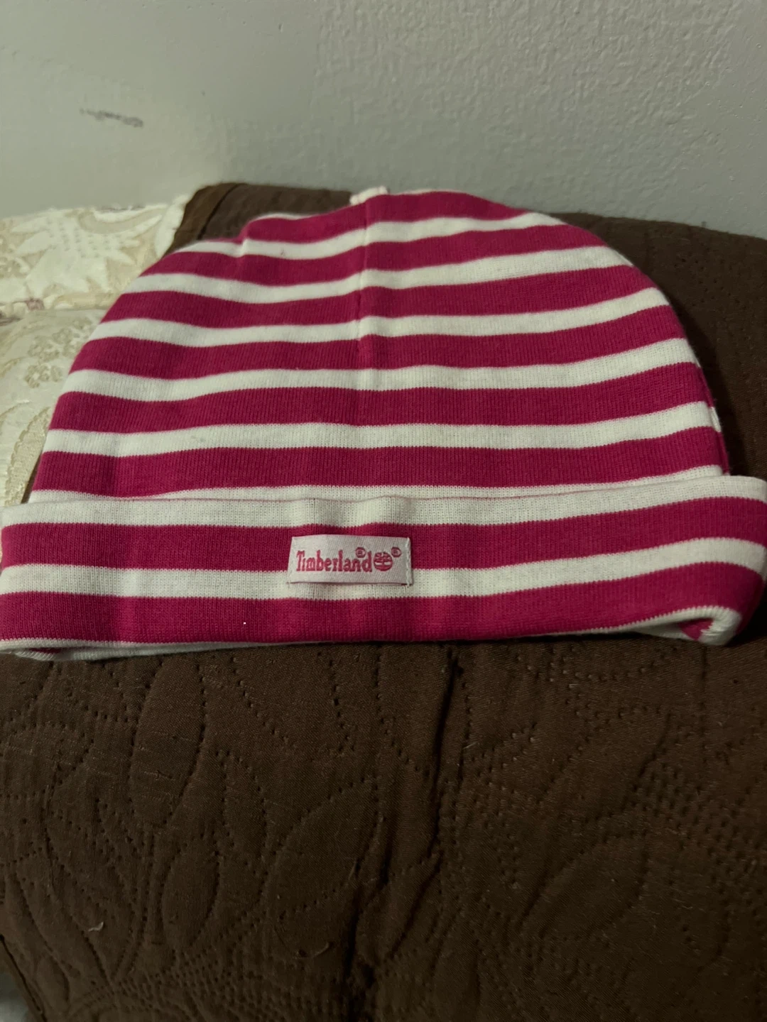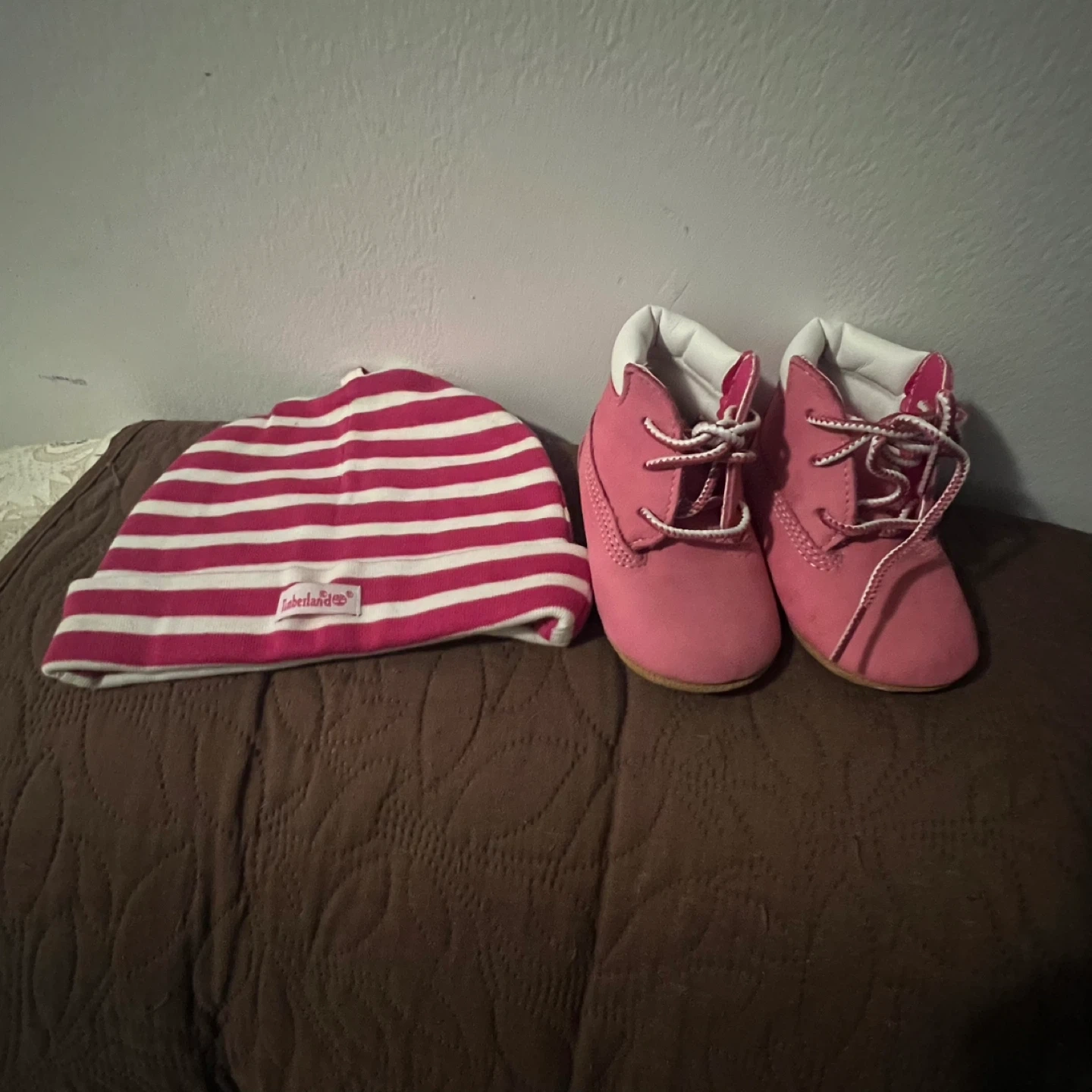 A cute little set of Timberland baby boots and a matching hat! Both are in great condition and ready for a new home. The boots are a lovely shade of pink with white accents, and the hat features a striped design in the same colours. Perfect for keeping your little one stylish and cozy!