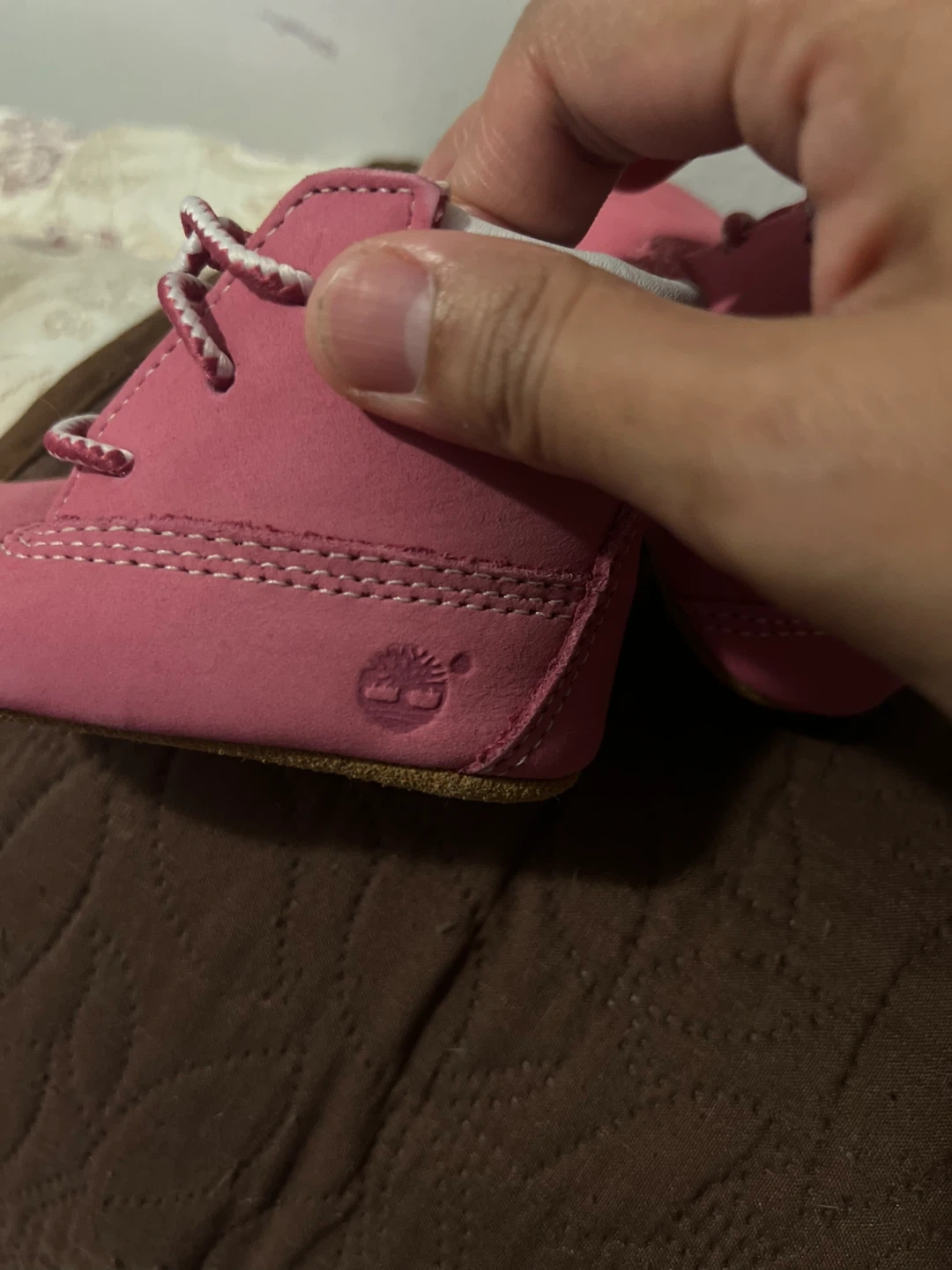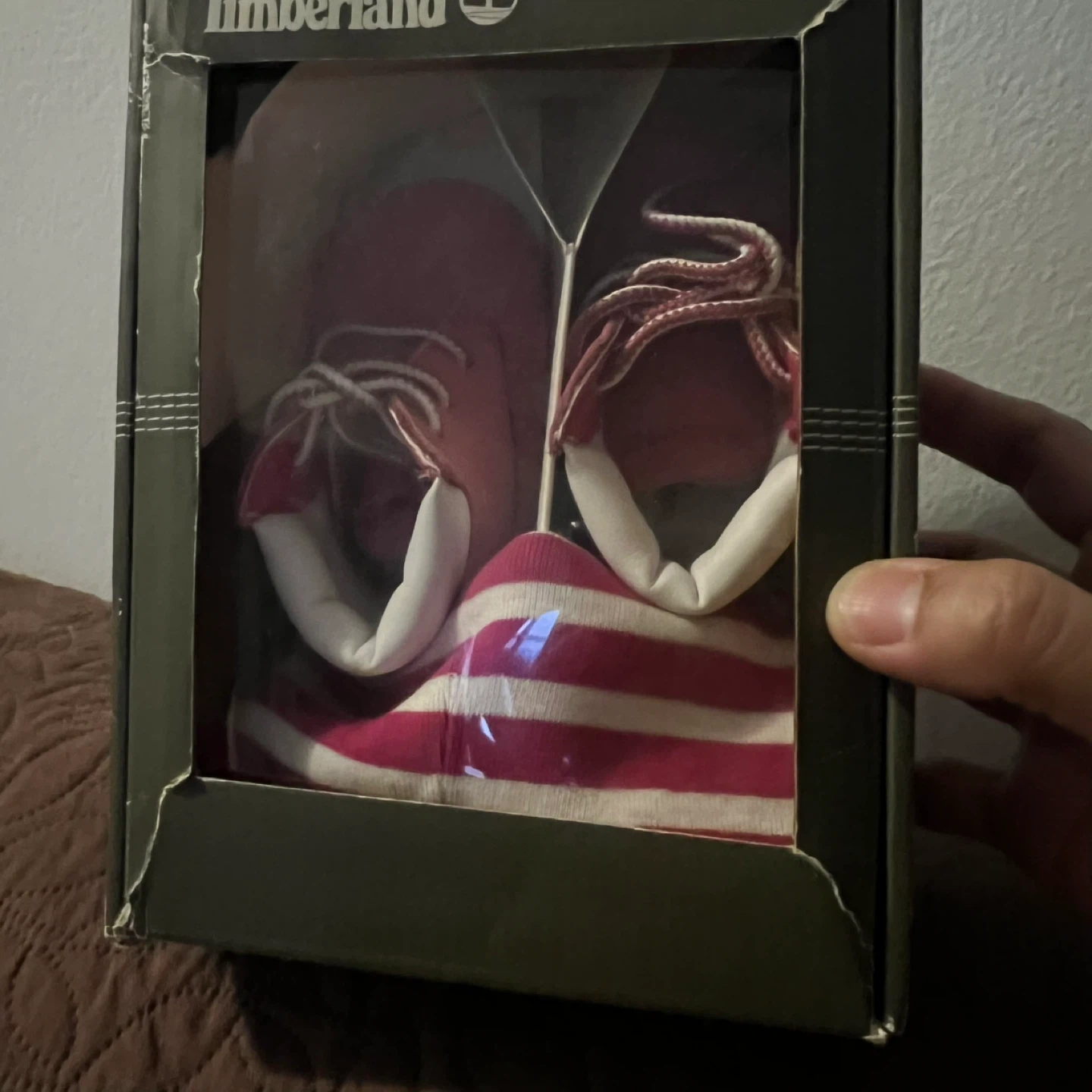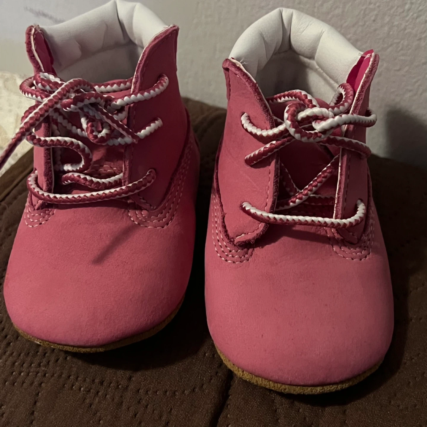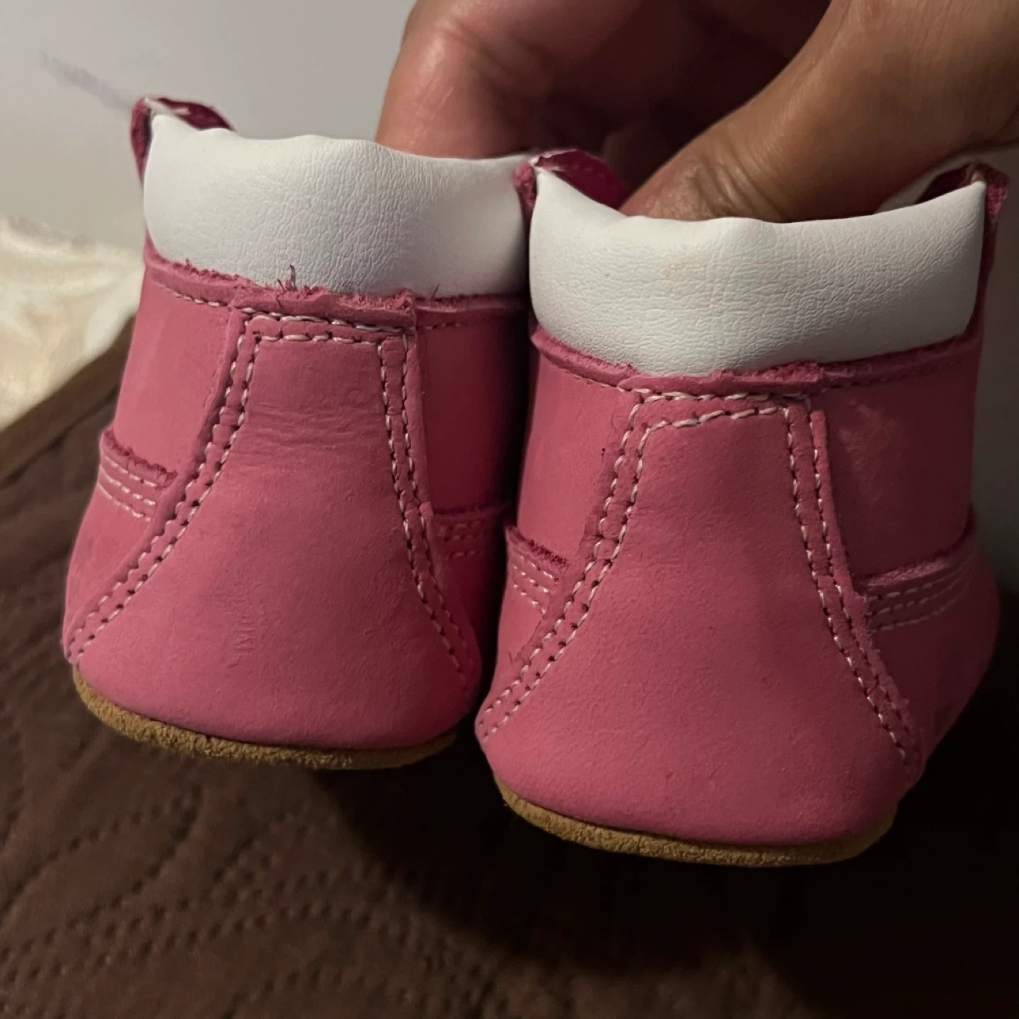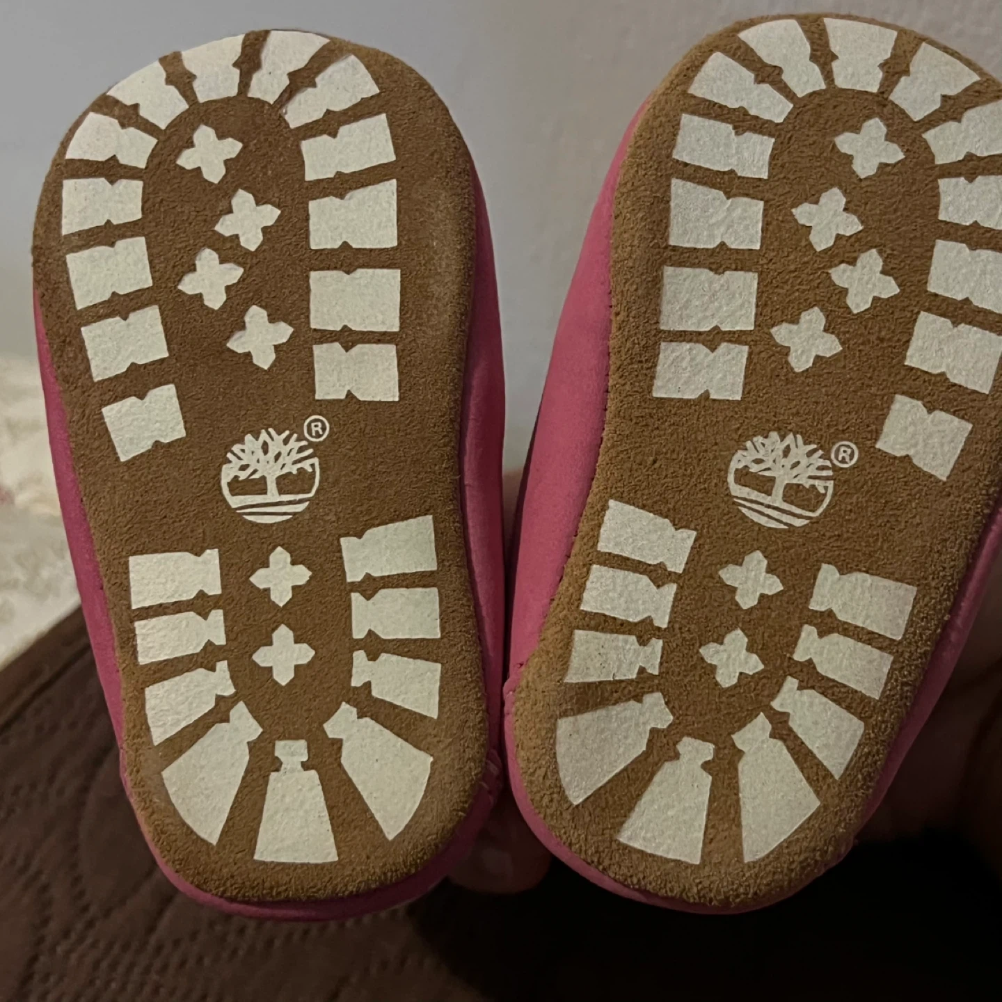A cute little set of Timberland baby boots and a matching hat! Both are in great condition and ready for a new home. The boots are a lovely shade of pink with white accents, and the hat features a striped design in the same colours. Perfect for keeping your little one stylish and cozy!