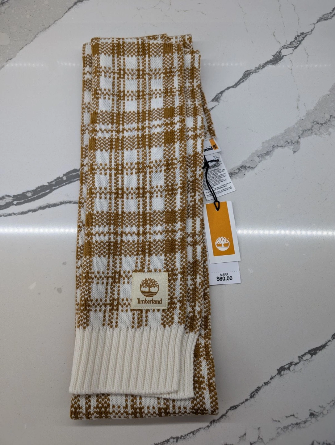 White and brown plaid scarf with a Timberland logo. New with tags.