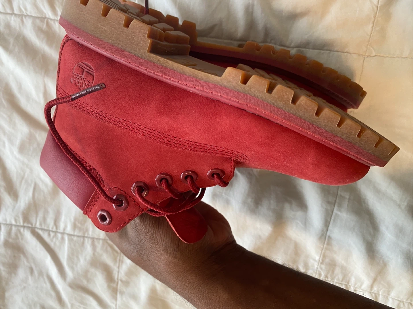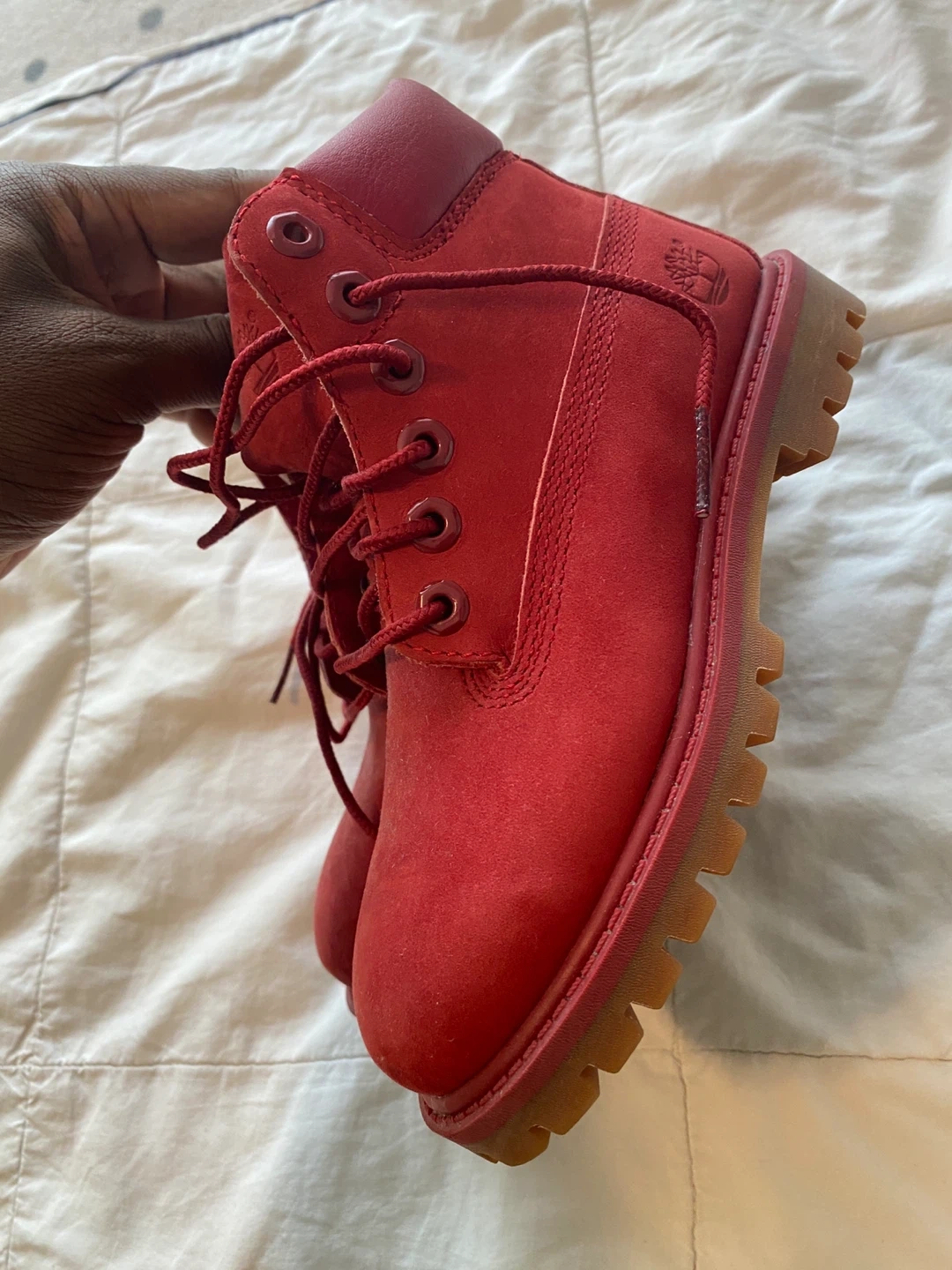 These are a pair of Timberland boots in a vibrant red colour. They are made of nubuck leather and are in great condition. Perfect for adding a pop of colour to any outfit. “Not in a Box”