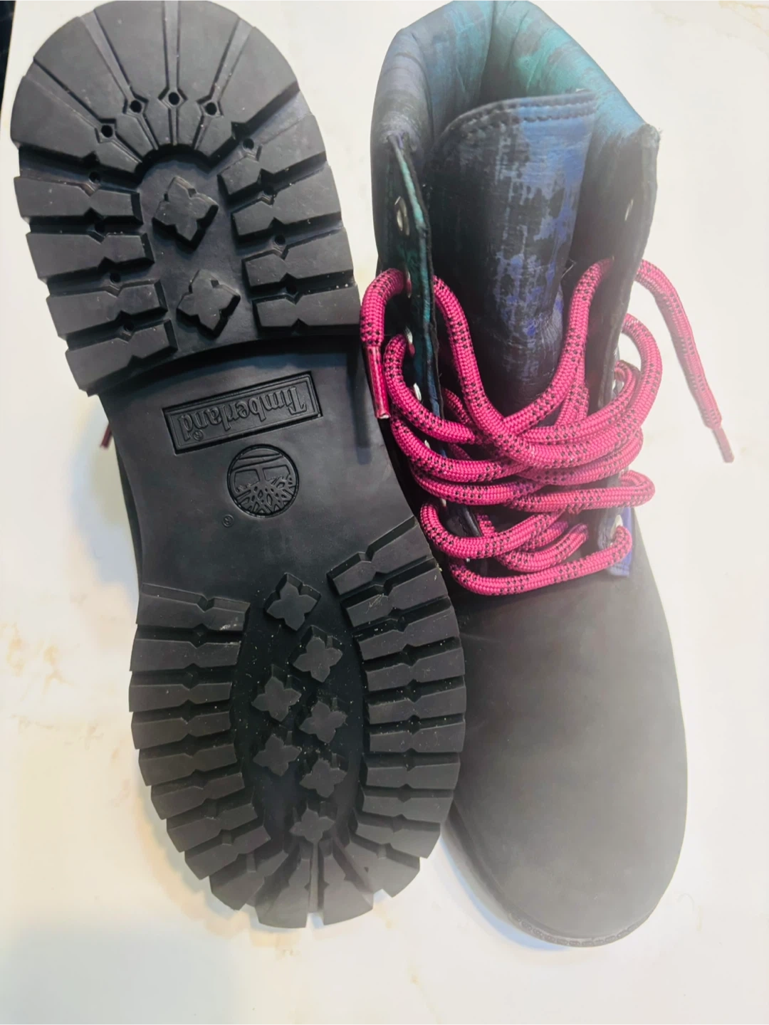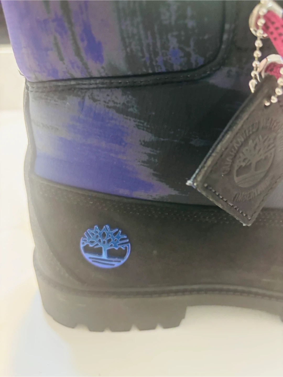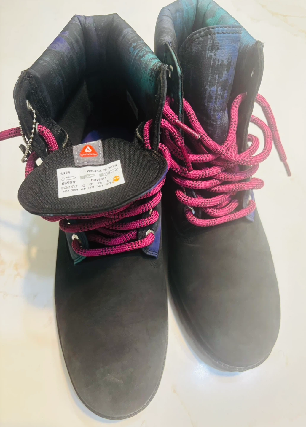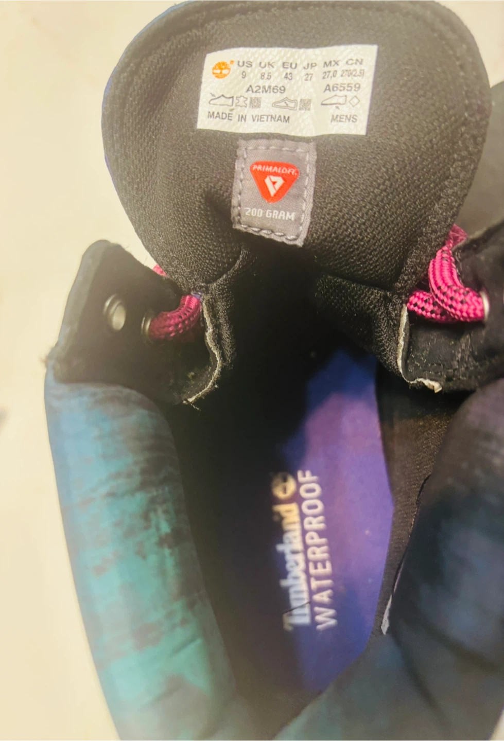 15Selling a pair of Timberland waterproof boots in size 9. They feature a unique design with purple laces and a black/blue upper. The boots are made in Vietnam and have a 200-gram PrimaLoft insulation to keep your feet warm and dry.