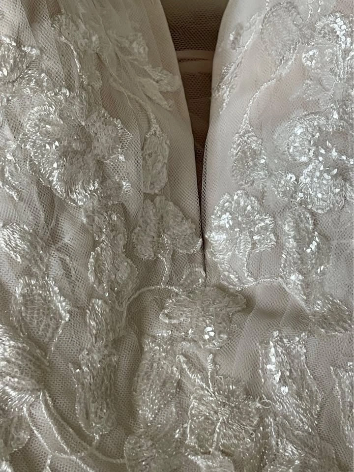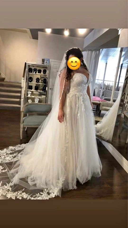 Selling a BRAND NEW, UNALTERED timeless romantic wedding dress. It has a classic A-line silhouette and sweetheart neckline, this dress is bridal at its most enchanting. Beautiful lace floral pattern for an extra touch of charm. Glittering sequin details in the lace patterns subtly sparkle, making you glimmer all day long. The ballerina-inspired skirt has embroidered florals that cascade down through the top of the skirt, with layers of tulle creating a flowing dress made to glide down the aisle. Extra lace material available to make off-the-shoulder straps and add an extra touch of charm. Dress is brand new and unaltered size 16. (Selling because we eloped!)