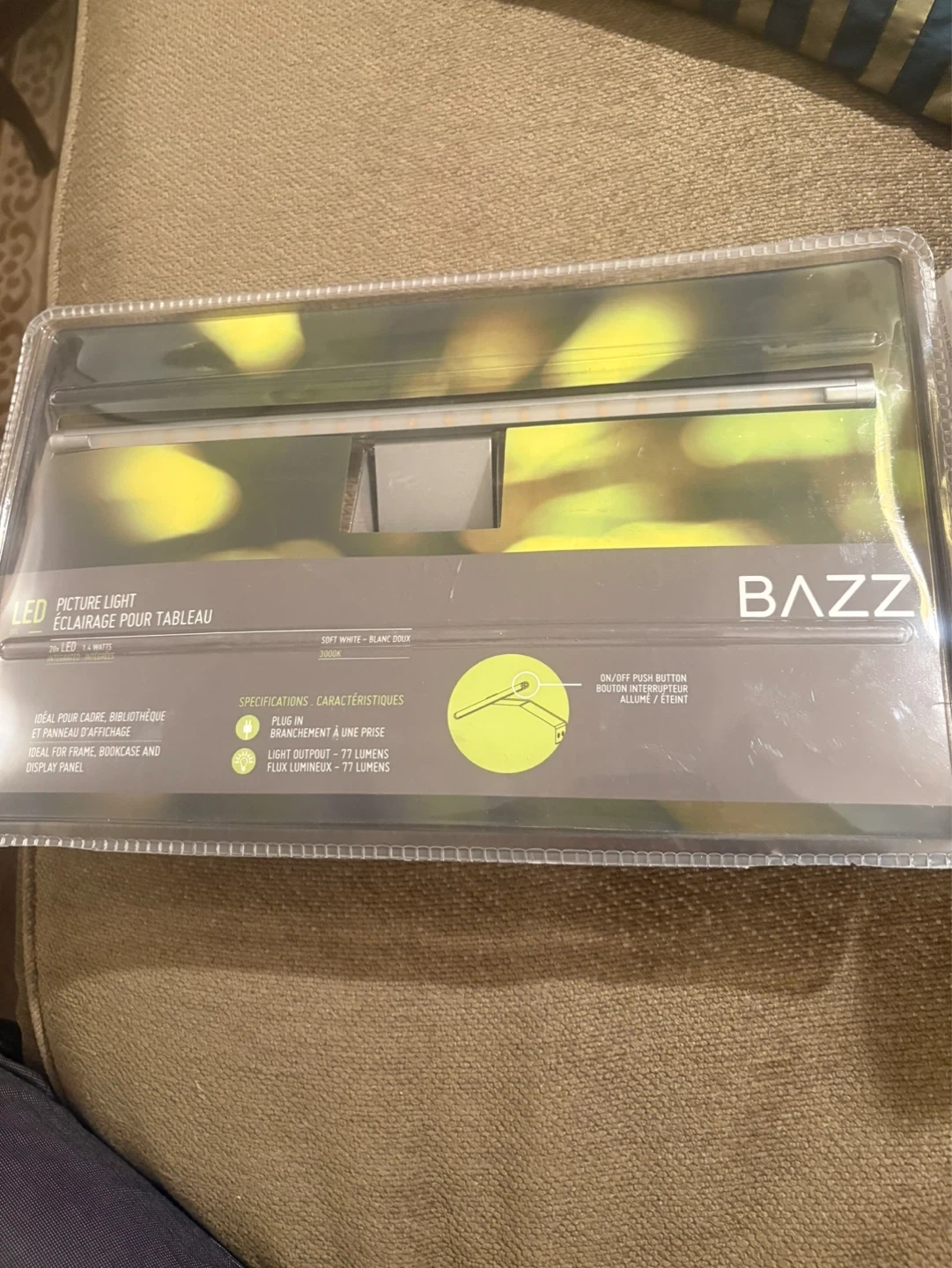 This is a Bazz LED picture light, providing soft white illumination. It's ideal for framing, bookcases, and display panels. Light output is 77 lumens.