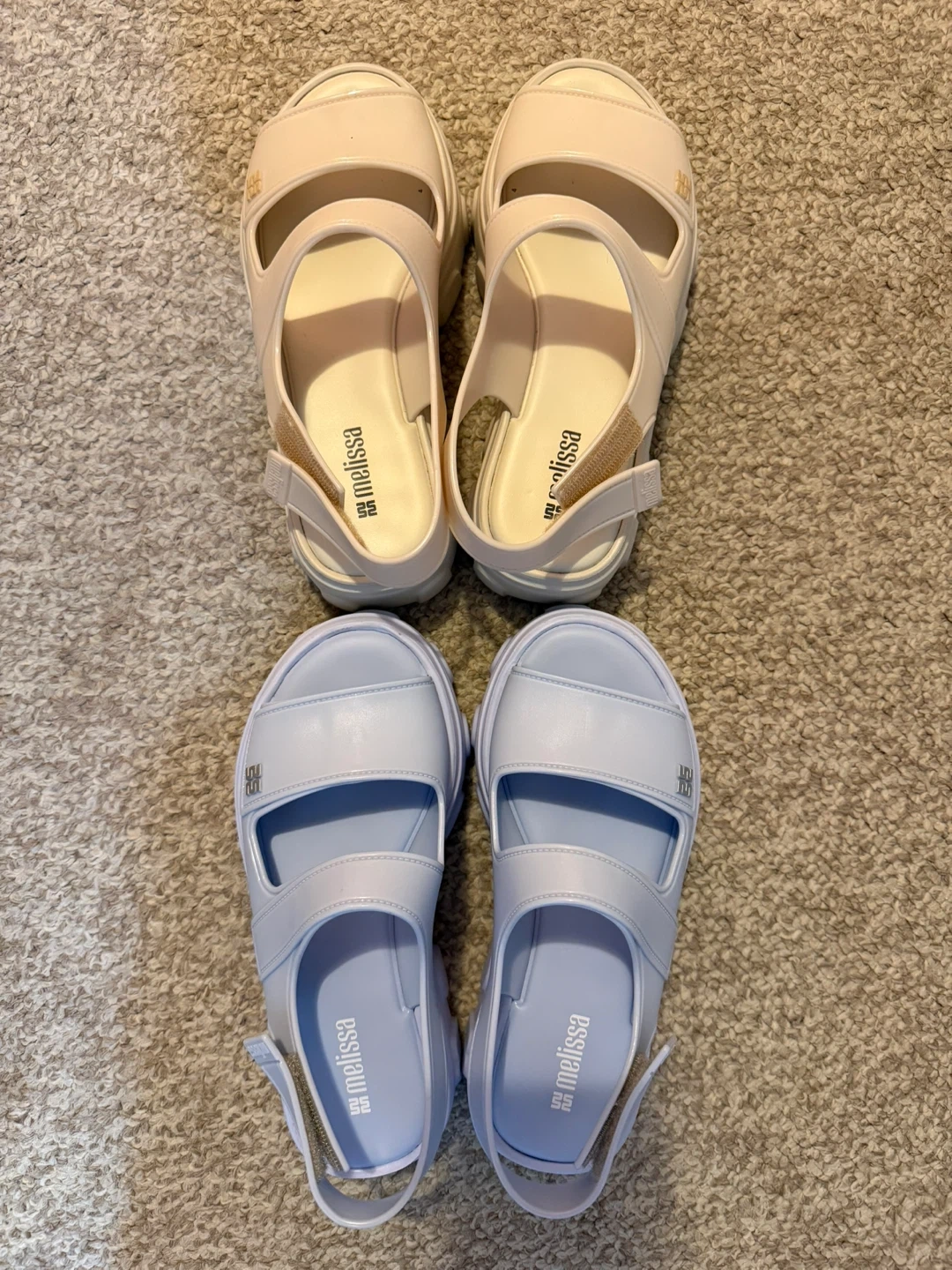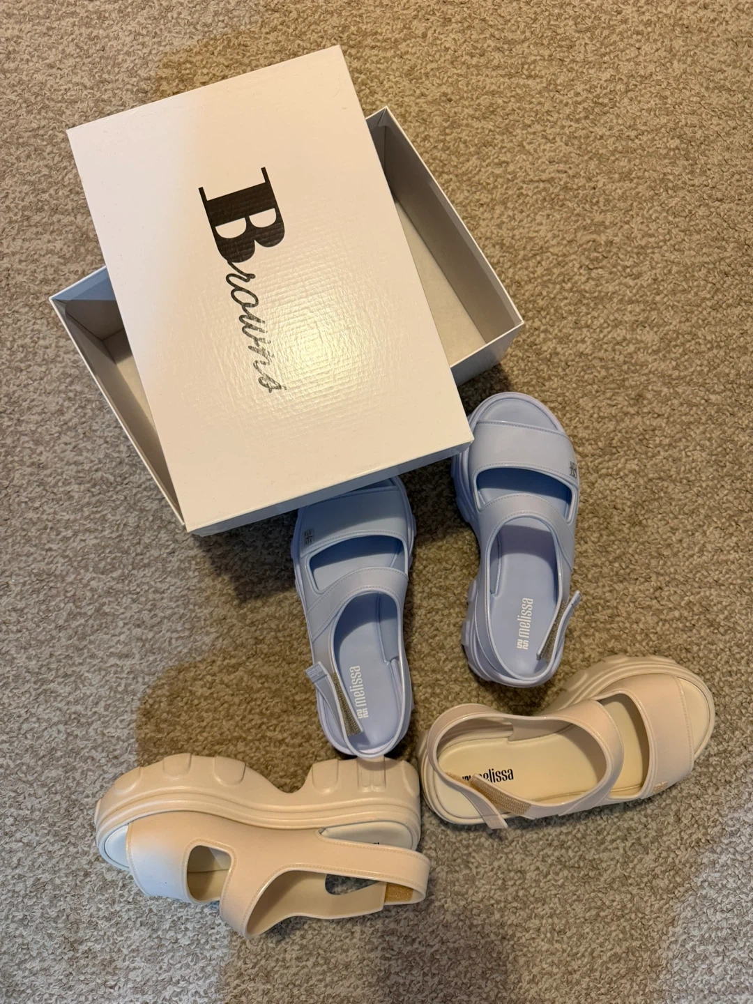 Two pairs of Melissa sandals are up for grabs! One pair is a lovely light blue, and the other is a soft beige. They're both in great condition and come with the original box. Size 6