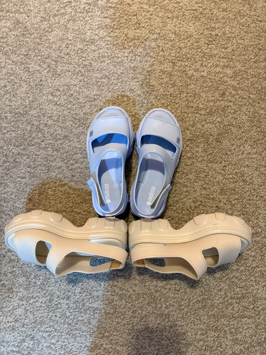 Two pairs of Melissa sandals are up for grabs! One pair is a lovely light blue, and the other is a soft beige. They're both in great condition and come with the original box. Size 6