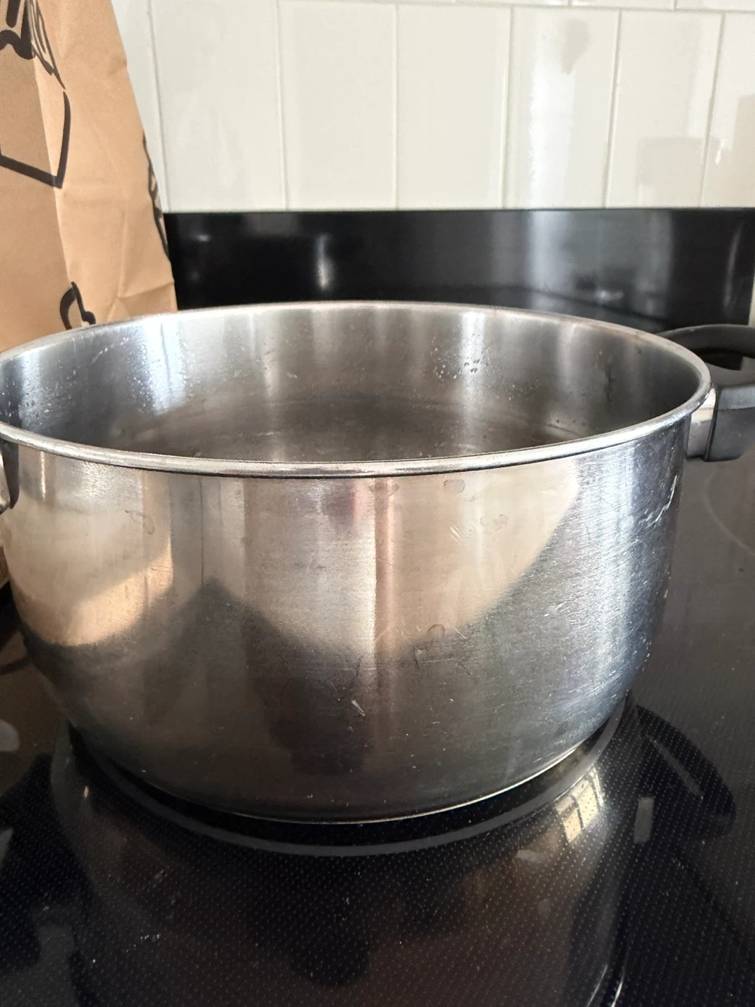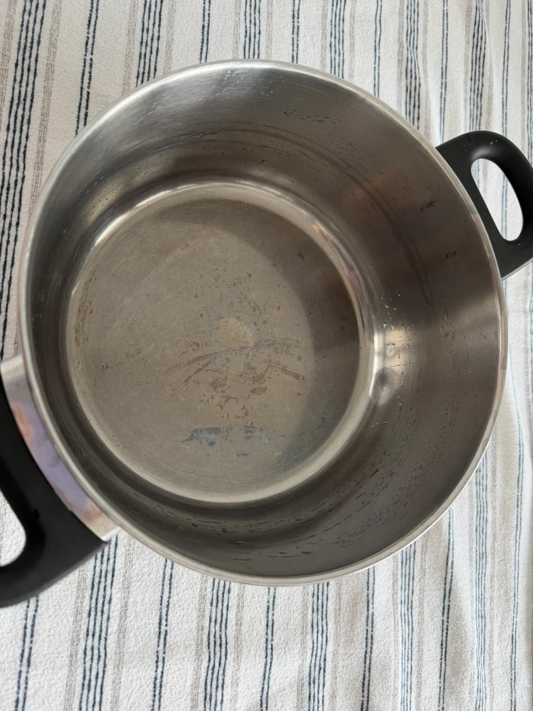 This is a stainless steel stock pot with black handles. It's suitable for making soups and stews. The pot is made of durable stainless steel.