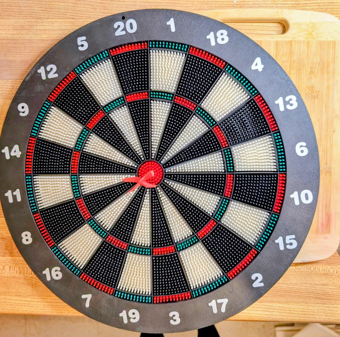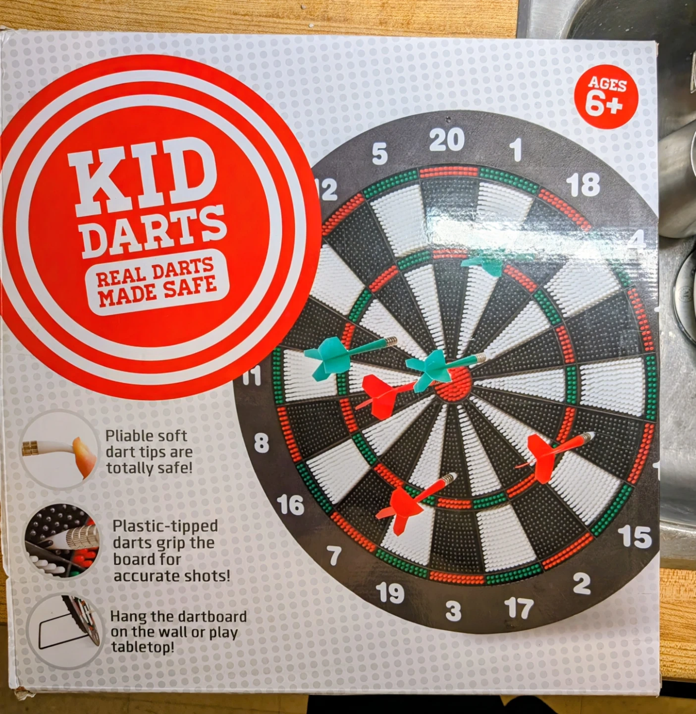 It's not just for kiddos. This dart board is great for adults as well. You can play Darts anywhere without causing any damage to walls or furniture. Darts set includes a 16-inch safety dart board with pliable soft dart tips for safe play. The plastic-tipped darts grip the board for accurate shots. It comes with a hanging bracket. Or can be hung on wall. Never used.