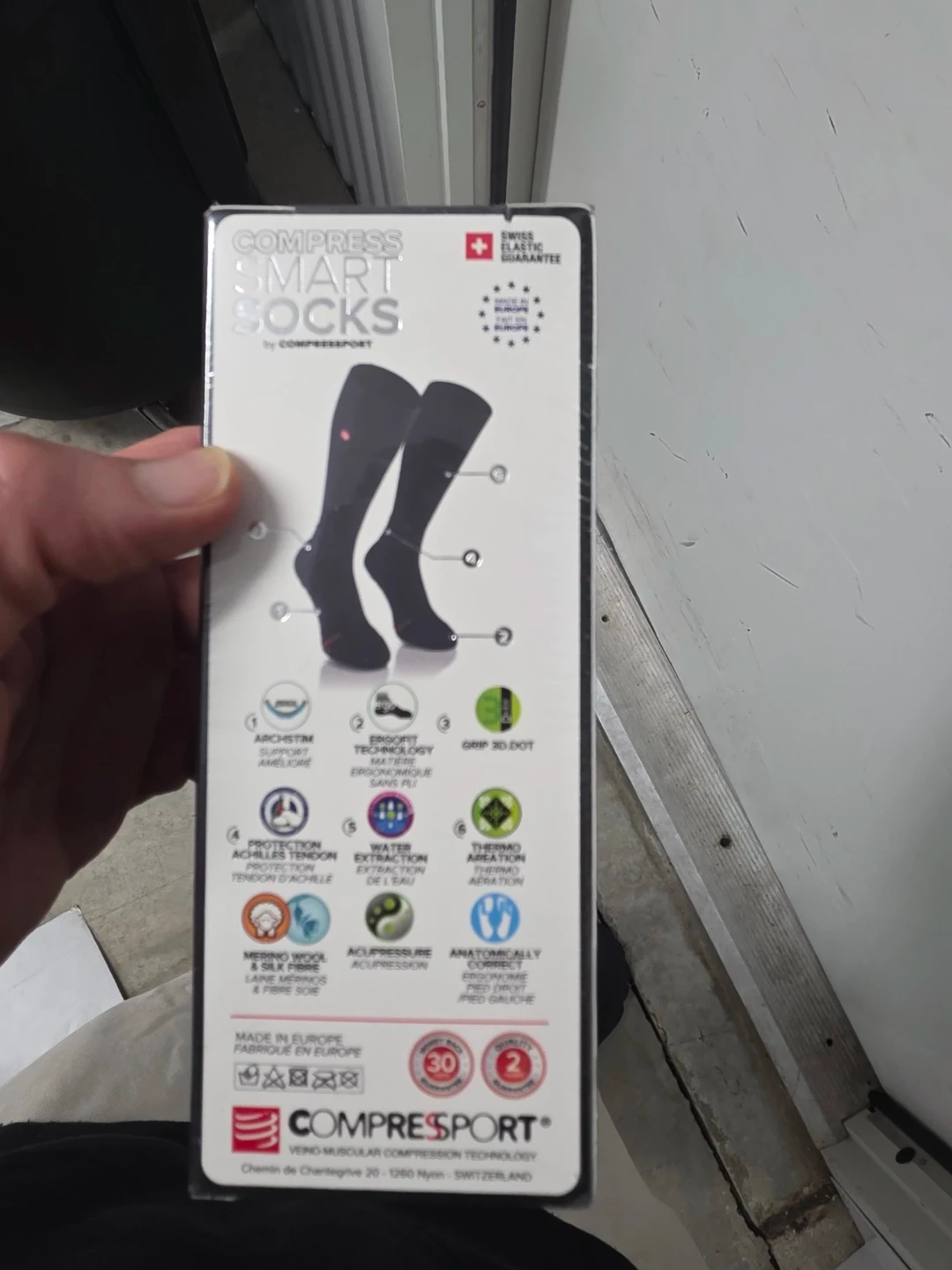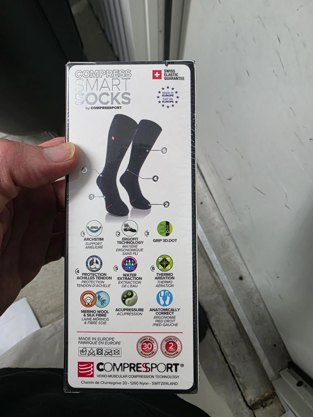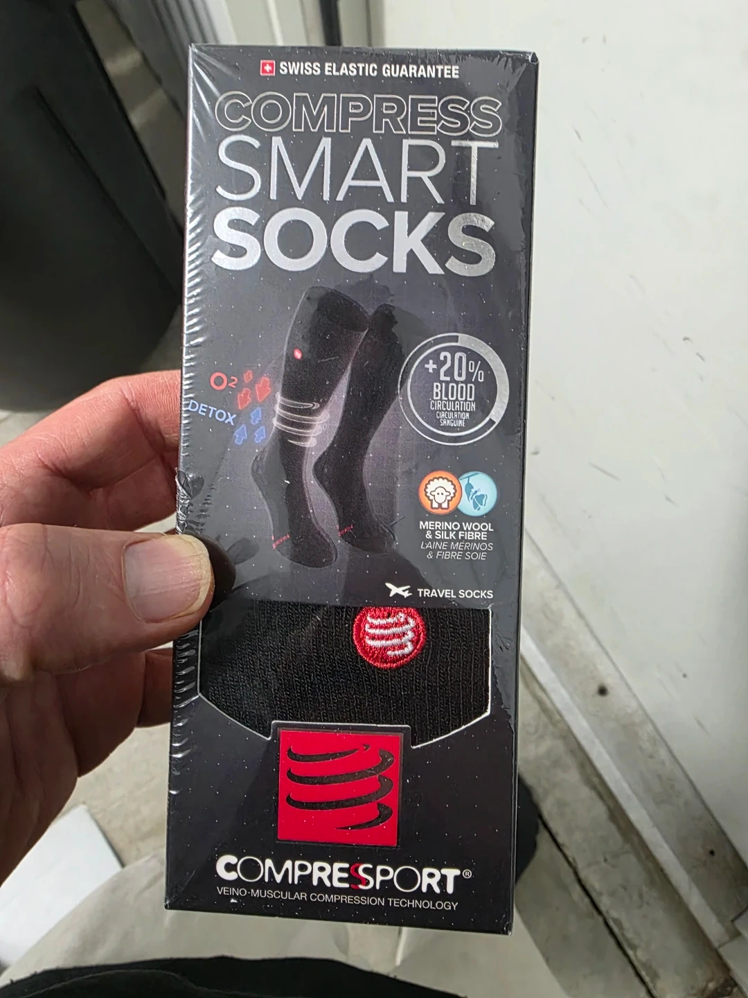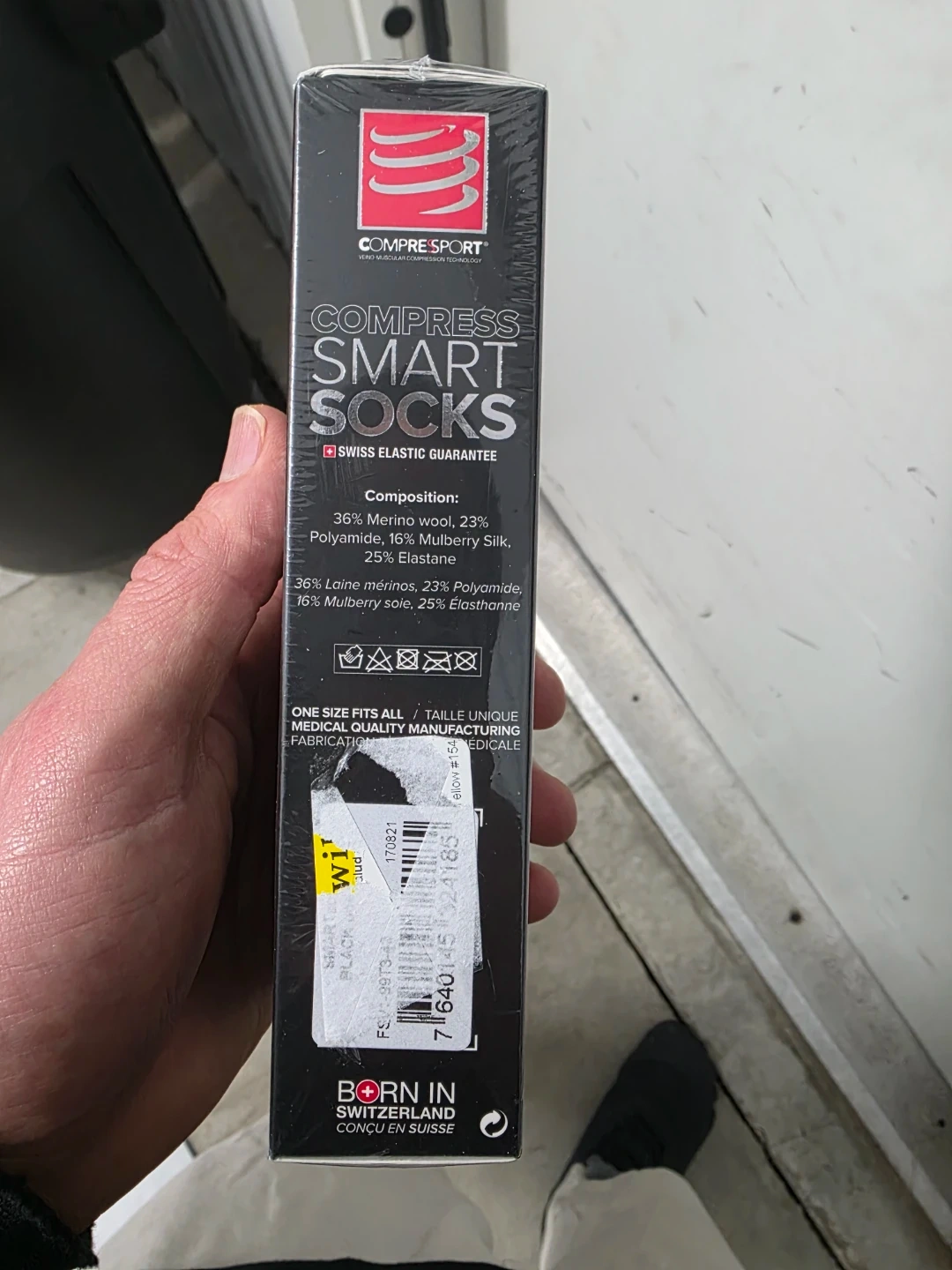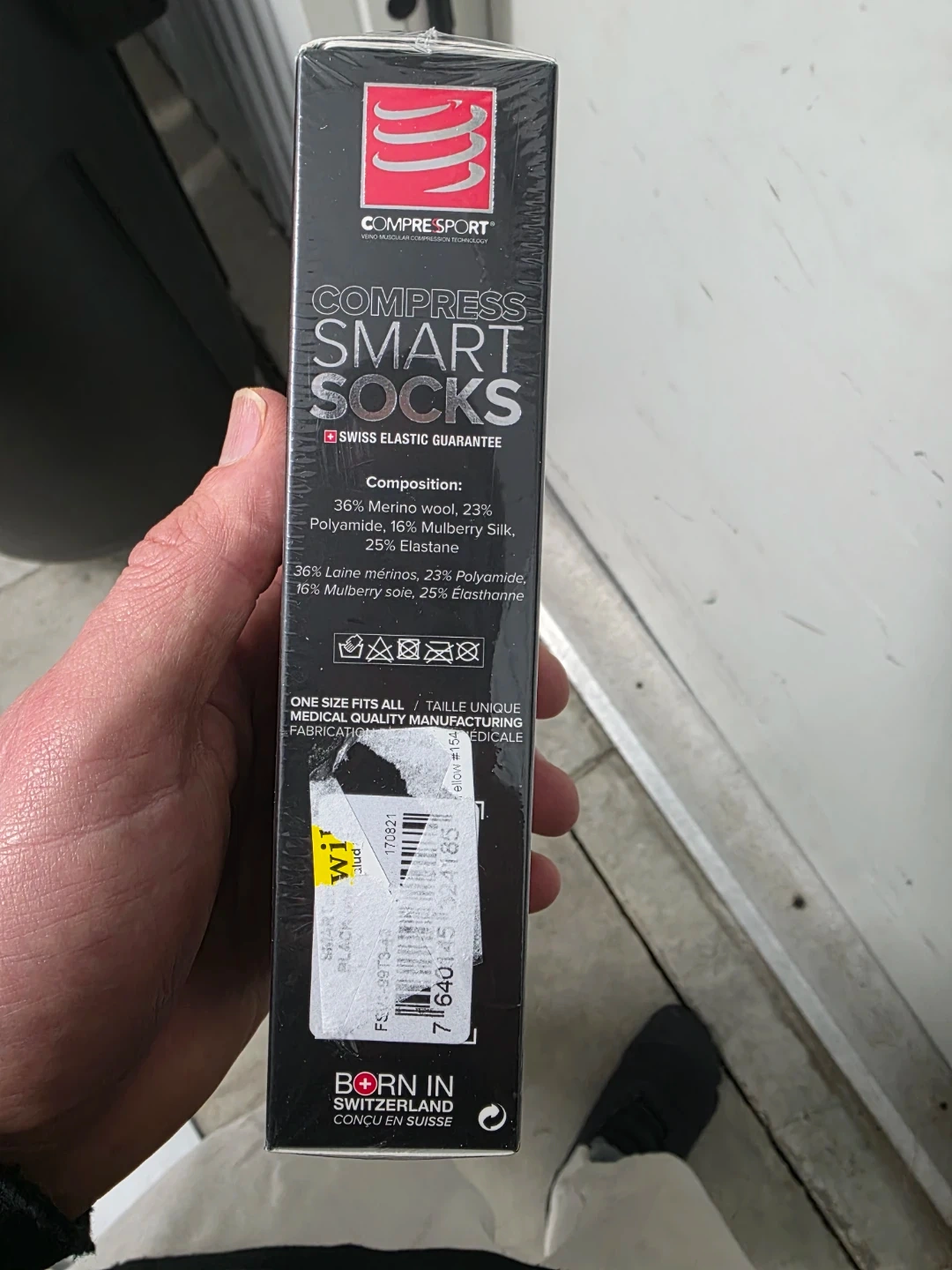 Selling a pair of Compressport Smart Socks, brand new in the box! They're a one-size-fits-all design and made with a blend of merino wool, mulberry silk, polyamide, and elastane. They feature arch support, grip 3D.dot technology, and acupressure for comfort and performance