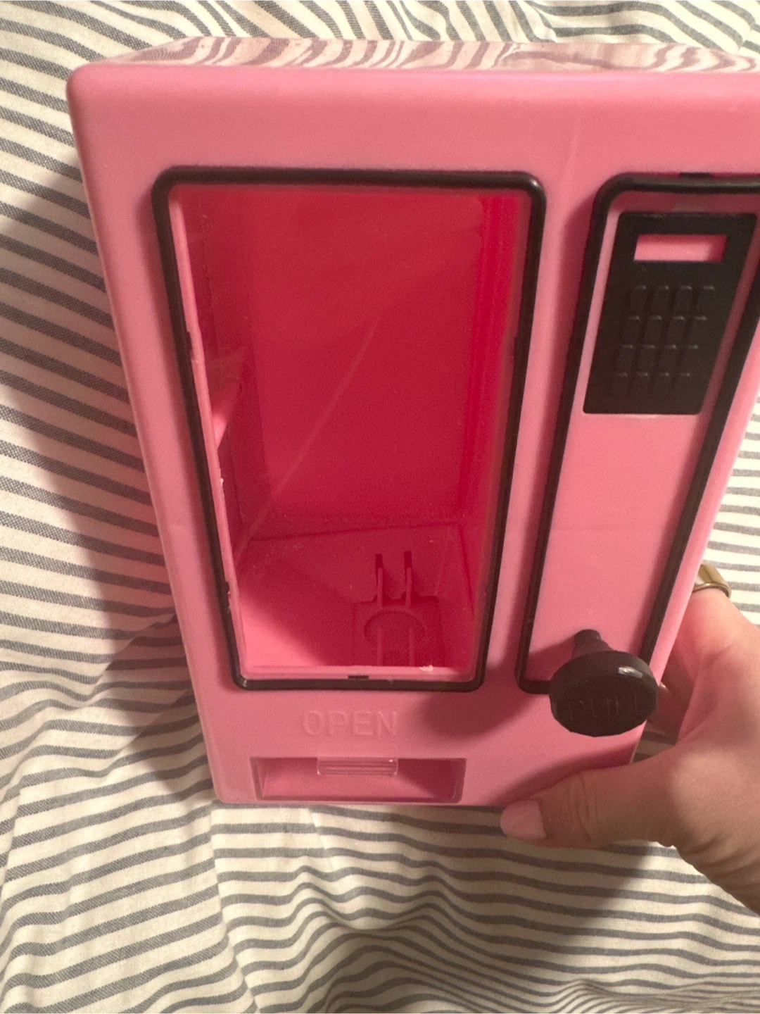 This is a pink toy vending machine. It's designed to look like a real vending machine with a keypad and a dispensing slot. It's great for holding small toys or organizing small items. Perfect for a child's room!