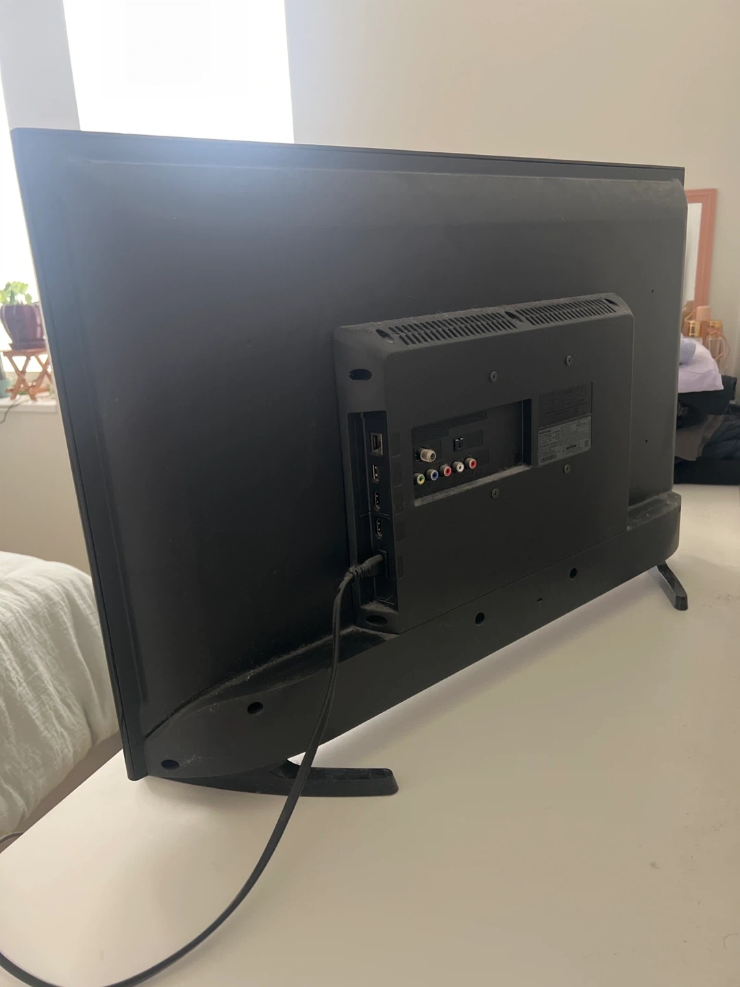 Samsung Smart TV in black. Includes remote control and power cord. Fully functional remote. Some cosmetic wear on one corner/edge, but all buttons work perfectly (see pictures). TV Works great!