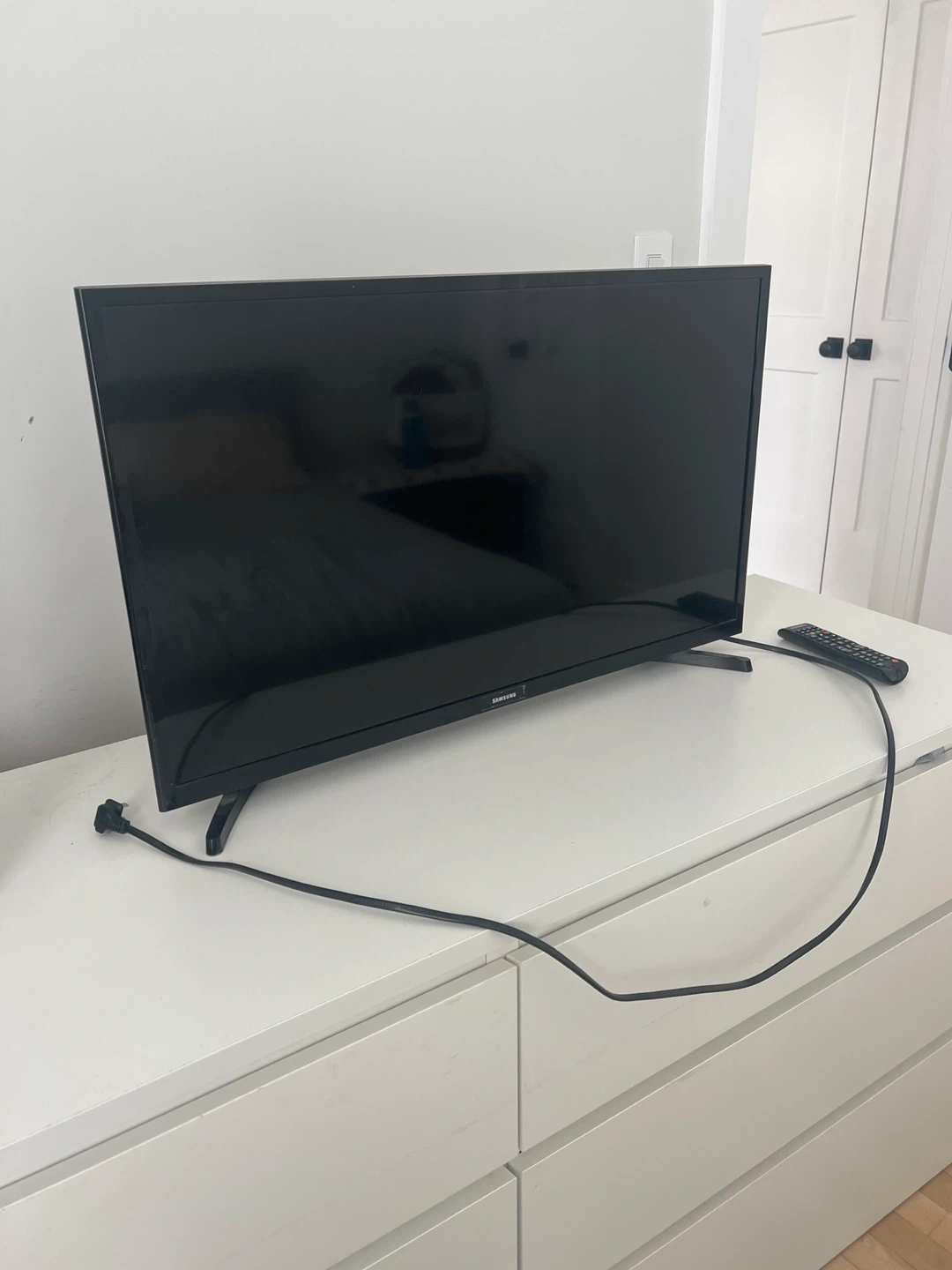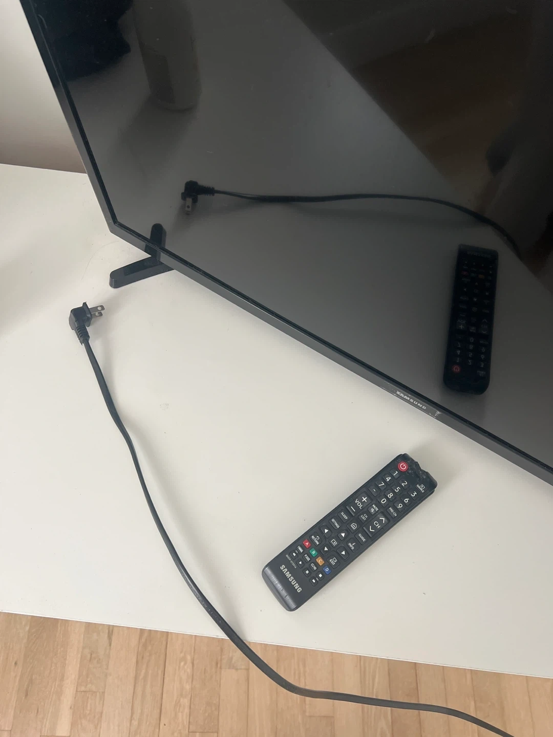 Samsung Smart TV in black. Includes remote control and power cord. Fully functional remote. Some cosmetic wear on one corner/edge, but all buttons work perfectly (see pictures). TV Works great!