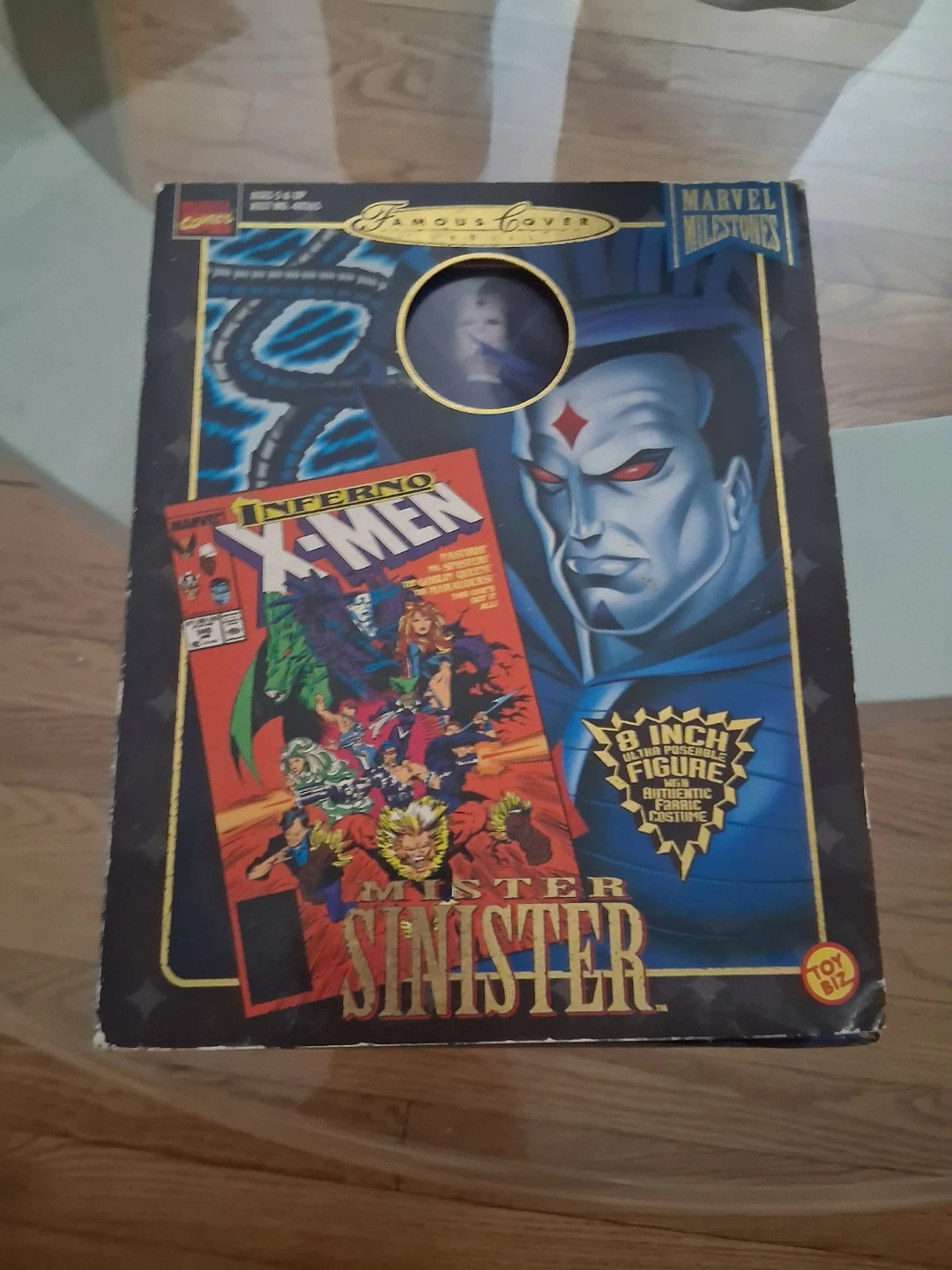 This Marvel Milestones Mister Sinister figure is an 8-inch ultra-posable collectible. It's based on the iconic 'Inferno X-Men' comic cover. Includes original packaging.
