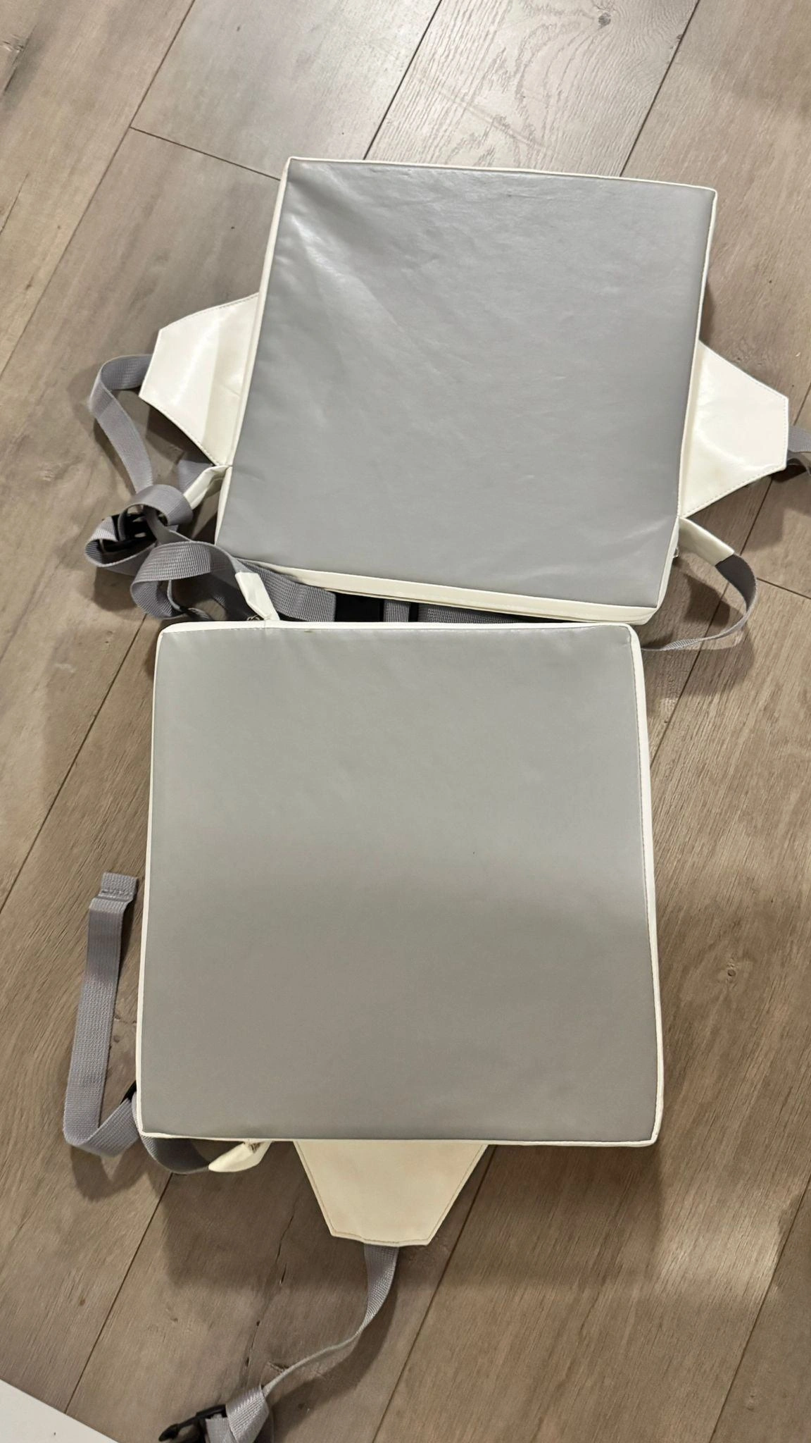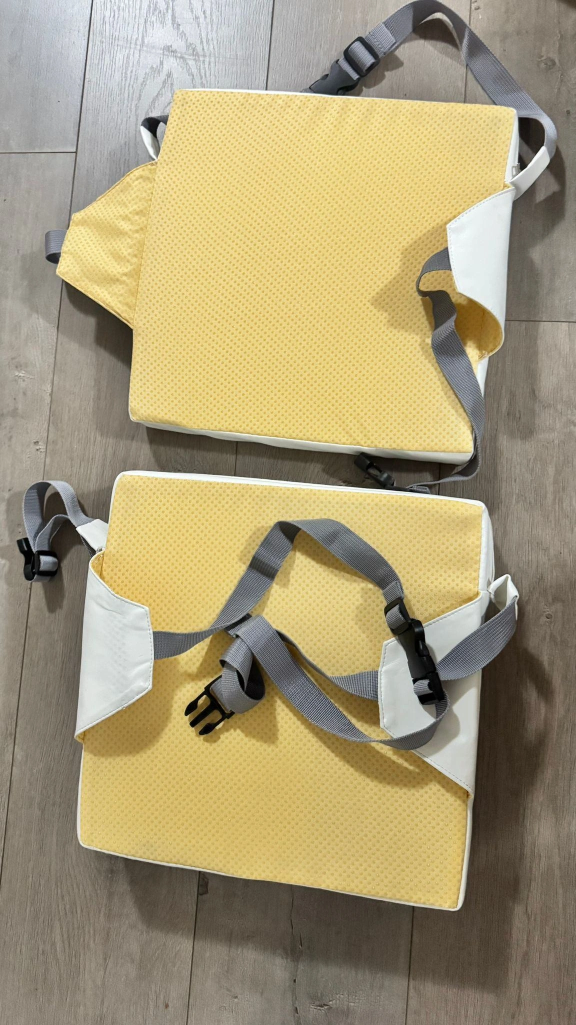 These portable baby booster seats are in great condition! They're perfect for travel or using at restaurants. The seats are grey and white on one side and yellow and white on the other, with grey straps. They’re lightweight and easy to carry around
