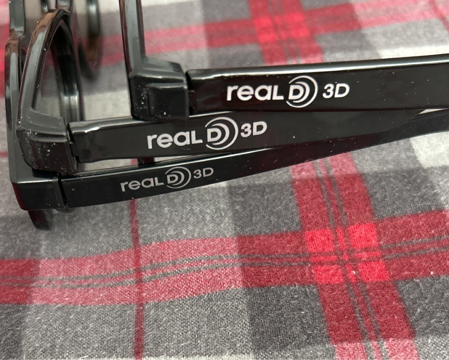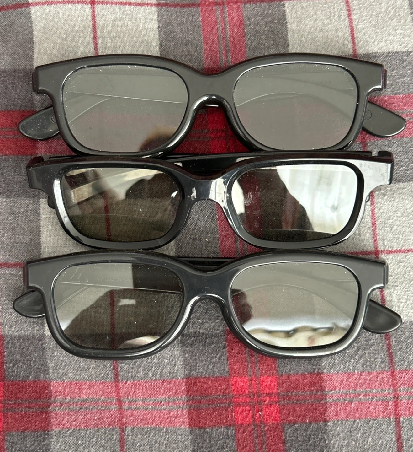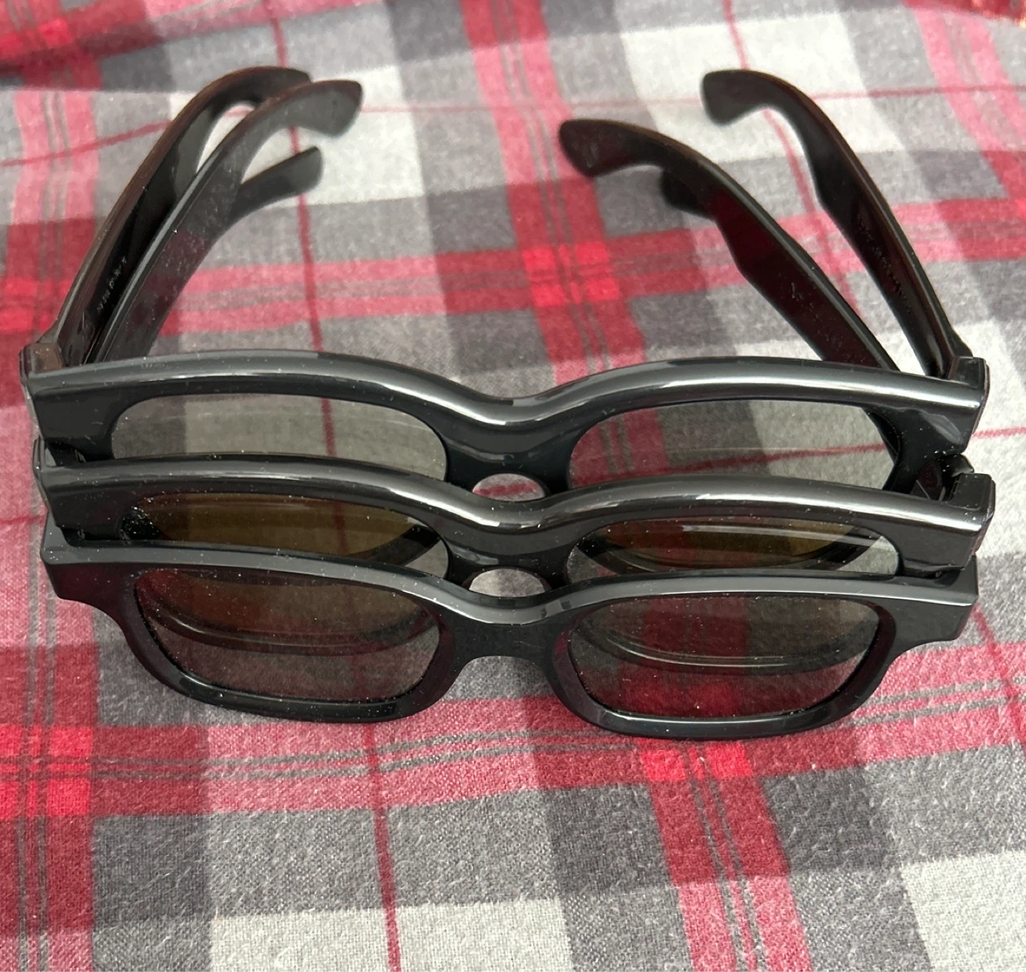 Three pairs of black RealD 3D glasses are included. They're made for watching 3D movies in theatres. These are passive polarized glasses.