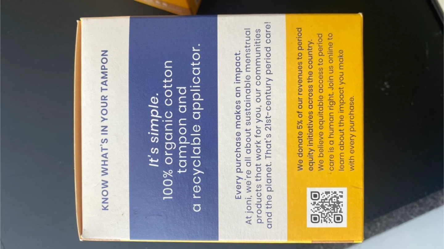Joni 100% organic cotton tampons come with a recyclable applicator. These regular tampons are designed for up to 8 hours of protection. Two boxes included, each containing 16 tampons.