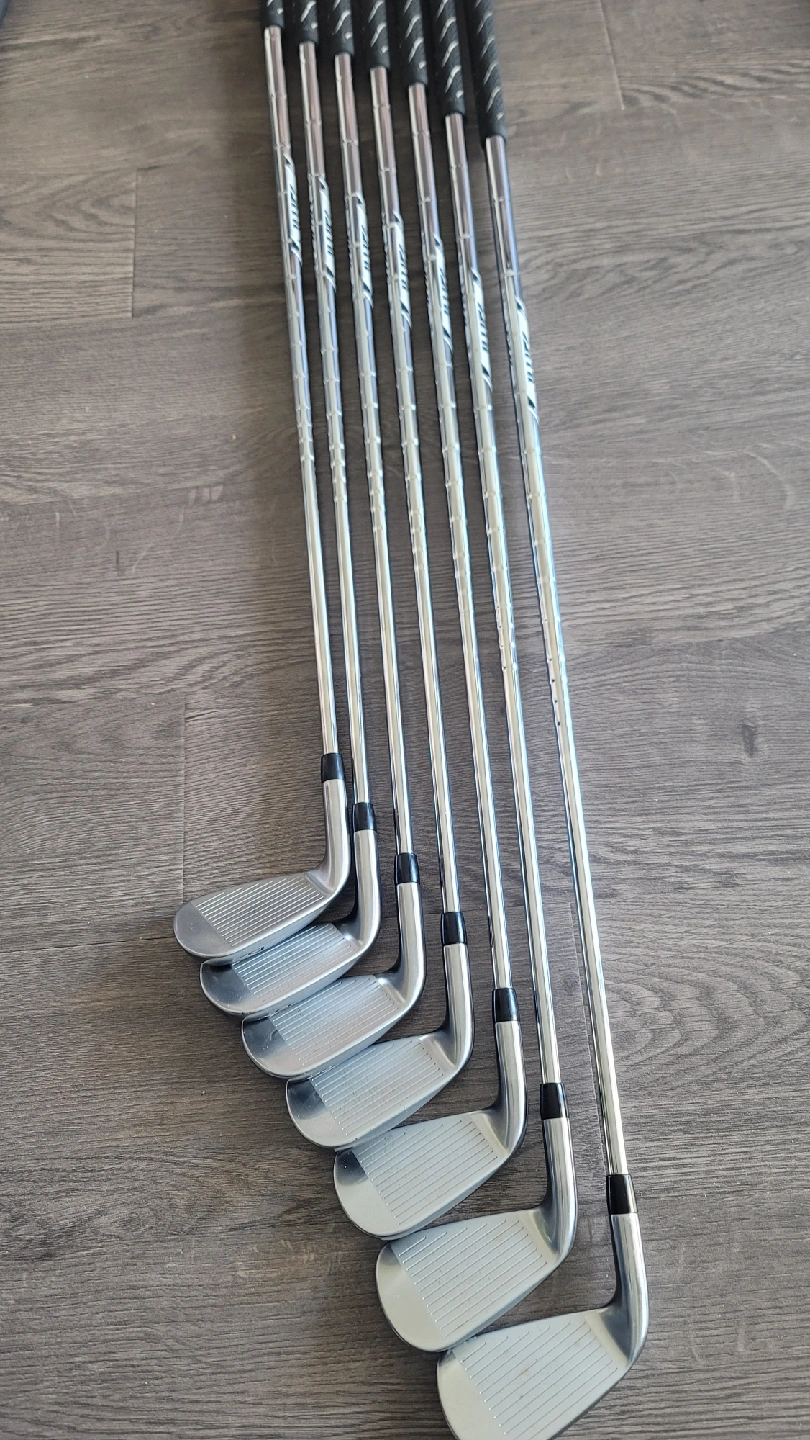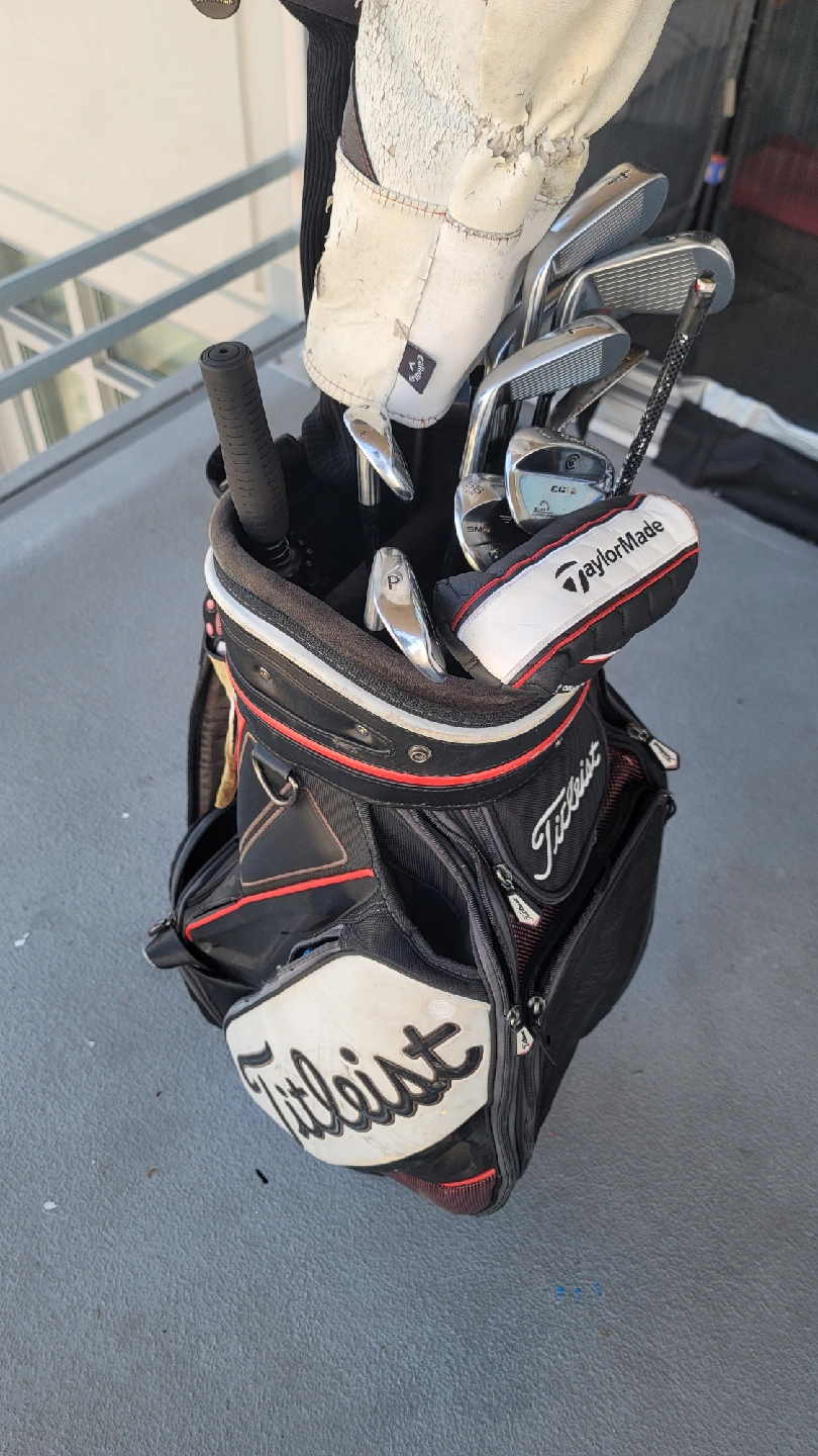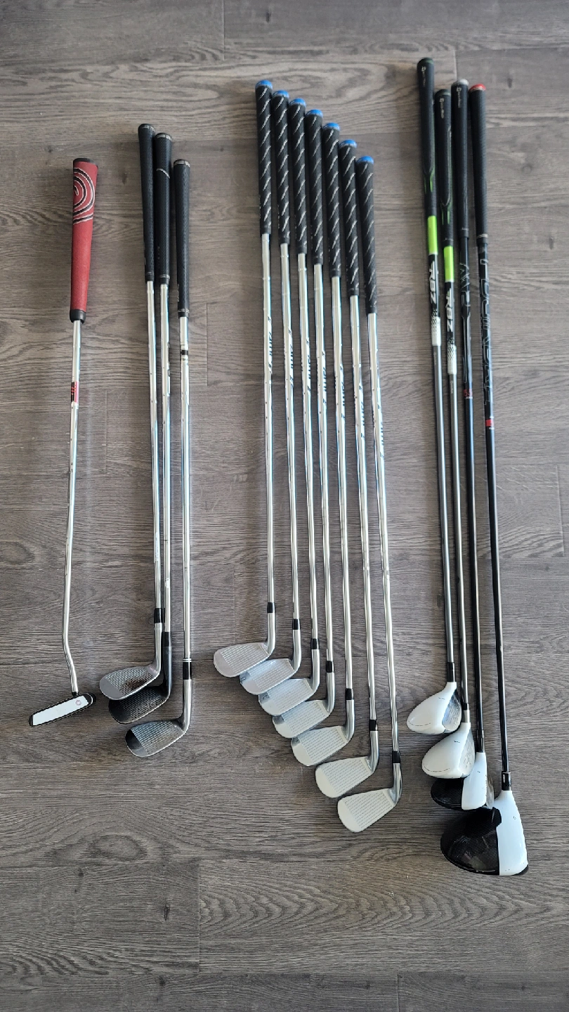 Selling a set of used golf clubs. • Irons 4-PW... 7 Titleist AP3 shafts S300 • Driver, 3-wood, 3-wood, 4-wood utility wood, R shaft, 4-wood utility wood S shaft • Wedges 58°, 52°, 48°, shaft wedge flex... Shows signs of use. • Putter... Odyssey •The bag zipper is in poor condition, so I can provide it if needed.