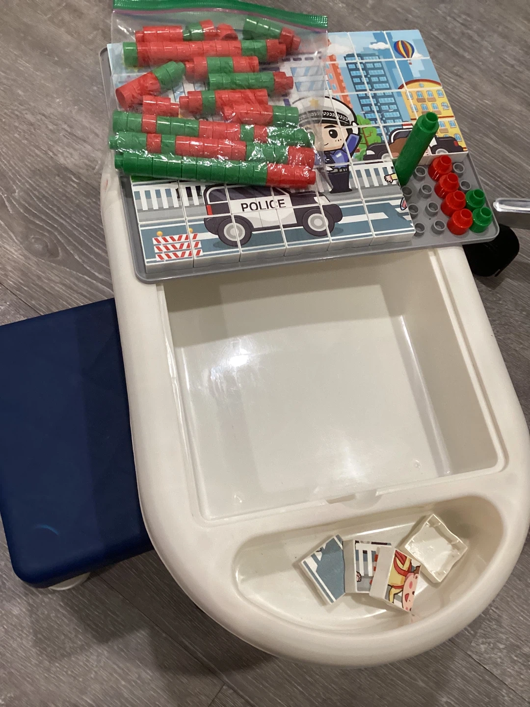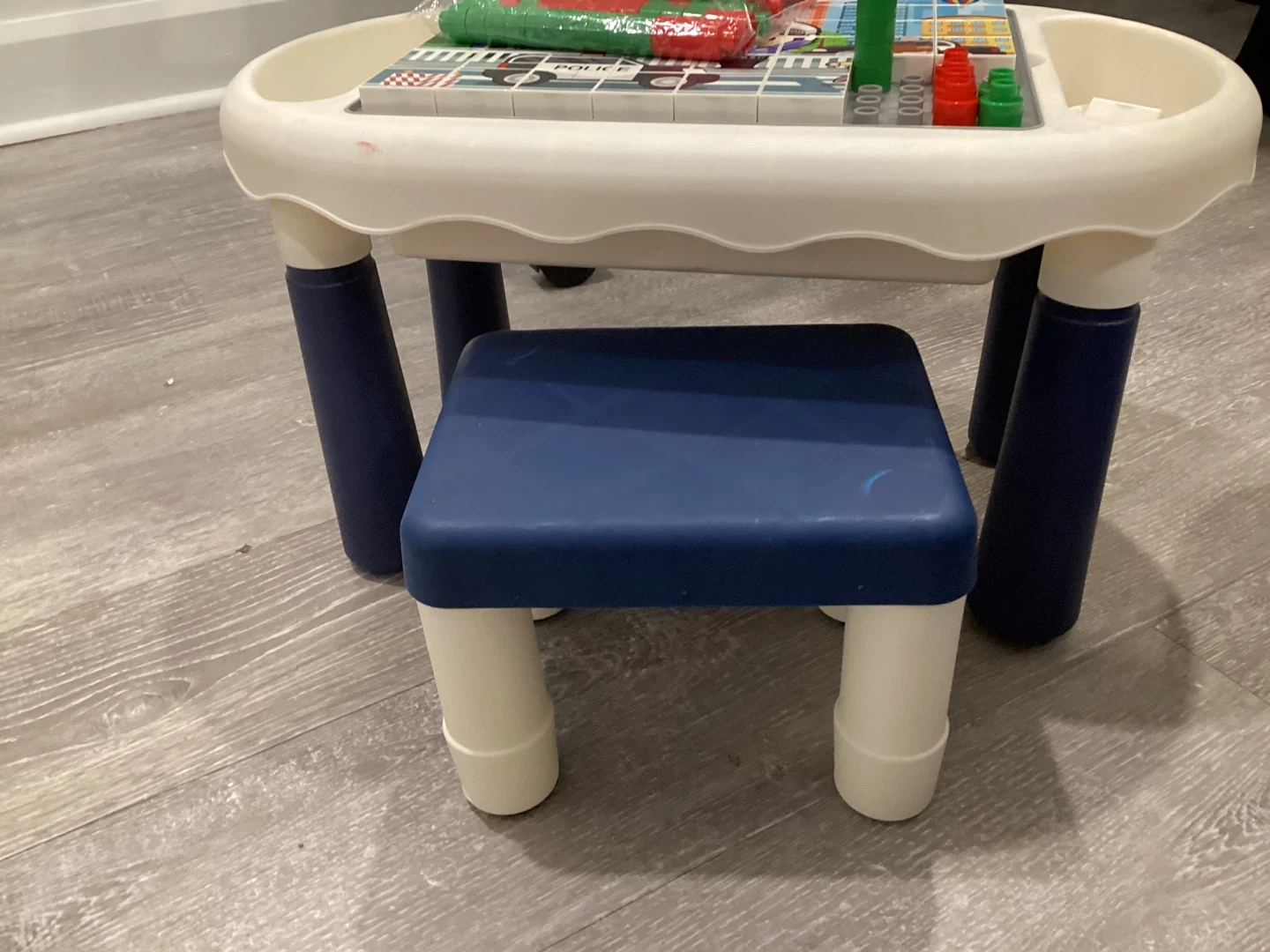 White and blue activity table with a drawing board surface and blue stool. It comes with building blocks and a puzzle insert.
