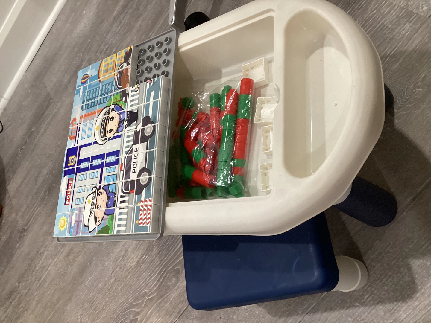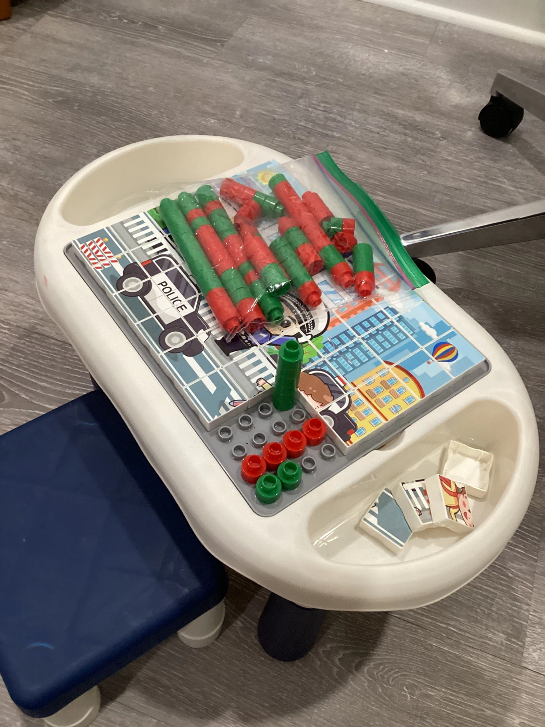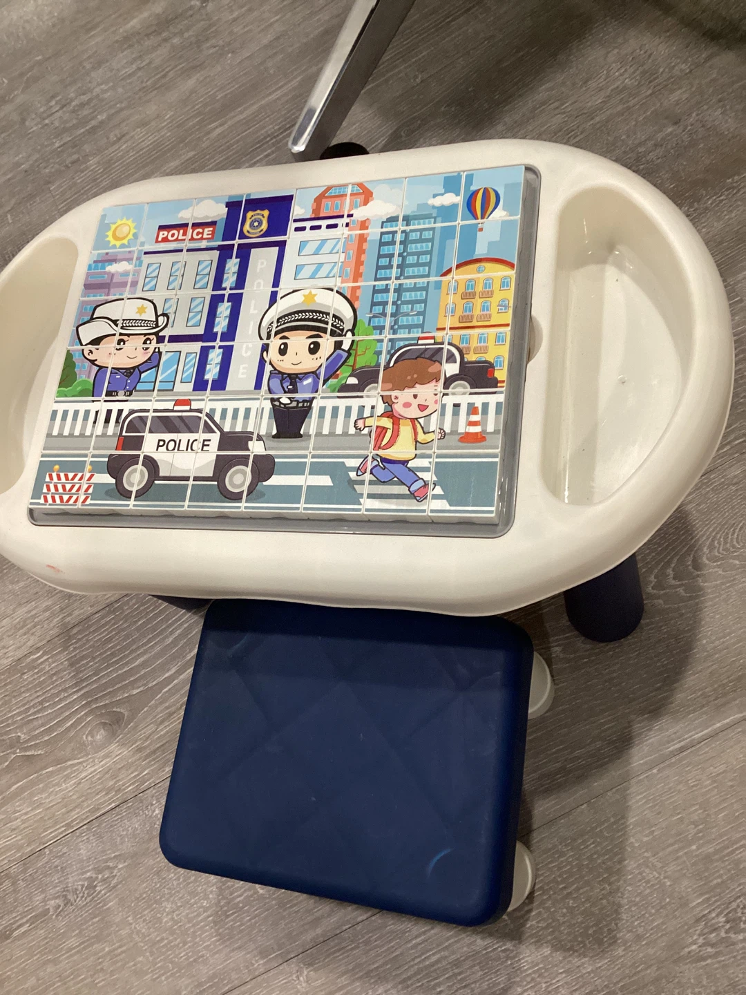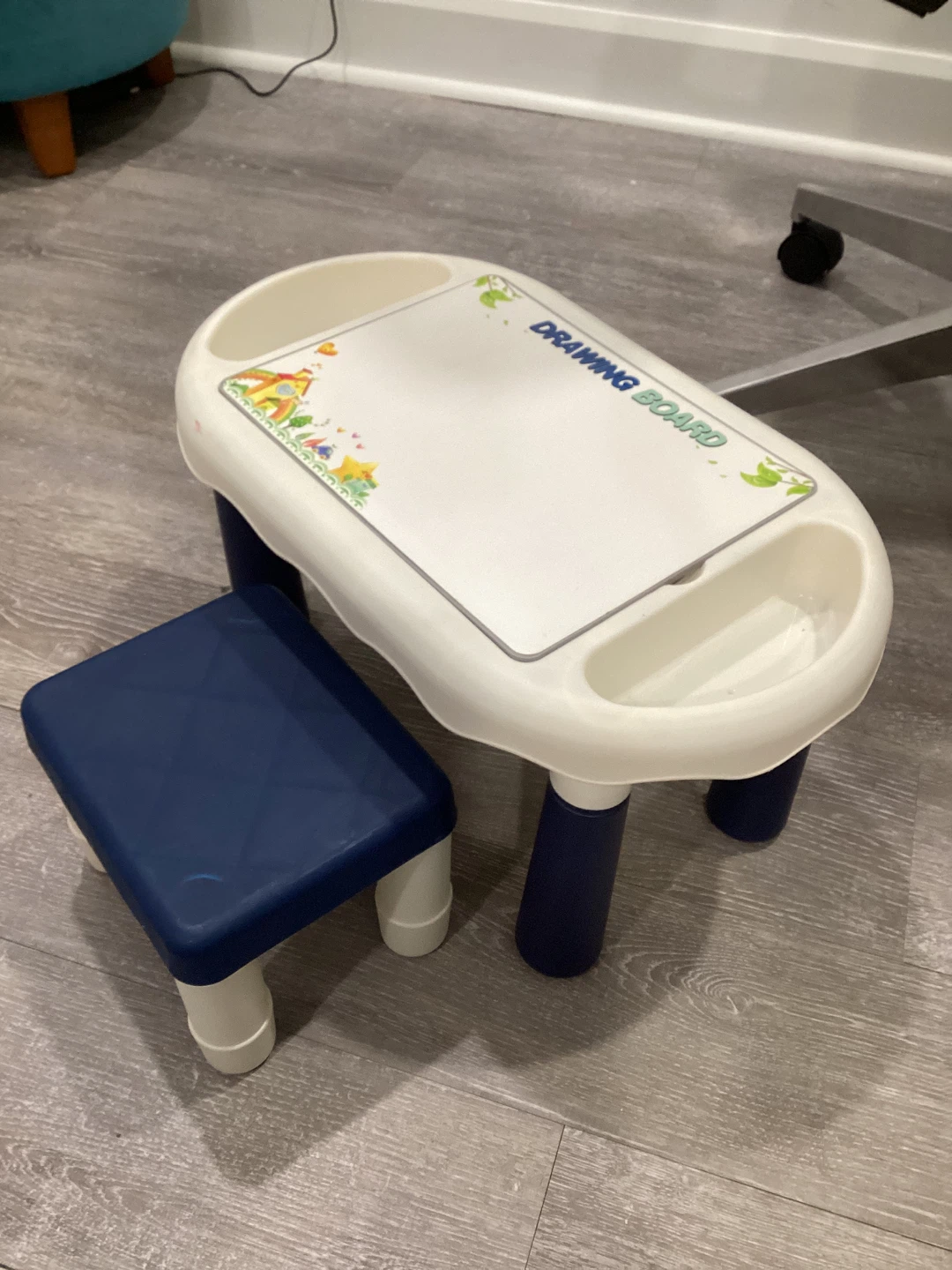 White and blue activity table with a drawing board surface and blue stool. It comes with building blocks and a puzzle insert.