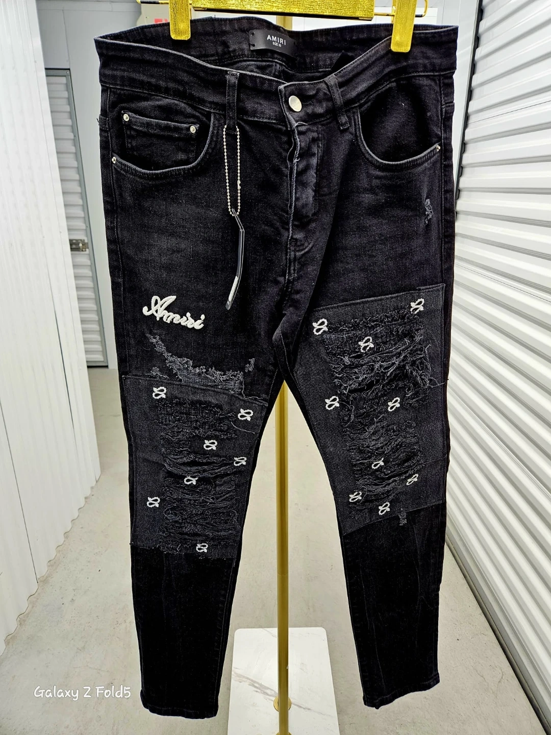 Selling a pair of Amiri jeans in size 33. They have a cool, distressed look with unique detailing. Great for adding some edge to your wardrobe!