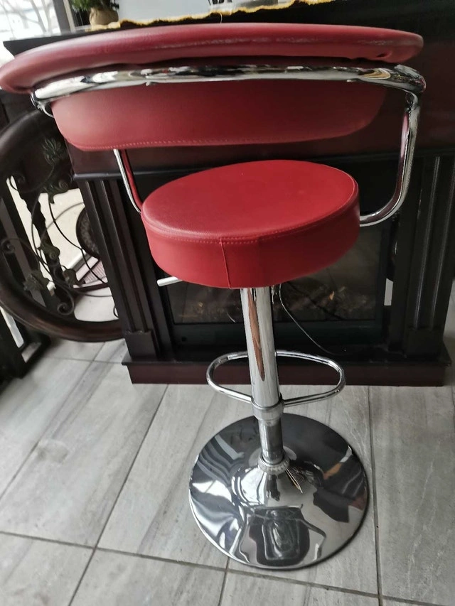 Set of 2 used bar stools, perfect for adding a pop of colour to your kitchen or bar area. These stools feature a vibrant red seat and backrest, complemented by a sleek, chrome-finished base and armrests, offering both style and comfort. The height is adjustable. Please see the images for details on their condition.