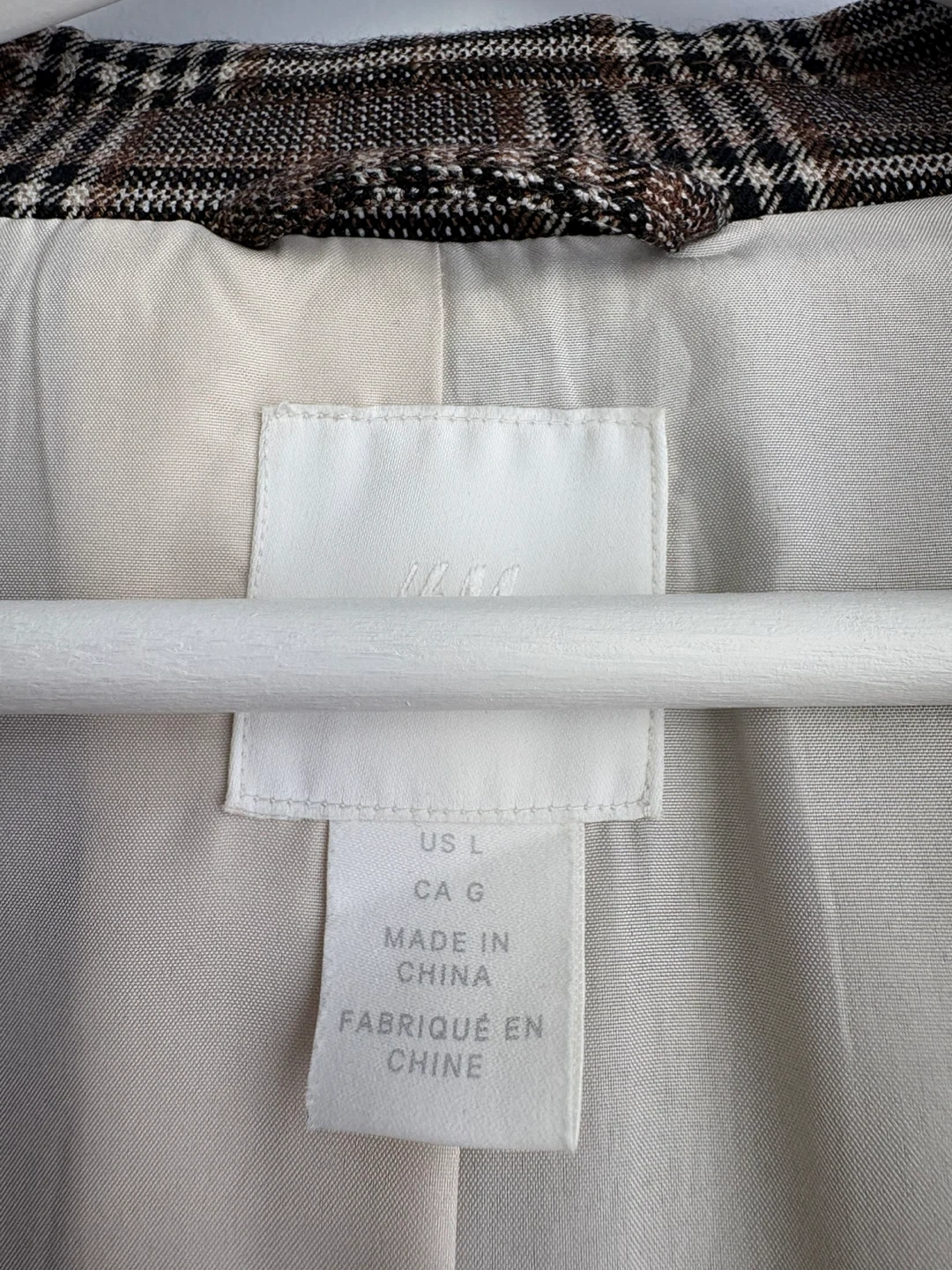 This is an H&M plaid double-breasted blazer in size L. This blazer's classic plaid pattern and double-breasted design make it a versatile piece. It's suitable for layering over various outfits for a polished look.