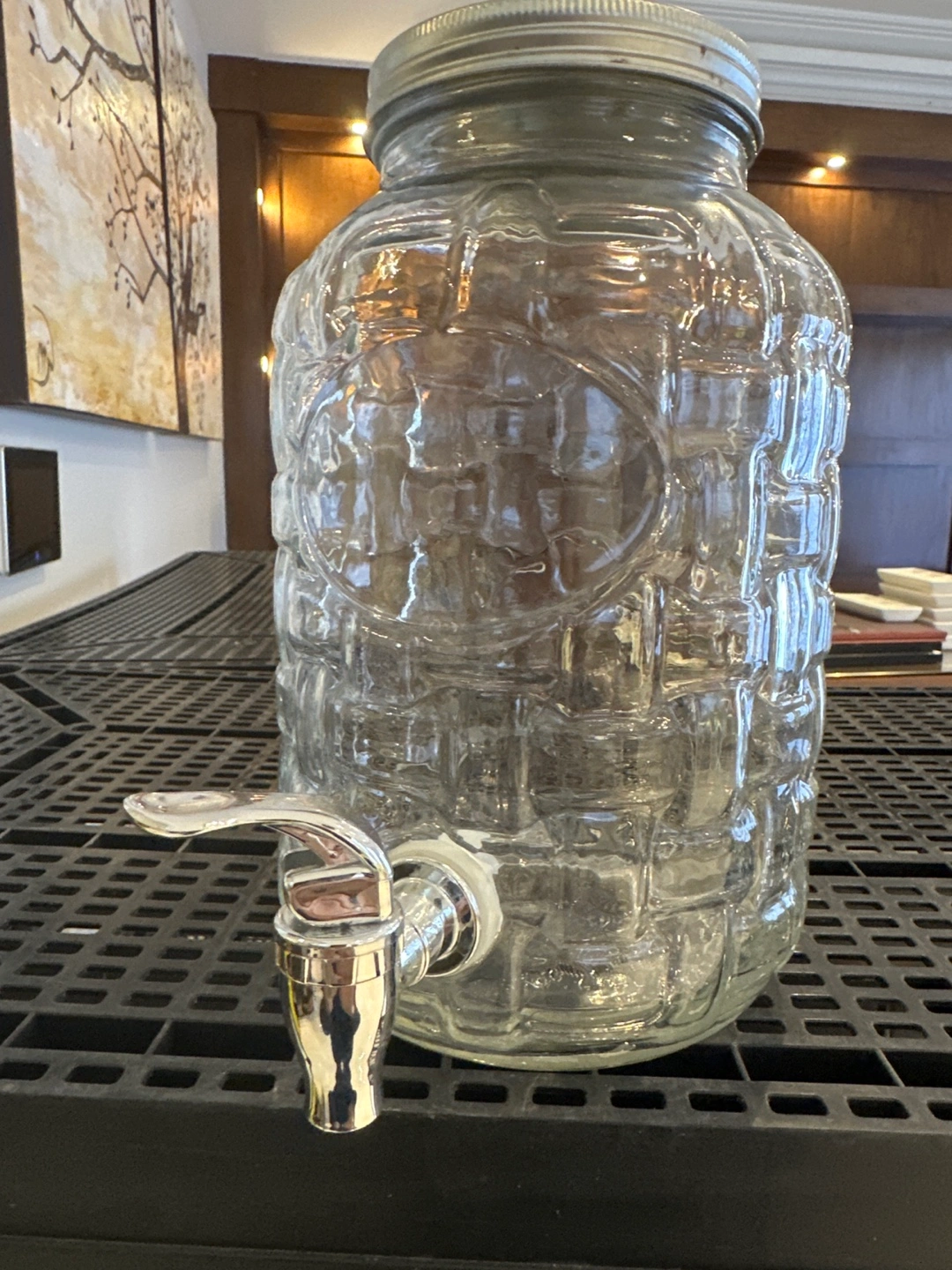 Clear glass beverage dispenser. Features a woven pattern and a metal spigot. Perfect for parties or self-serve drinks.