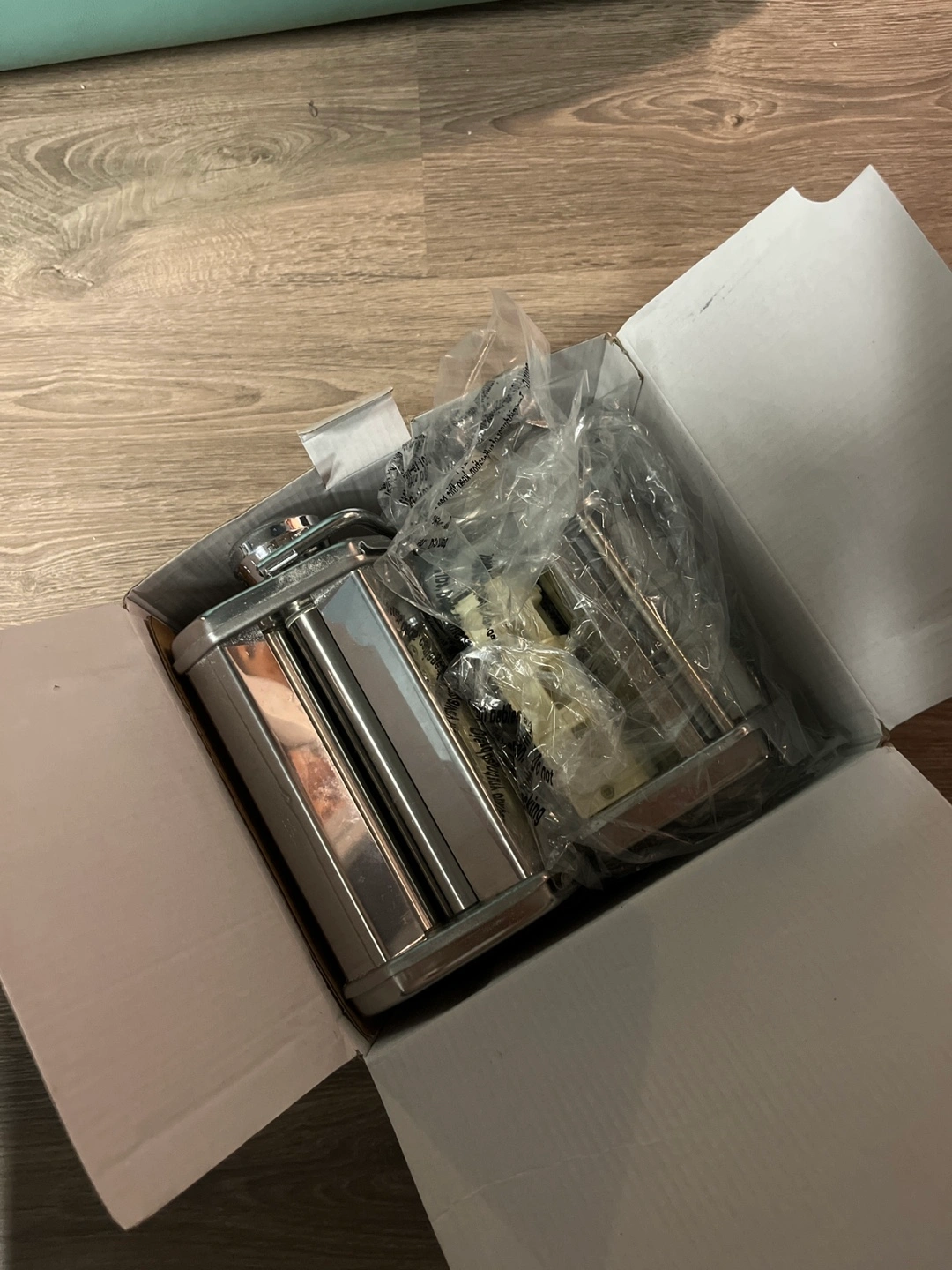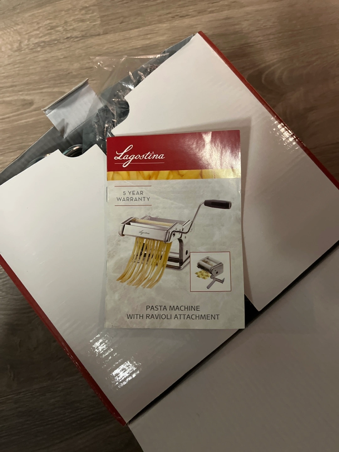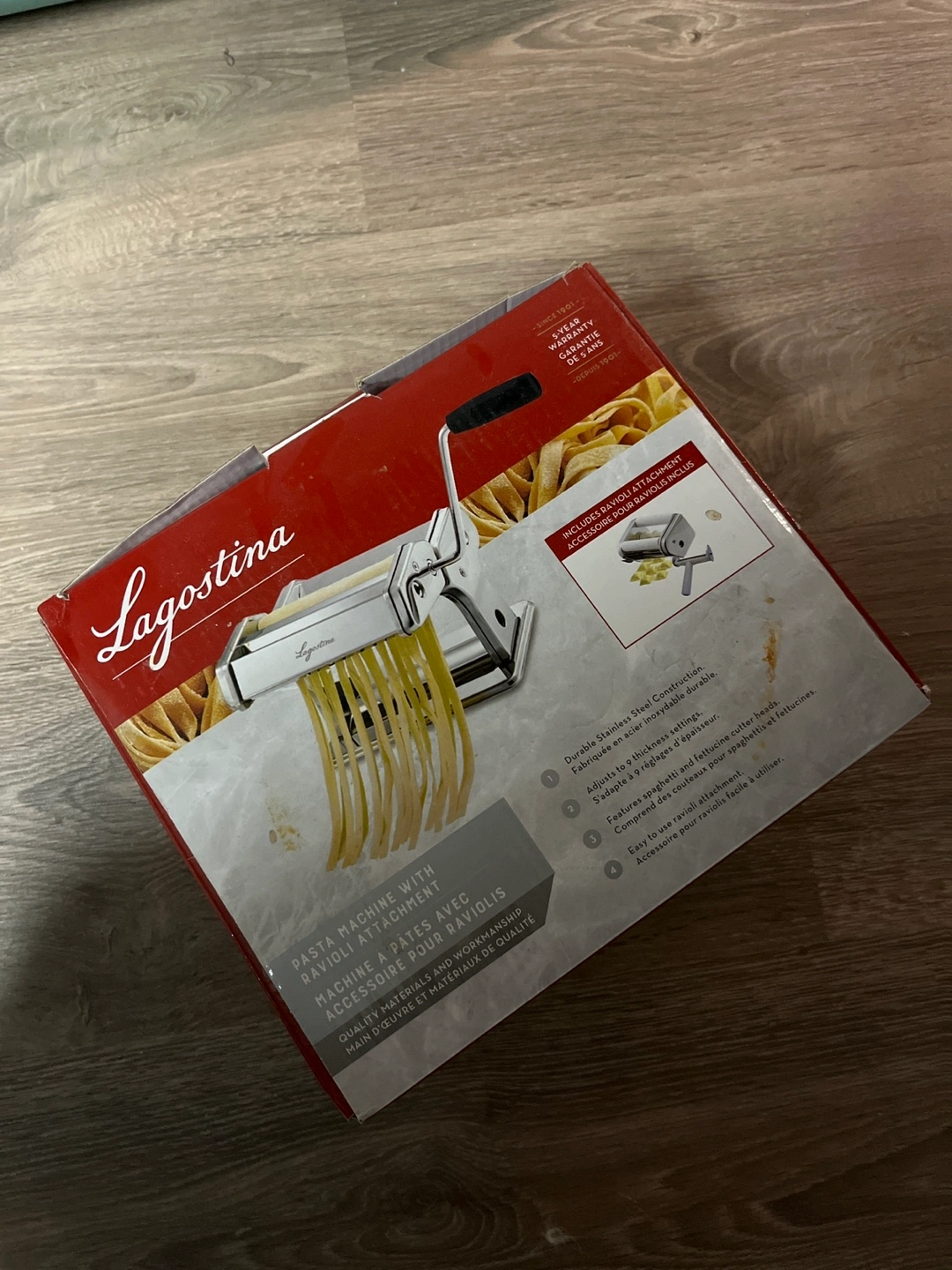 Stainless steel pasta machine with ravioli attachment. Includes box and instructions.