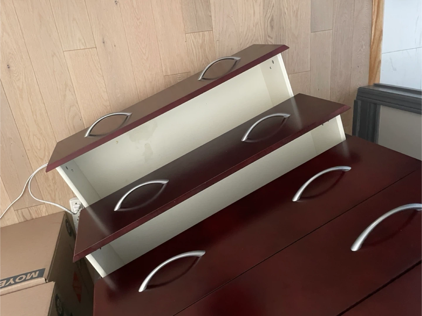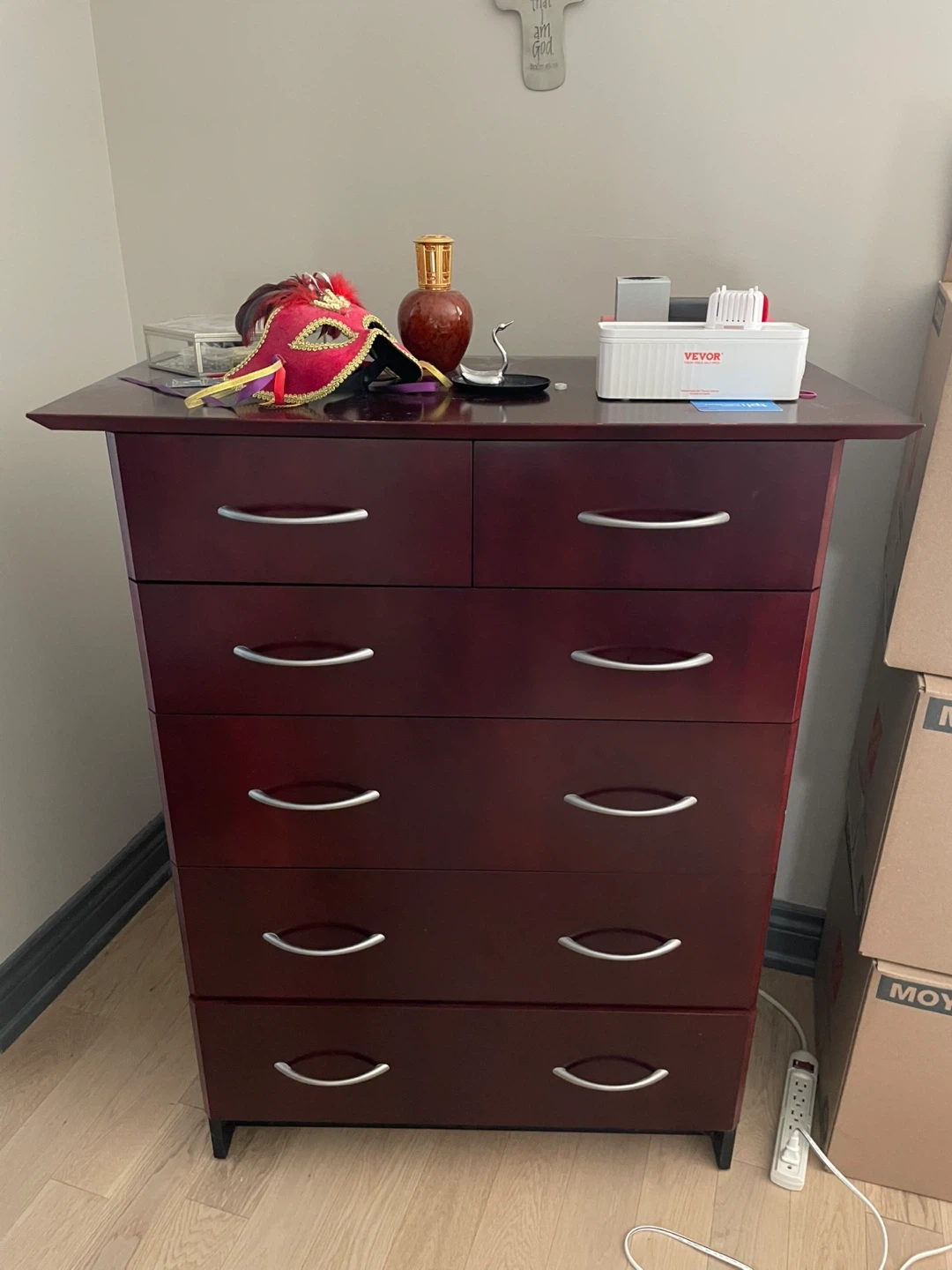 Dark cherry finish dresser with six drawers. Each drawer has a sleek silver handle. Offers ample storage space for your belongings.