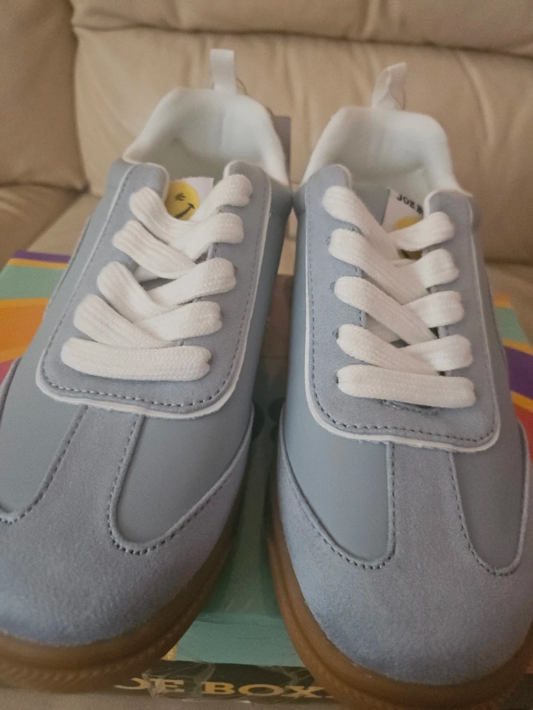 Girls Joe Boxer kids' sneakers in a light blue color. These shoes feature a fun smiley face emblem and a classic . Size 1