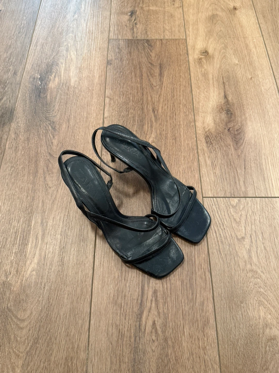 ZARA black heeled sandals with strappy detail. Square toe design. These heels have a stylish, minimalist look.