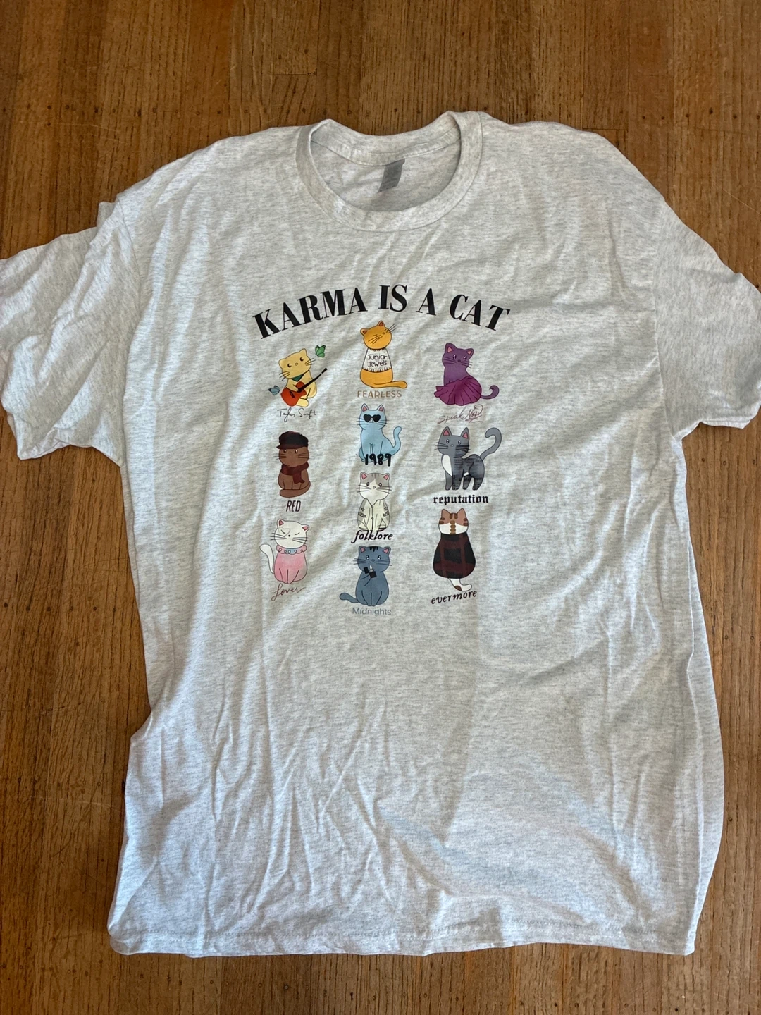 Grey t-shirt featuring "Karma is a Cat" graphic with 10 different cat illustrations representing Taylor Swift albums. Cotton blend material. Crew neck, short sleeves.