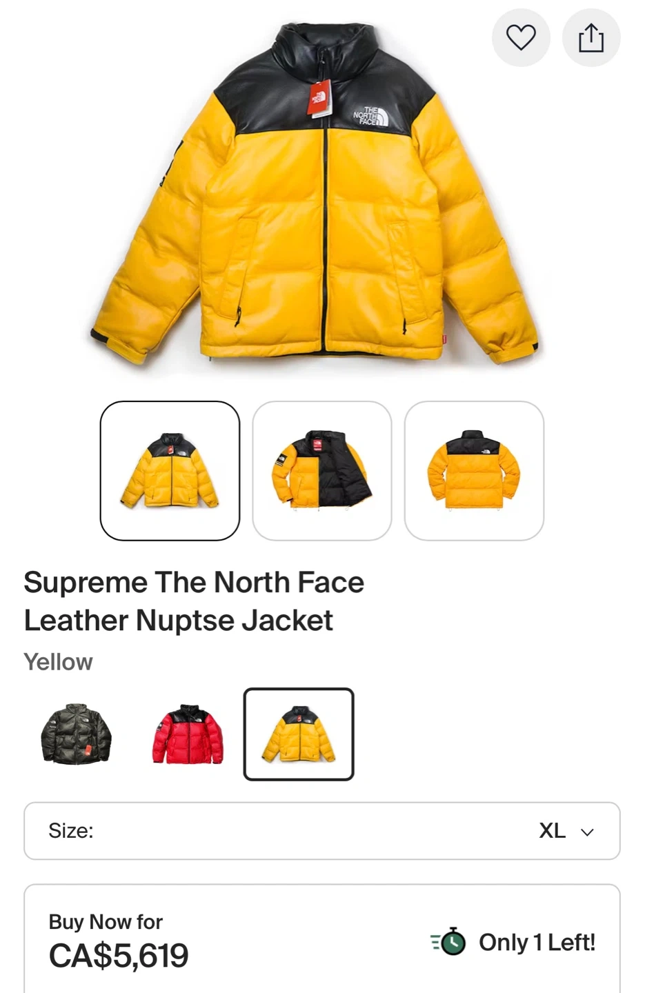 Yellow and black leather puffer jacket from Supreme and The North Face collaboration. Features '700' fill. Size XL.