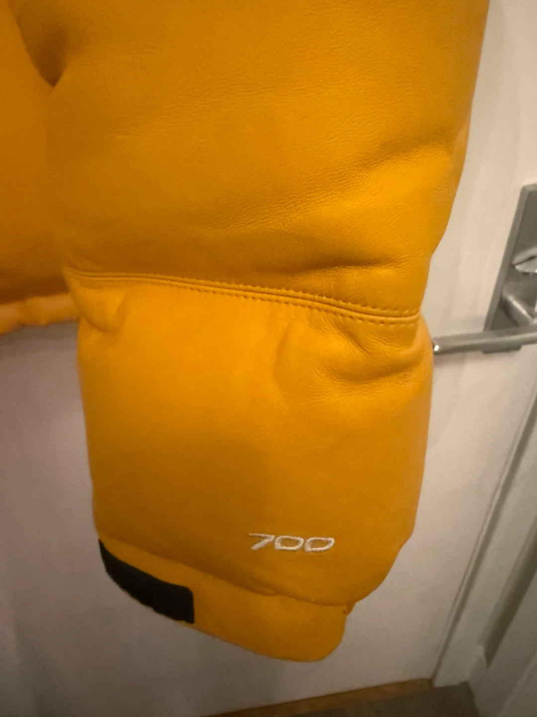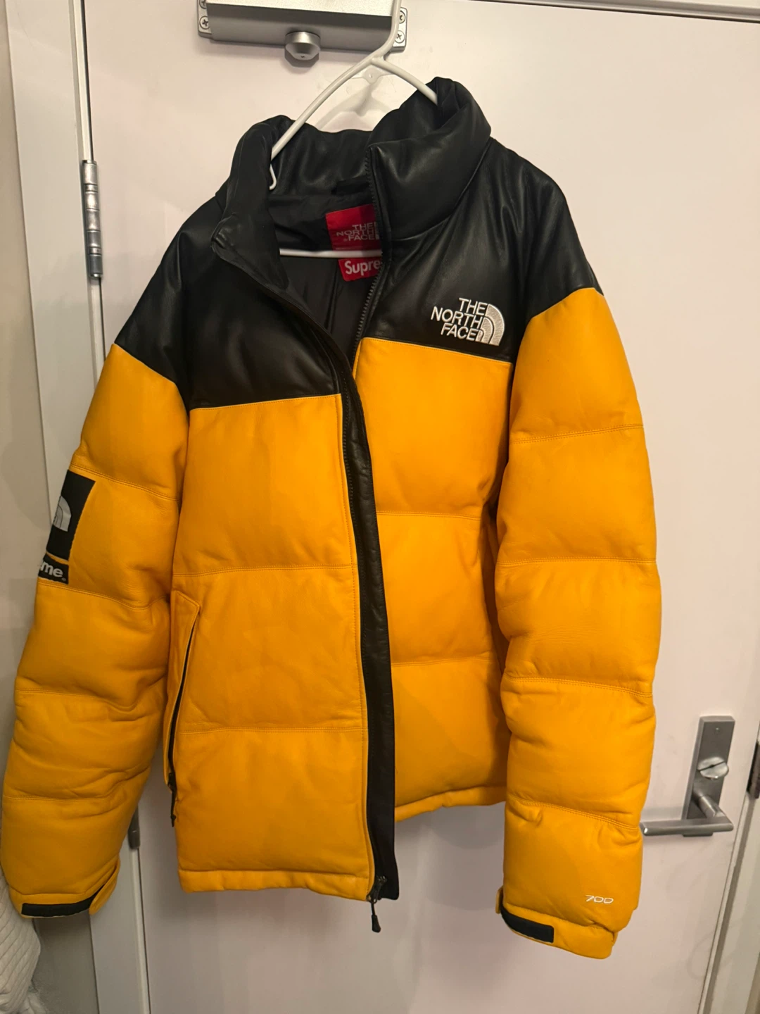 Yellow and black leather puffer jacket from Supreme and The North Face collaboration. Features '700' fill. Size XL.
