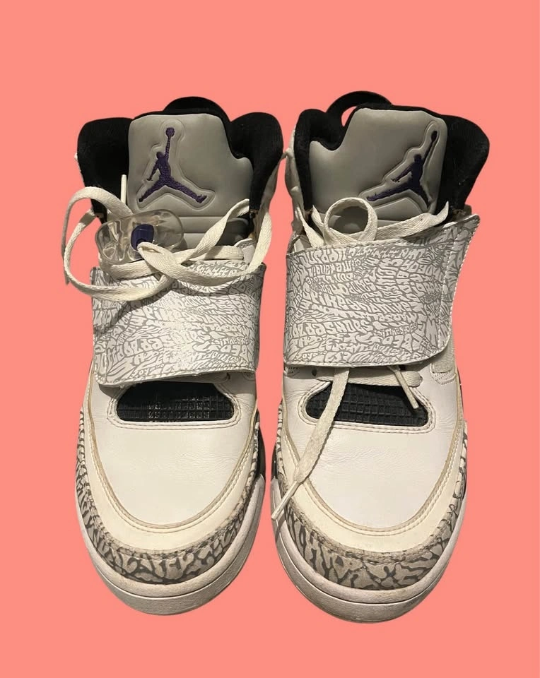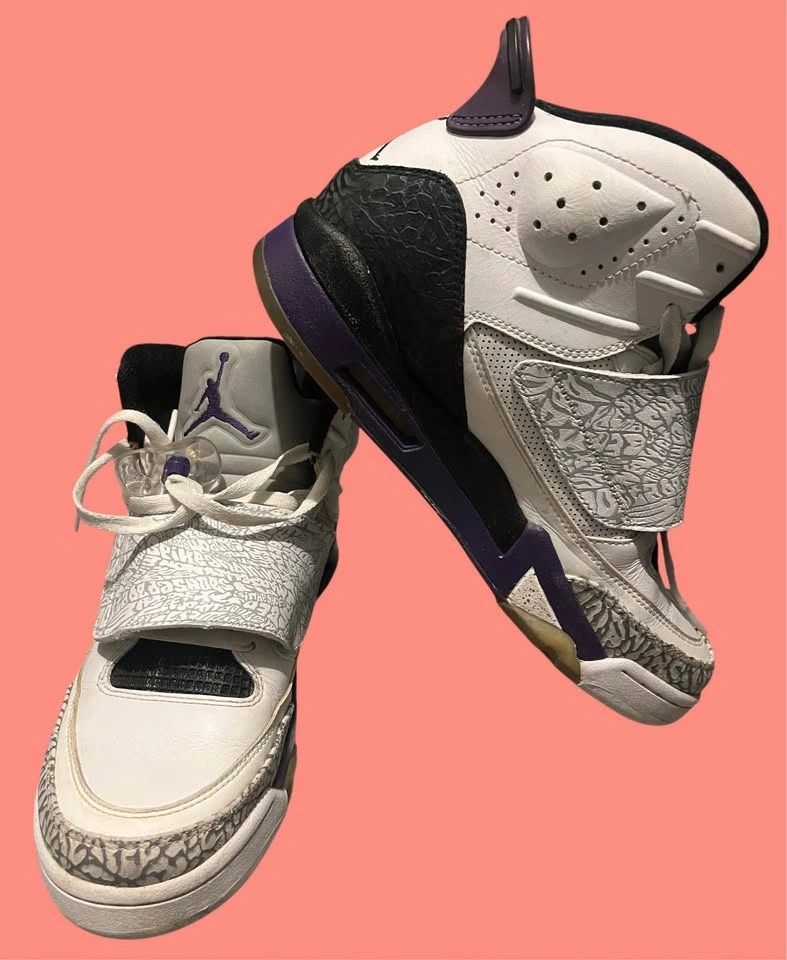Jordan Son of Mars (White/Grey Elephant Print, Purple Accents) hybrid sneakers. Clean uppers, elephant print panels intact. No rips or separation. Comfortable and eye-catching Jordan design. $180 OBO.