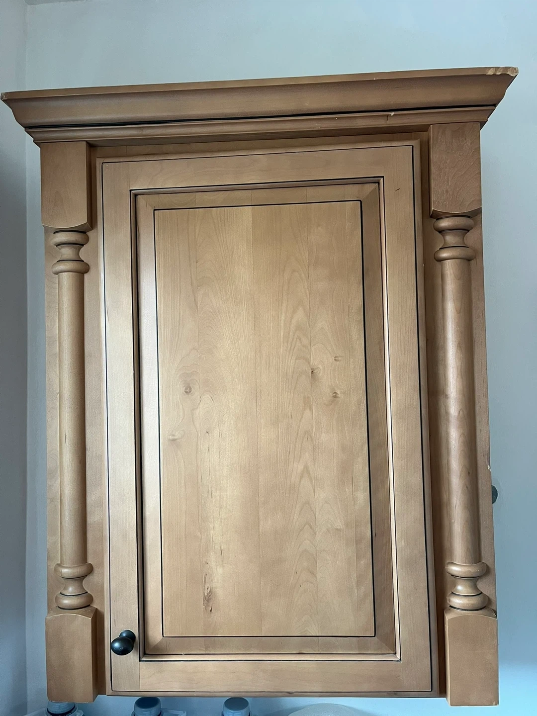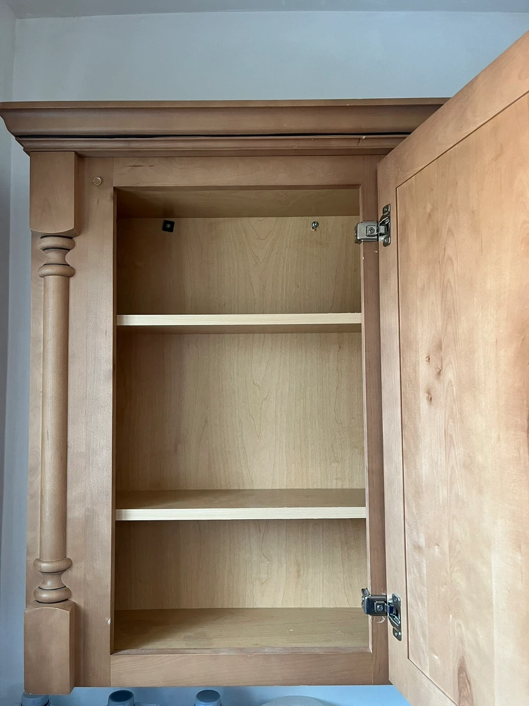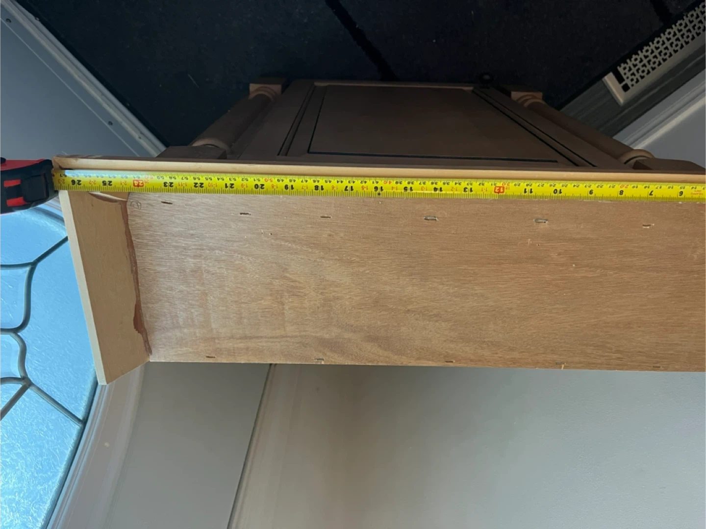 Light brown High Quality Real wood storage / Pharmacy / Bathroom cabinet with decorative trim. It has three shelves inside. Approximate dimensions are 25" W x 21" D x 25" H.