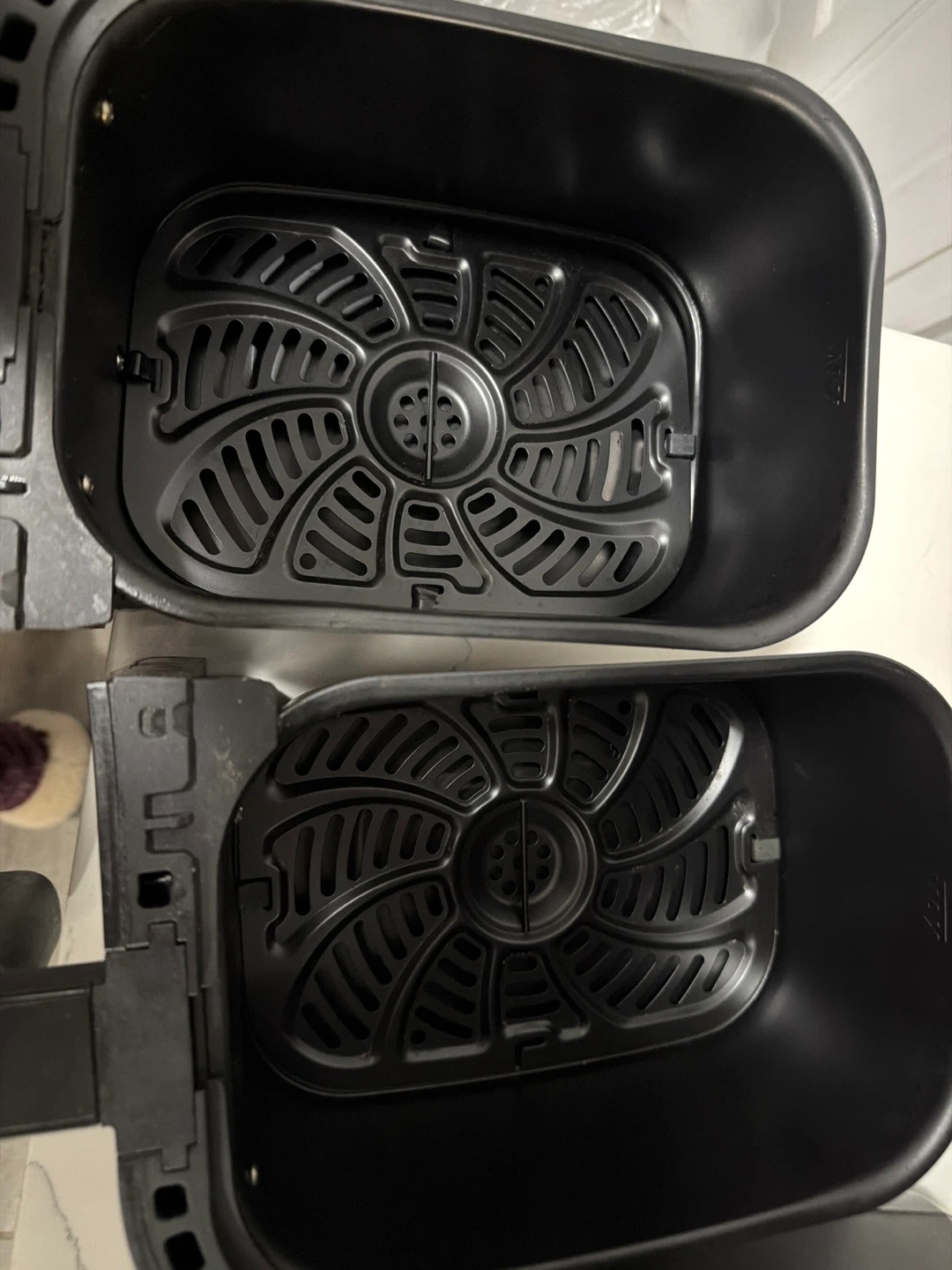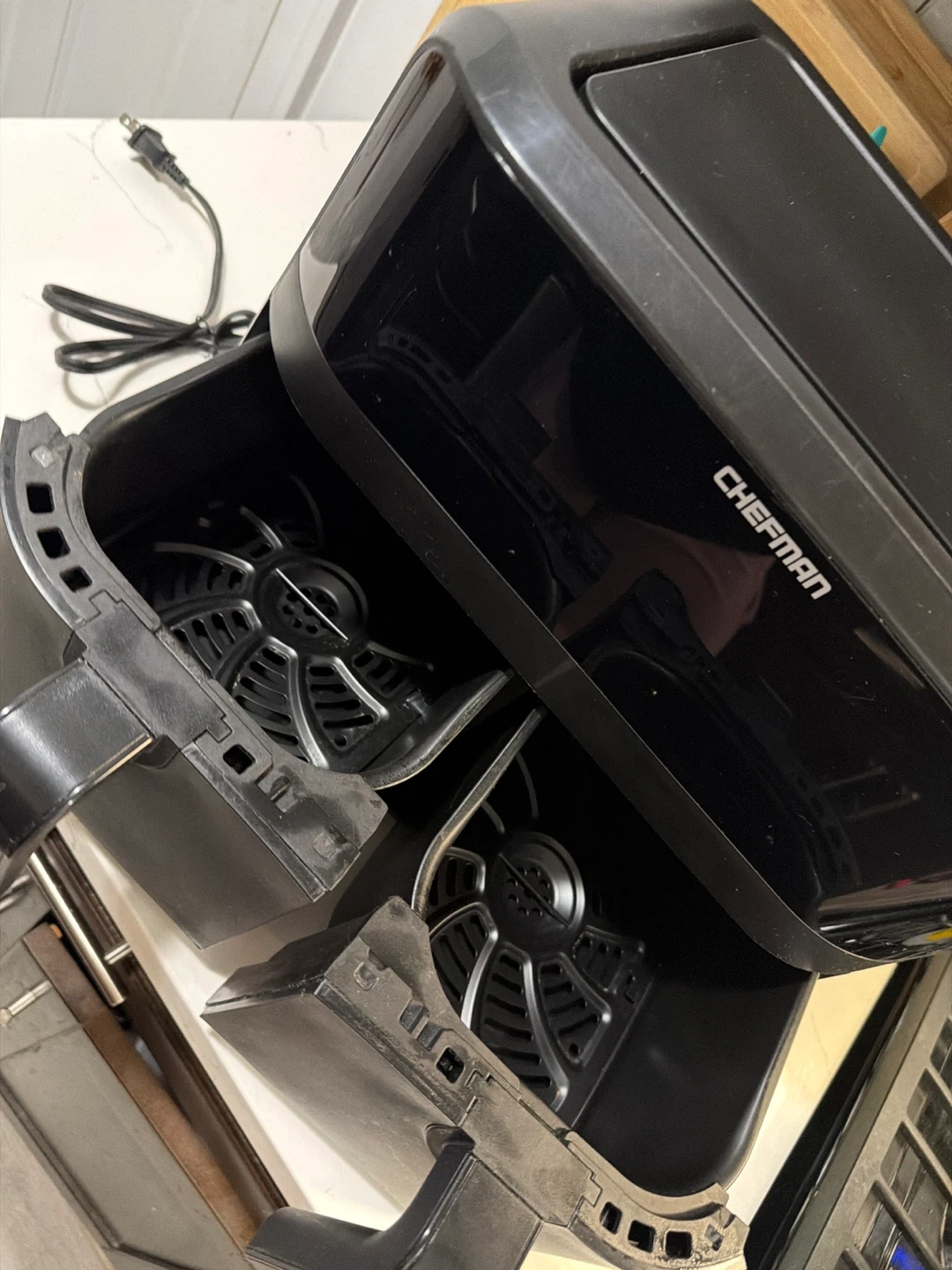 This black Chefman dual basket air fryer is in good condition. It features two independent baskets for cooking different foods simultaneously. Great for busy people who like quick meals!