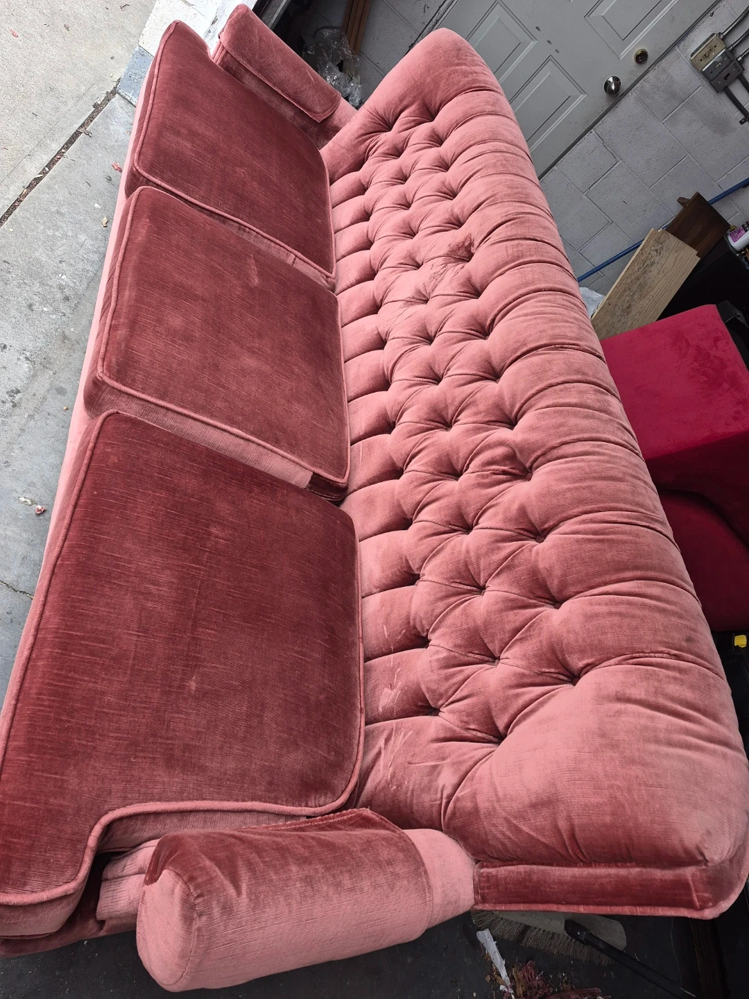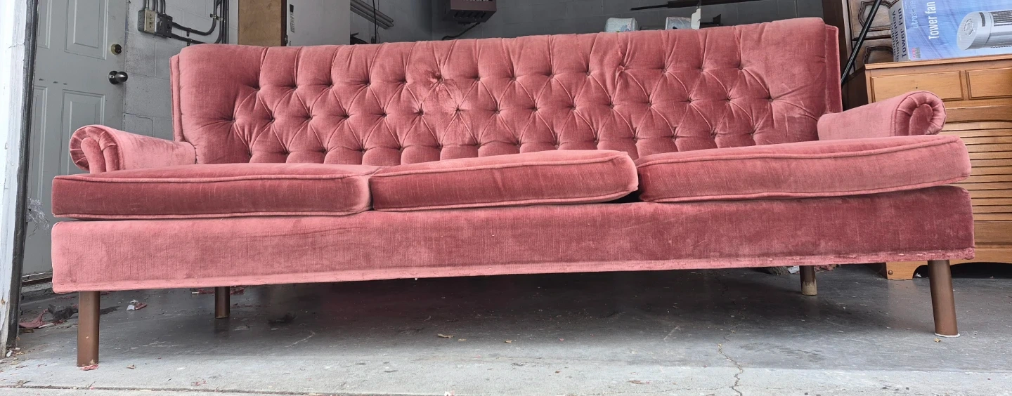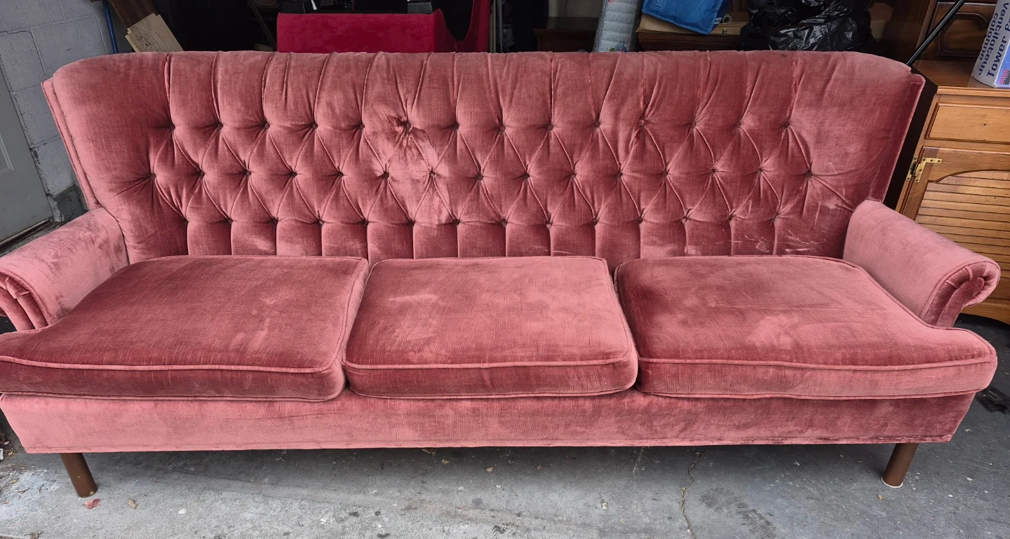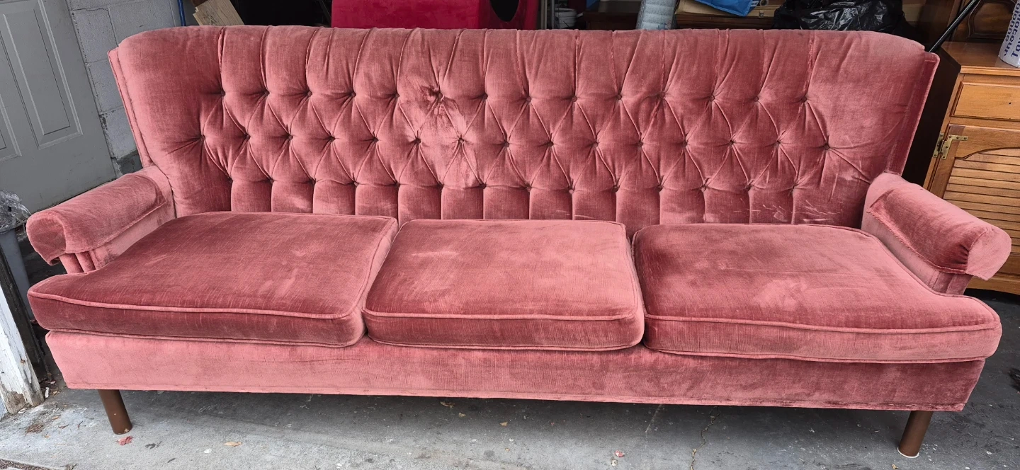 A lovely rose velvet sofa with a tufted back and three seat cushions. It's got a classic design that'll add charm to any room. This sofa's upholstery is velvet.