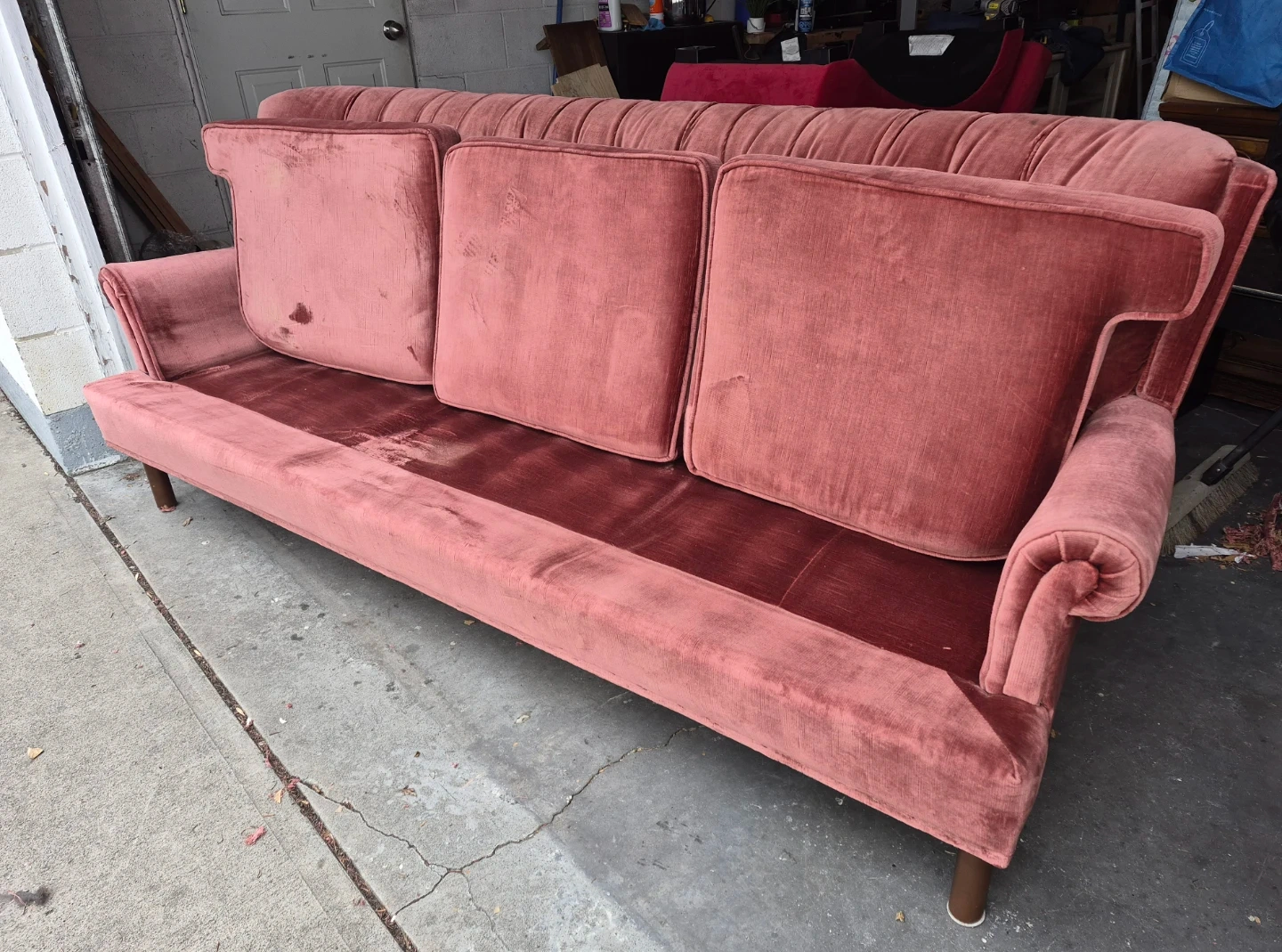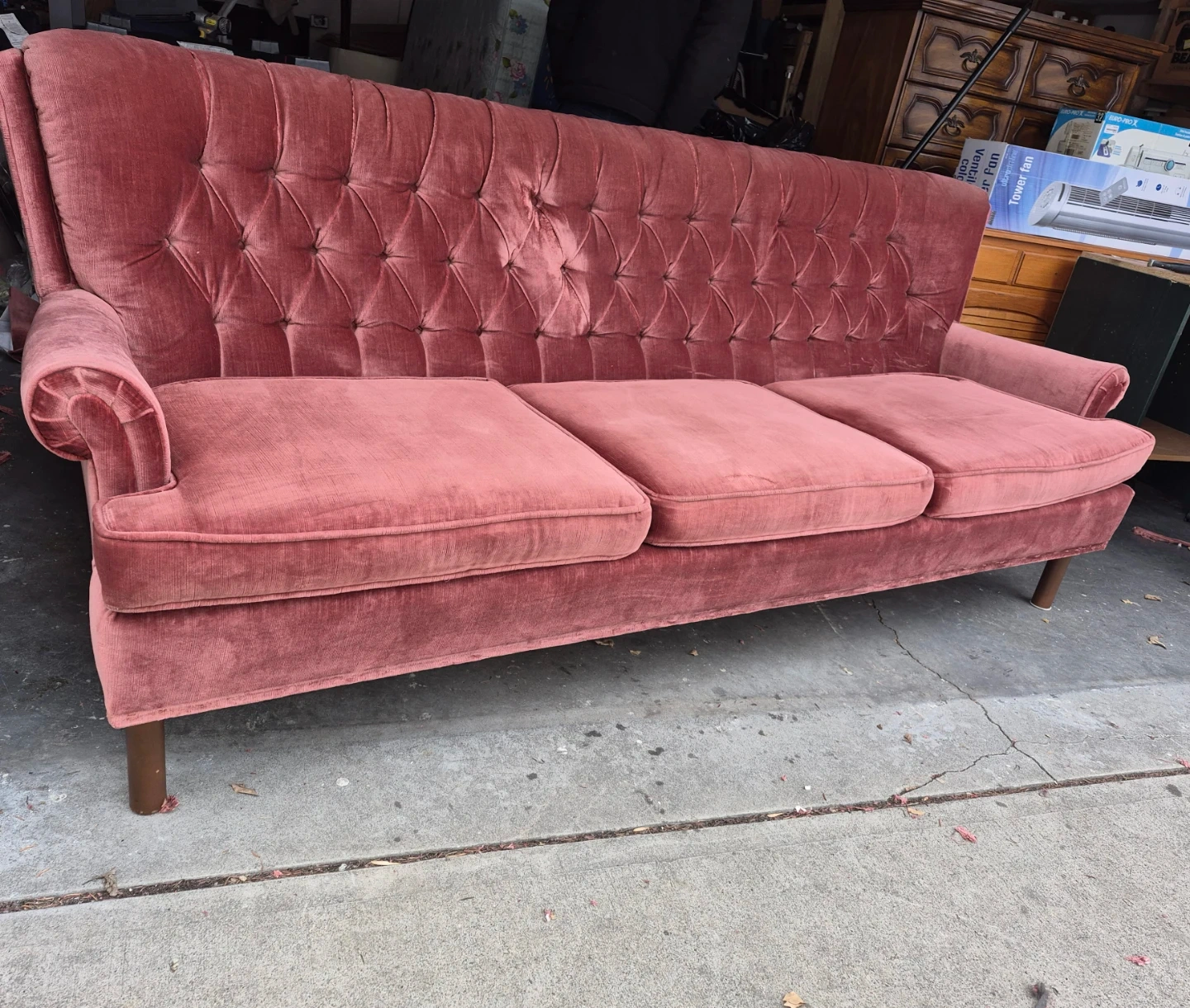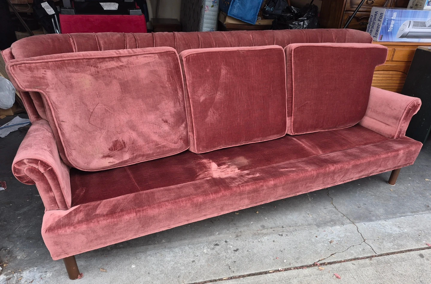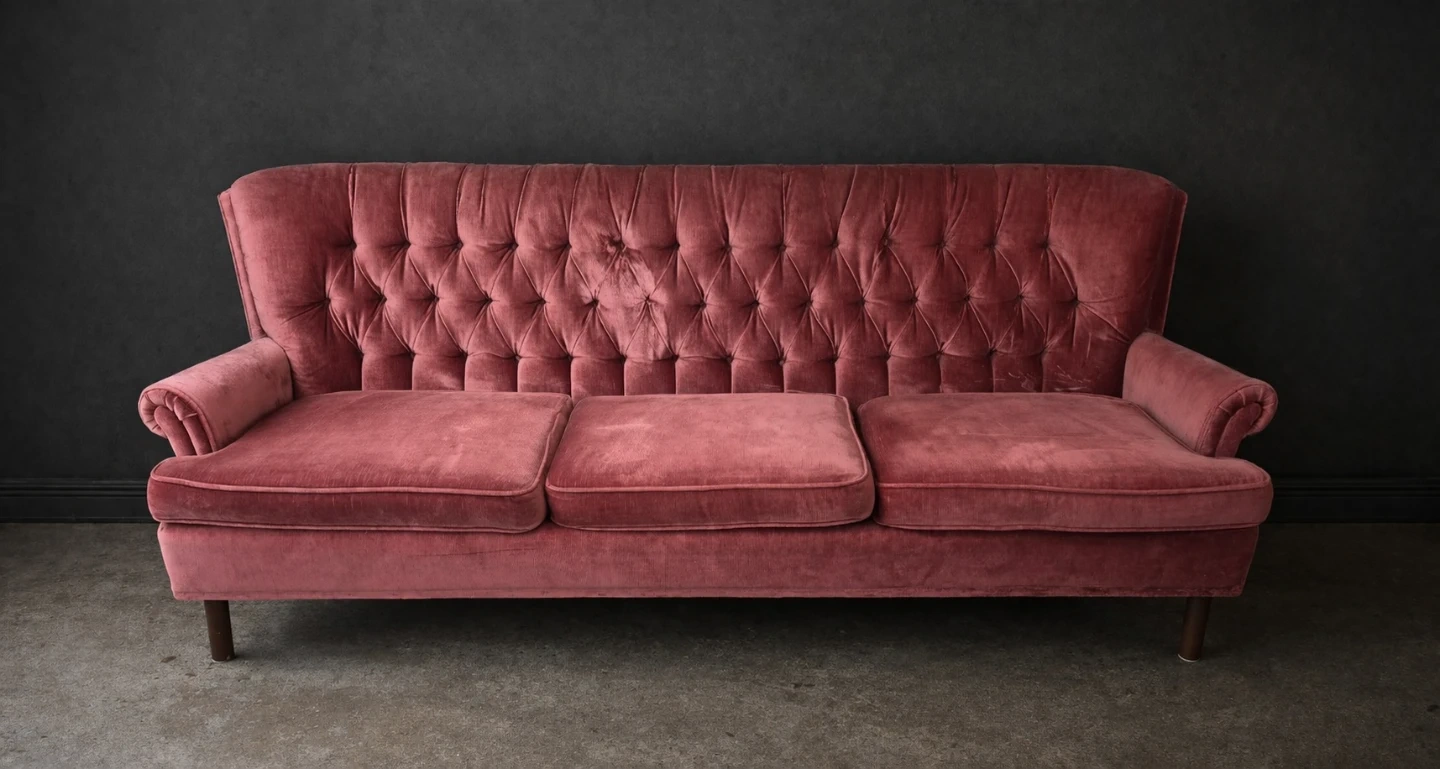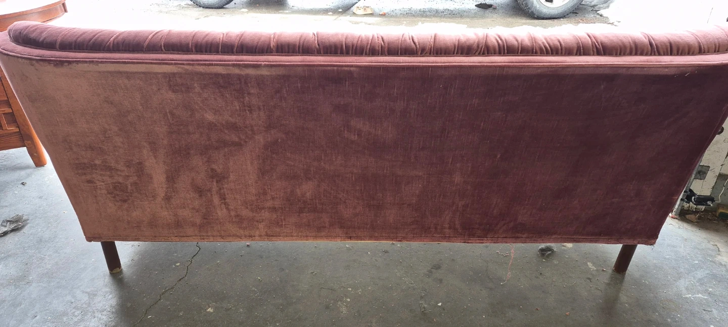 A lovely rose velvet sofa with a tufted back and three seat cushions. It's got a classic design that'll add charm to any room. This sofa's upholstery is velvet.