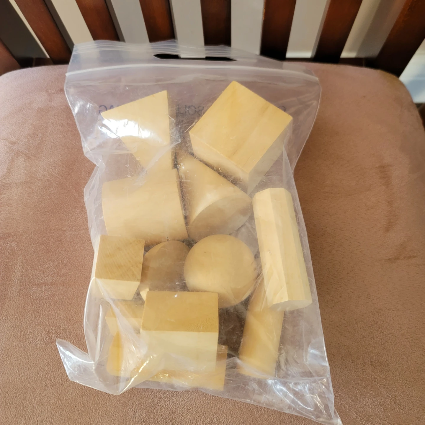 This is a collection of various wooden geometric shapes. They're made of light-coloured wood. This set would be useful for teaching basic shapes or for crafting projects.