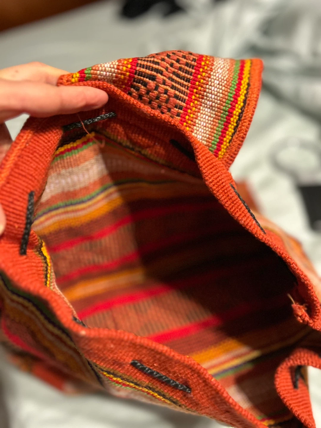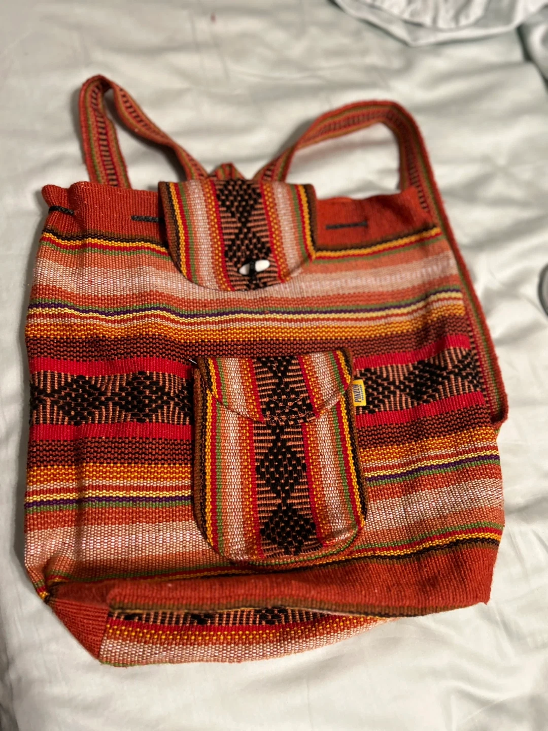 Art from México., unisex. This is a colorful striped woven backpack, perfect for carrying your essentials! It features a drawstring closure and adjustable straps. It has a unique and vibrant design with a front pocket for extra storage