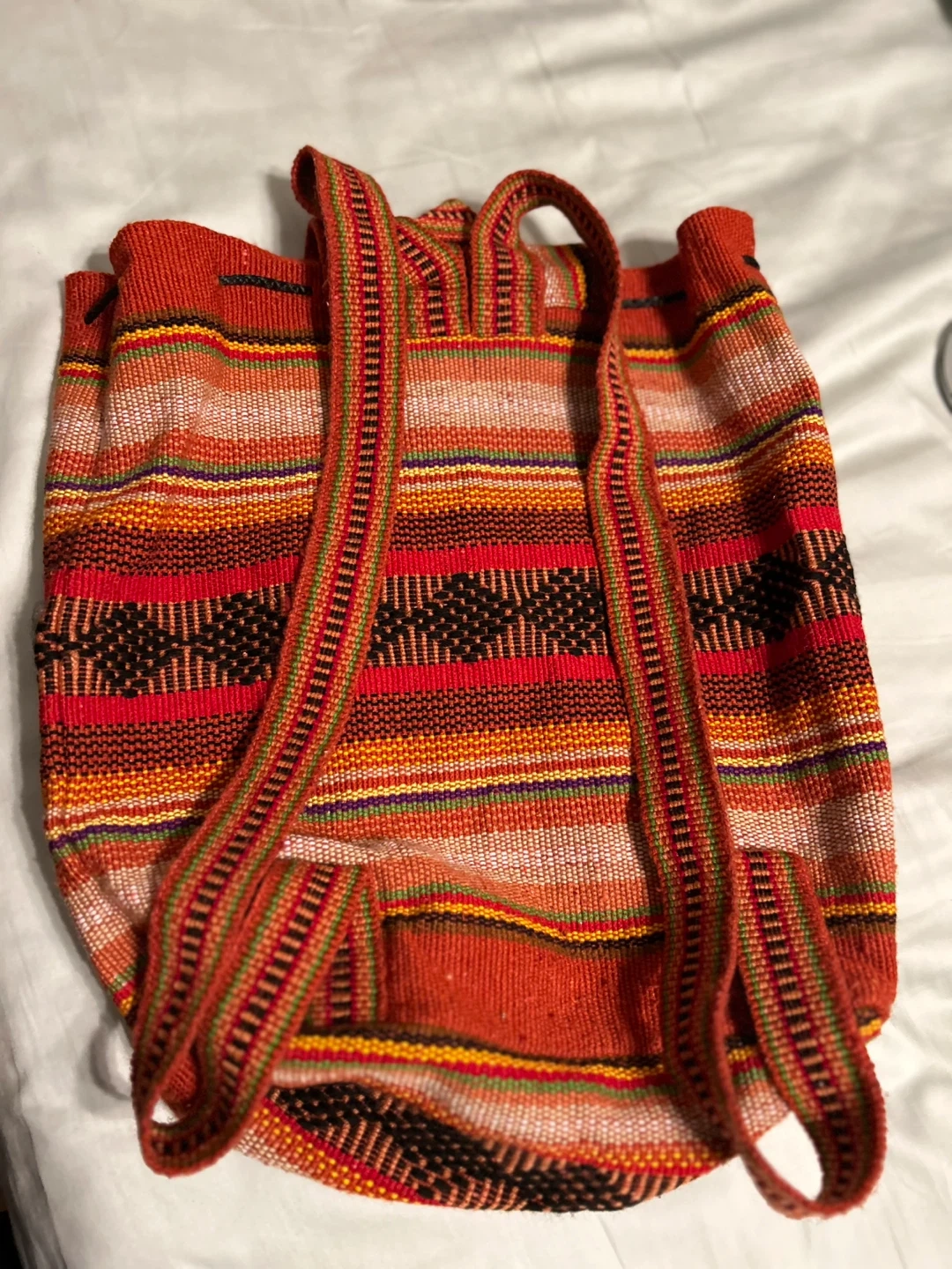 Art from México., unisex. This is a colorful striped woven backpack, perfect for carrying your essentials! It features a drawstring closure and adjustable straps. It has a unique and vibrant design with a front pocket for extra storage